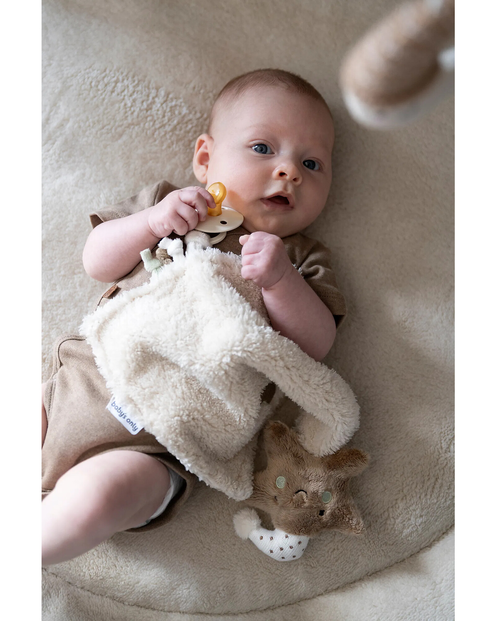 The cuddle cloth from the Heaven collection is the perfect toy for your child: soft, playful, and practical. With its loving details, it provides safety, stimulates curiosity and touch. Made in warm and neutral tones with materials such as teddy fleece, soft velvet, knit, and embroidery, it is ideal for little explorers. The little star emits a cheerful squeak, creating small moments of surprise. Easy to attach the pacifier, always within reach, and measuring 28 x 35 cm, it fits in any bag. A multi-talent for play, comfort, and relaxation, also perfect as a gift.