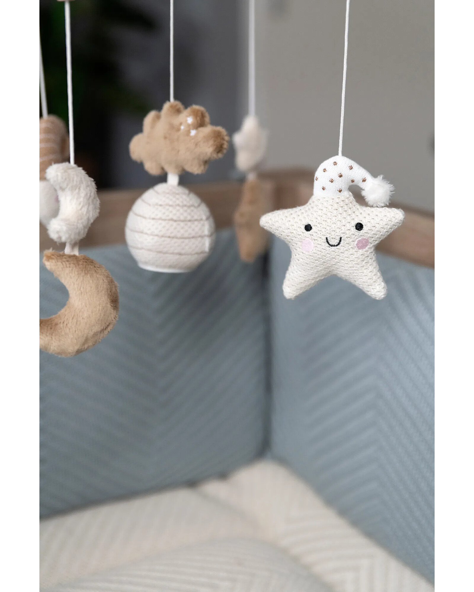 The Baby's Only Heaven Mobile in clay and warm linen combines elegant design and functionality, offering interchangeable toys that are easy to clean or replace. Each unique toy, with soft textures or small mirrors, stimulates the senses of your child. The stars and moons in calm colors create a relaxing and visually stimulating environment, while the dark contrasts support visual development in the first months. The melody of “It’s a Small World” encourages peaceful sleep. Easy to attach to a crib or playpen, it pairs perfectly with coordinated play mats, creating a harmonious nursery, serene, and cozy space for your little one.