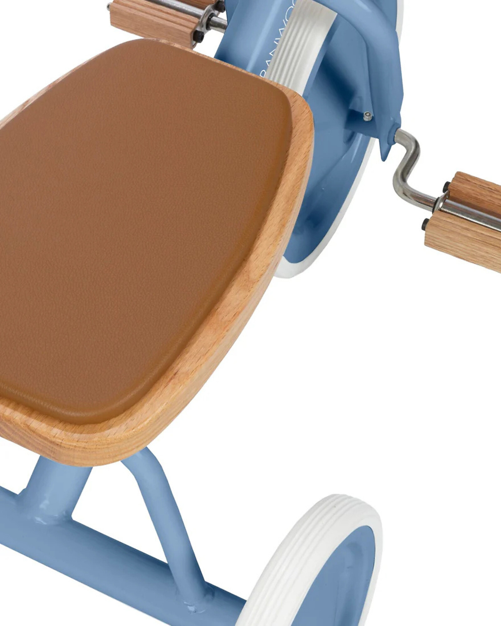 - Materials: frame: steel with colored finish; seat: oak wood with soft padding in vegan leather; tyres: rubber; grips: vegan leather; pedals: oak wood.