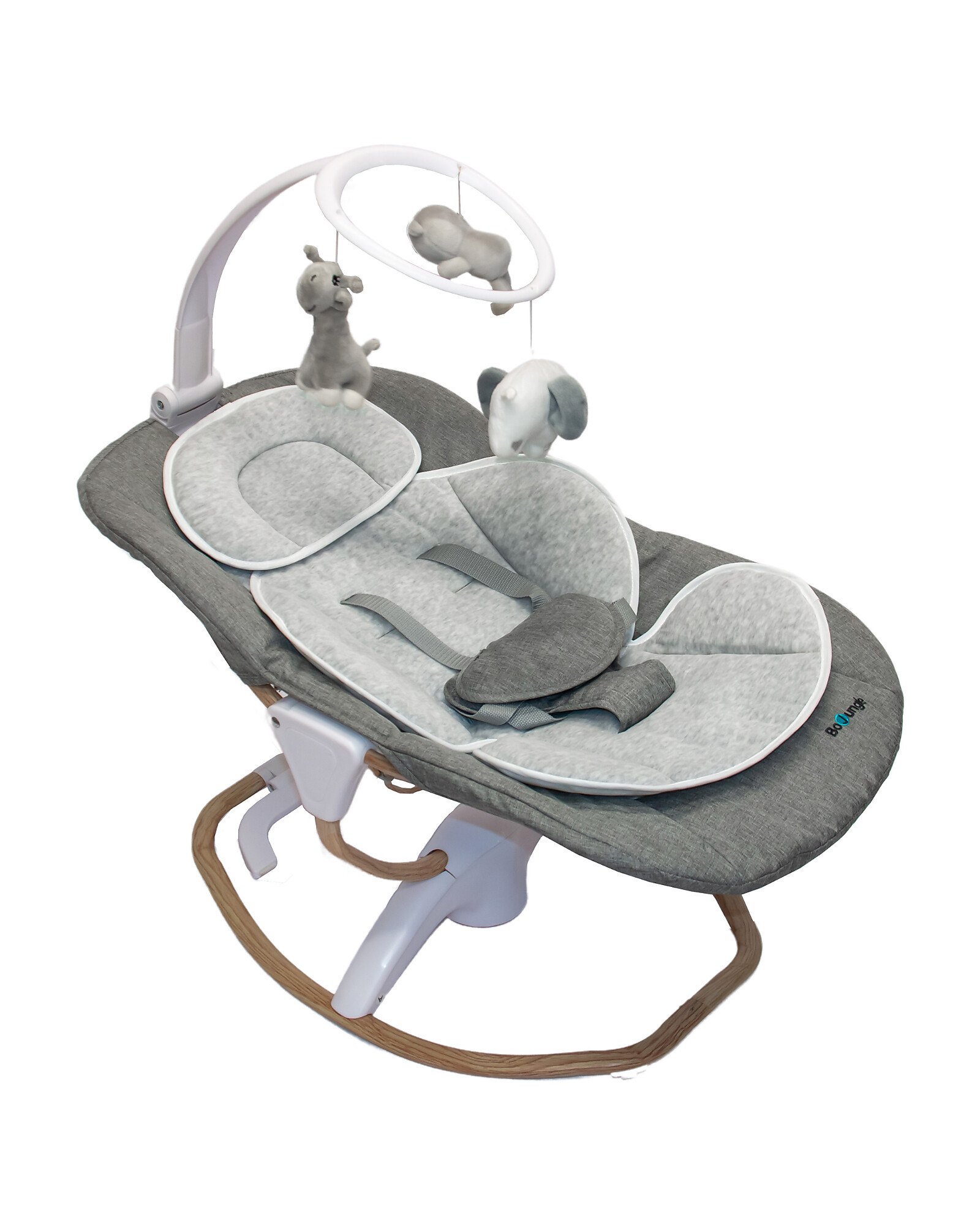 The 2-in-1 Musical Rocking Bouncer from BoJungle is ideal for rocking, relaxing, or entertaining your baby from birth. With an elegant and modern design, it combines function and style in one product. It offers 5 swing speeds, 7 movement modes, and an adjustable backrest to suit playtime or rest. The seat rotates 360°, promoting interaction with the parent from every angle.
