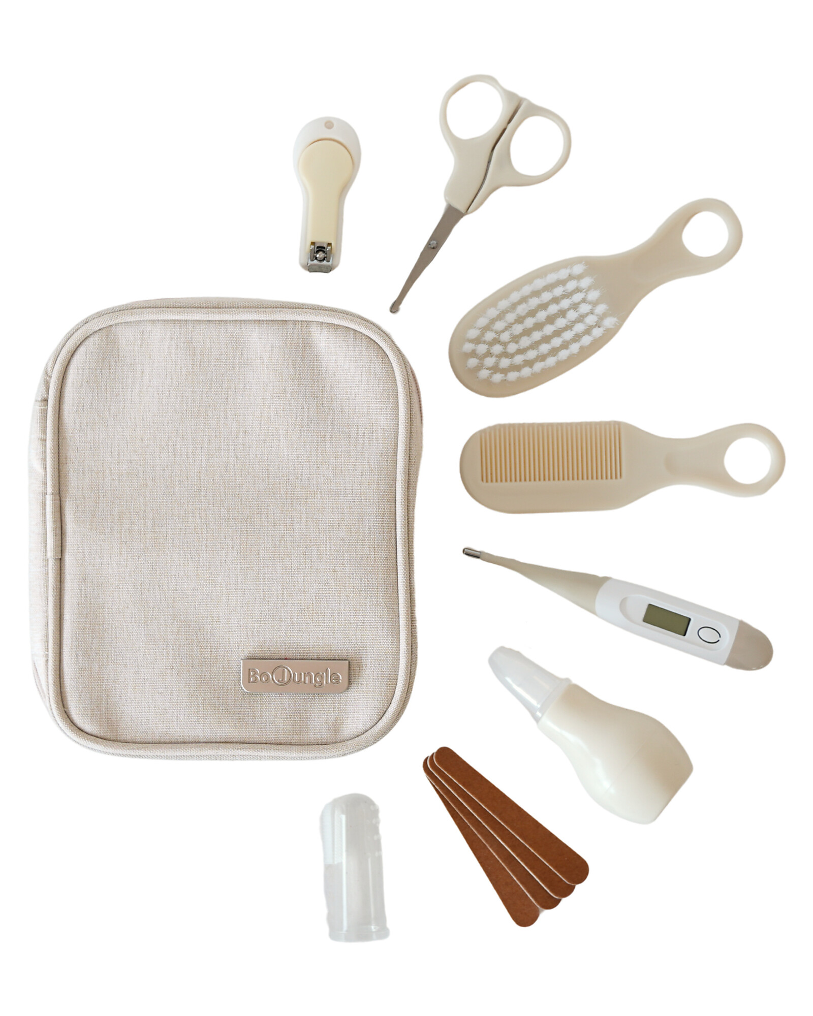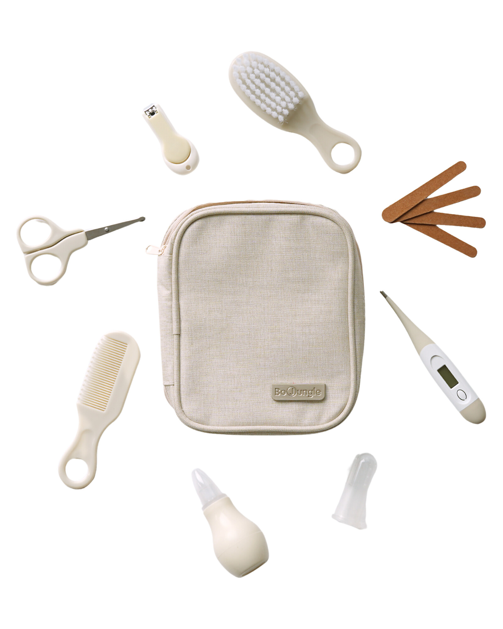 - Includes: Nail file, scissors, nail clipper, comb, soft brush, flexible digital thermometer, toothbrush, and nasal aspirator