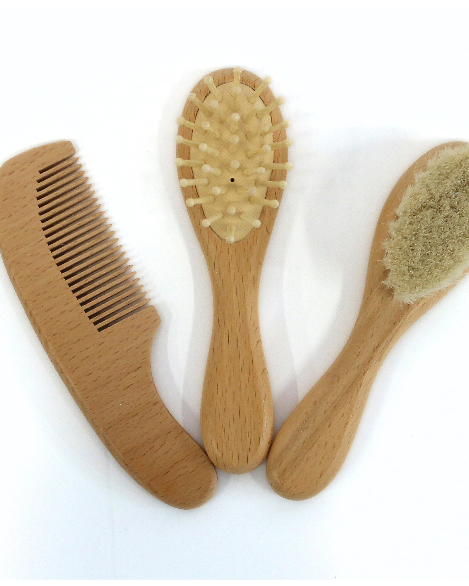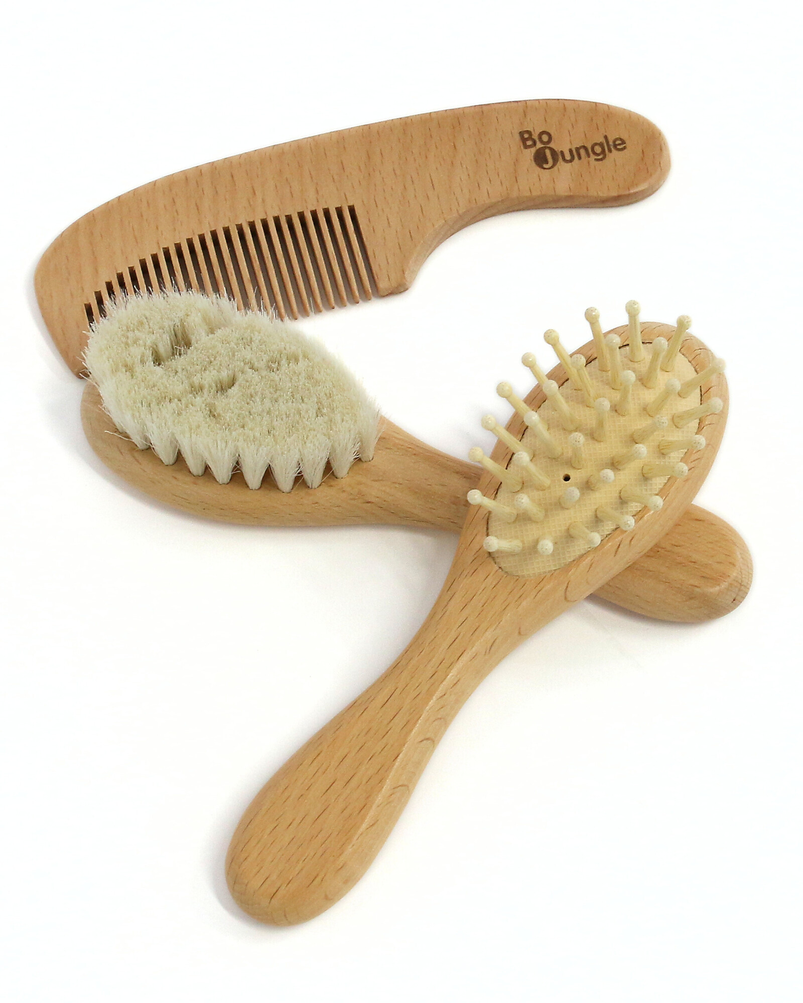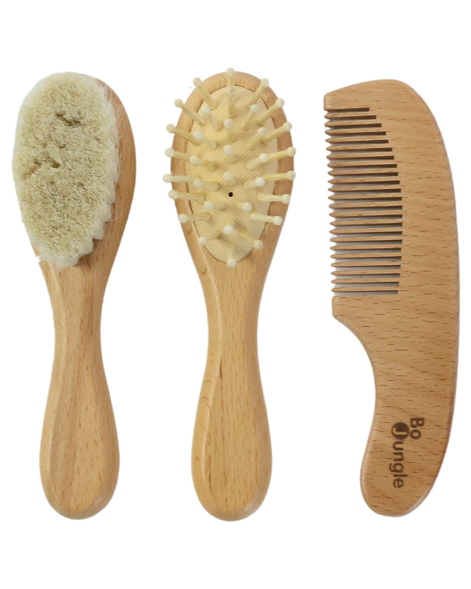The set of 3 baby brushes from BoJungle is designed to gently care for the newborn’s scalp and delicate hair. Made with smooth pearwood handles, it offers a comfortable and natural grip, easy to handle during the daily routine. The bristles, soft and natural donkey hair, are rounded at the tips to prevent scratching and irritation, gliding gently over the hair without pulling. This set includes three brushes of different sizes, suitable for various growth stages – from thin, sparse hair in the first months to slightly thicker hair later on. It is ideal for gently detangling, stimulating scalp circulation, and distributing natural oils. Thanks to the natural materials and attention to comfort, these brushes represent a safe and refined choice for your baby’s daily hair care.