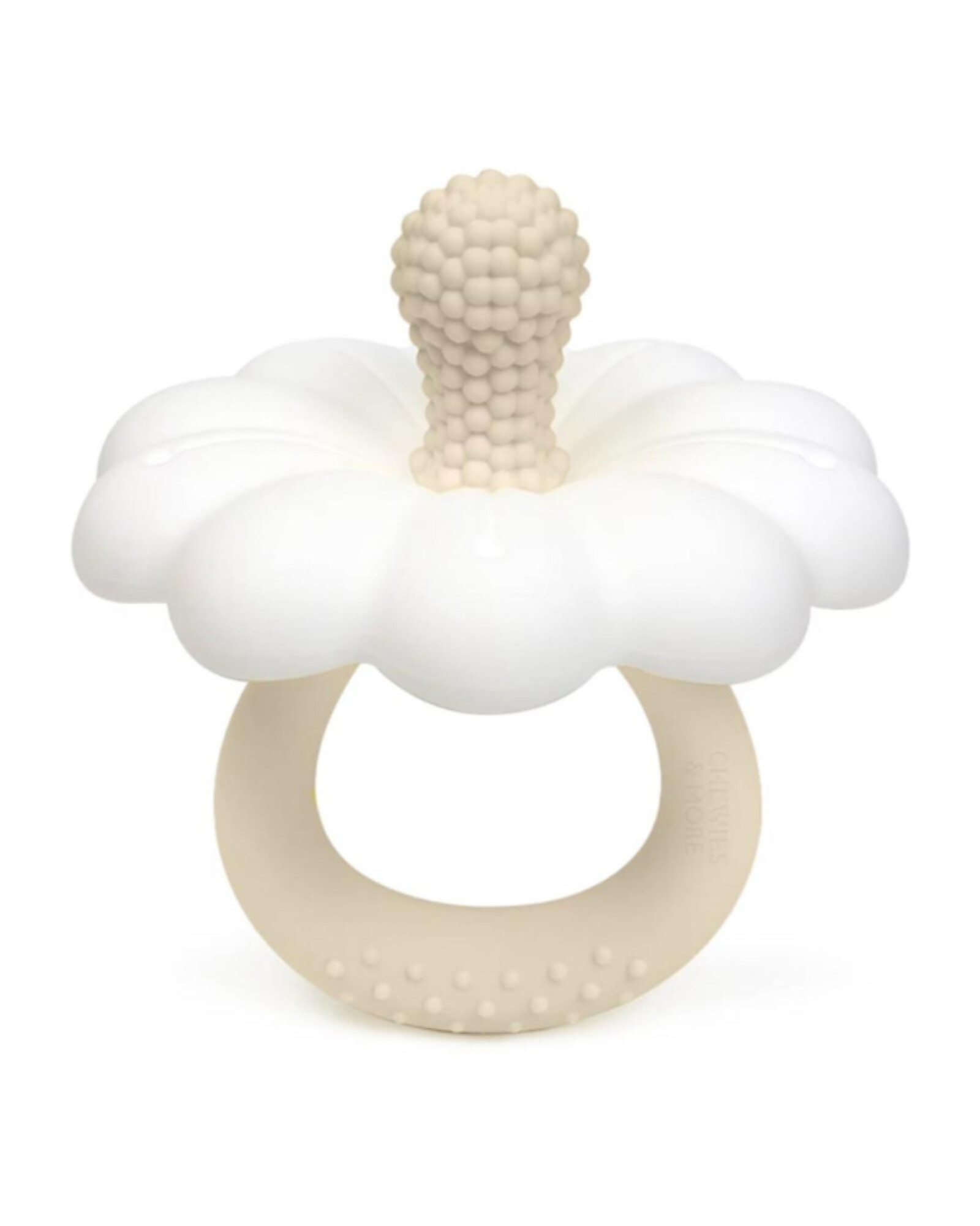 The teething ring by Chewies is a product designed to provide a safe and pleasant experience. Made entirely of food-grade silicone, a durable and soft material, it is ideal for babies developing their coordination and for the teething phase. The daisy-shaped design in beige and white gives the product a delicate and elegant appearance, perfect for little ones. The use of food-grade silicone makes the product easy to clean, durable, and free from harmful chemicals.