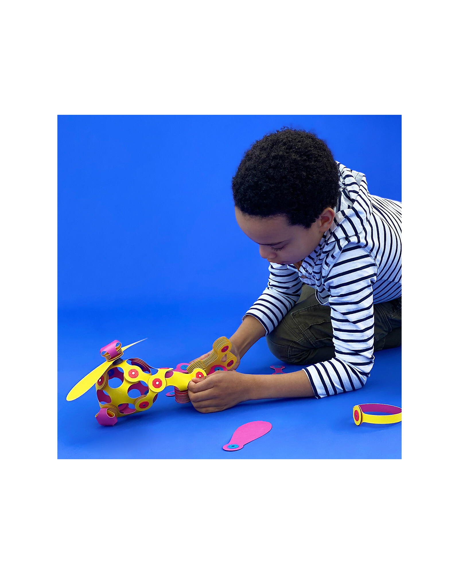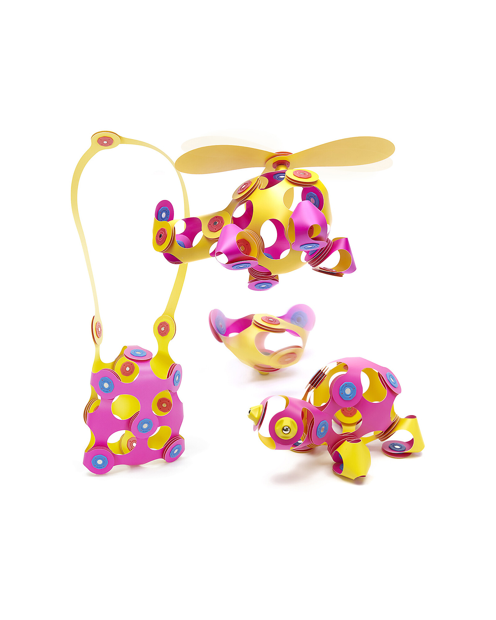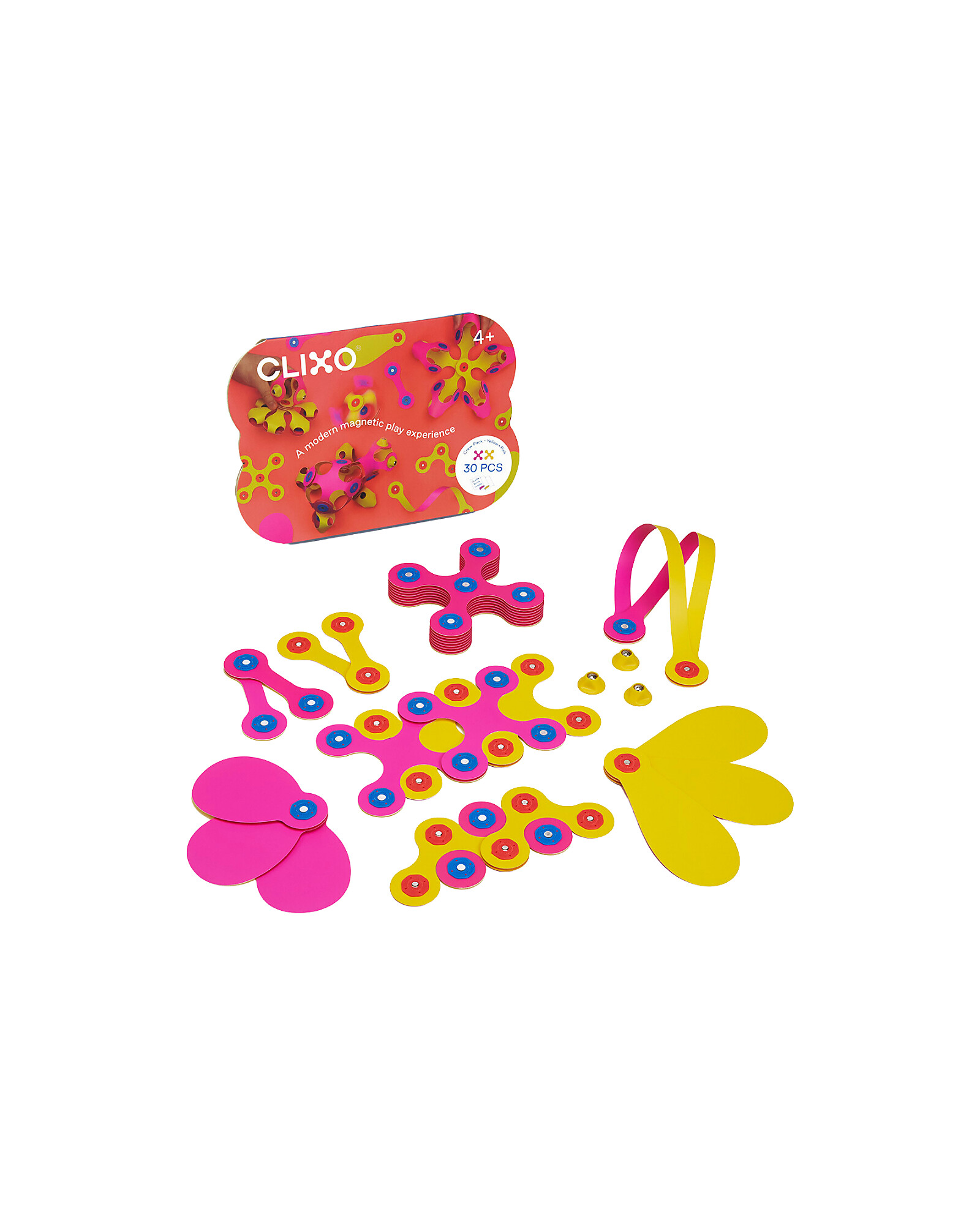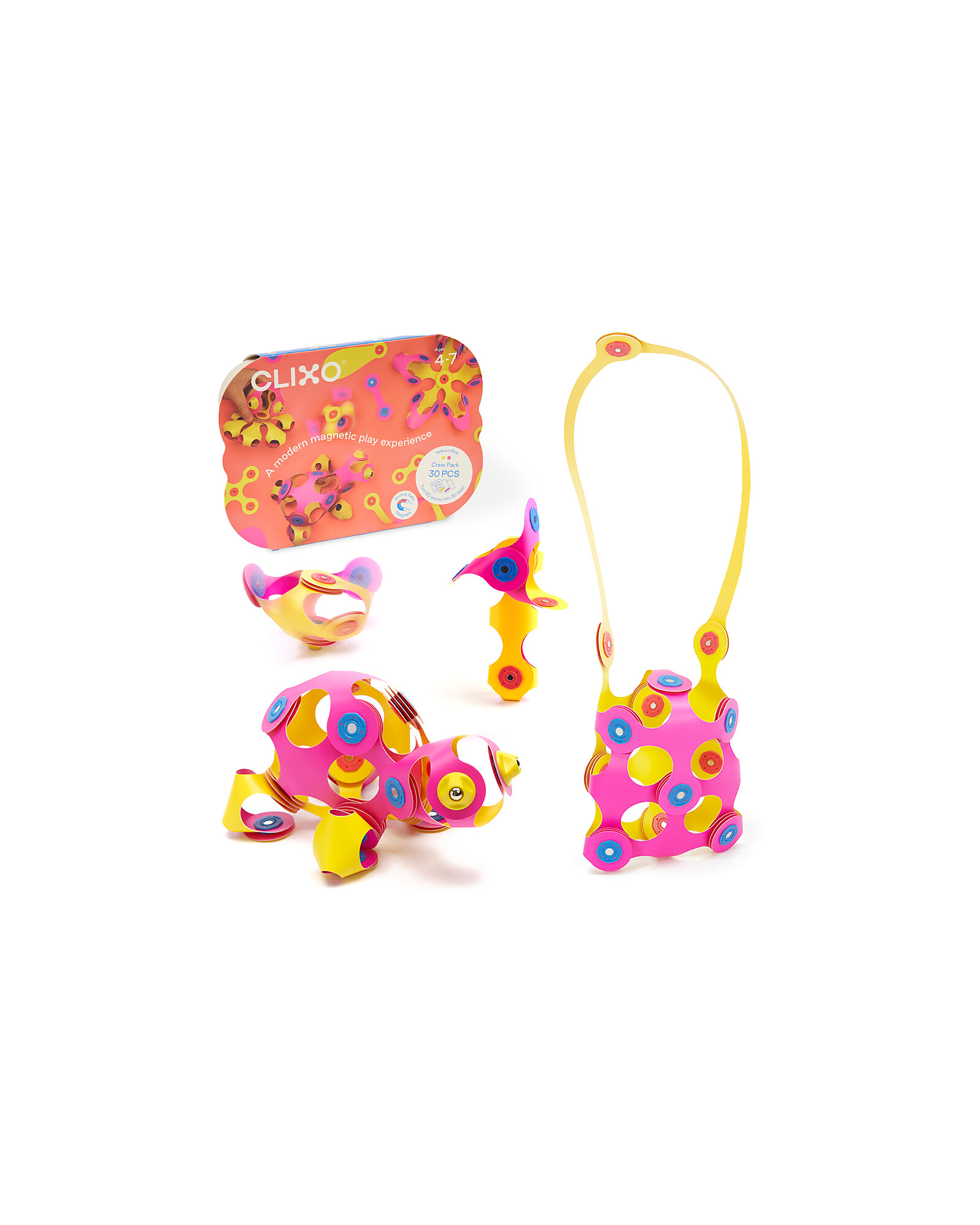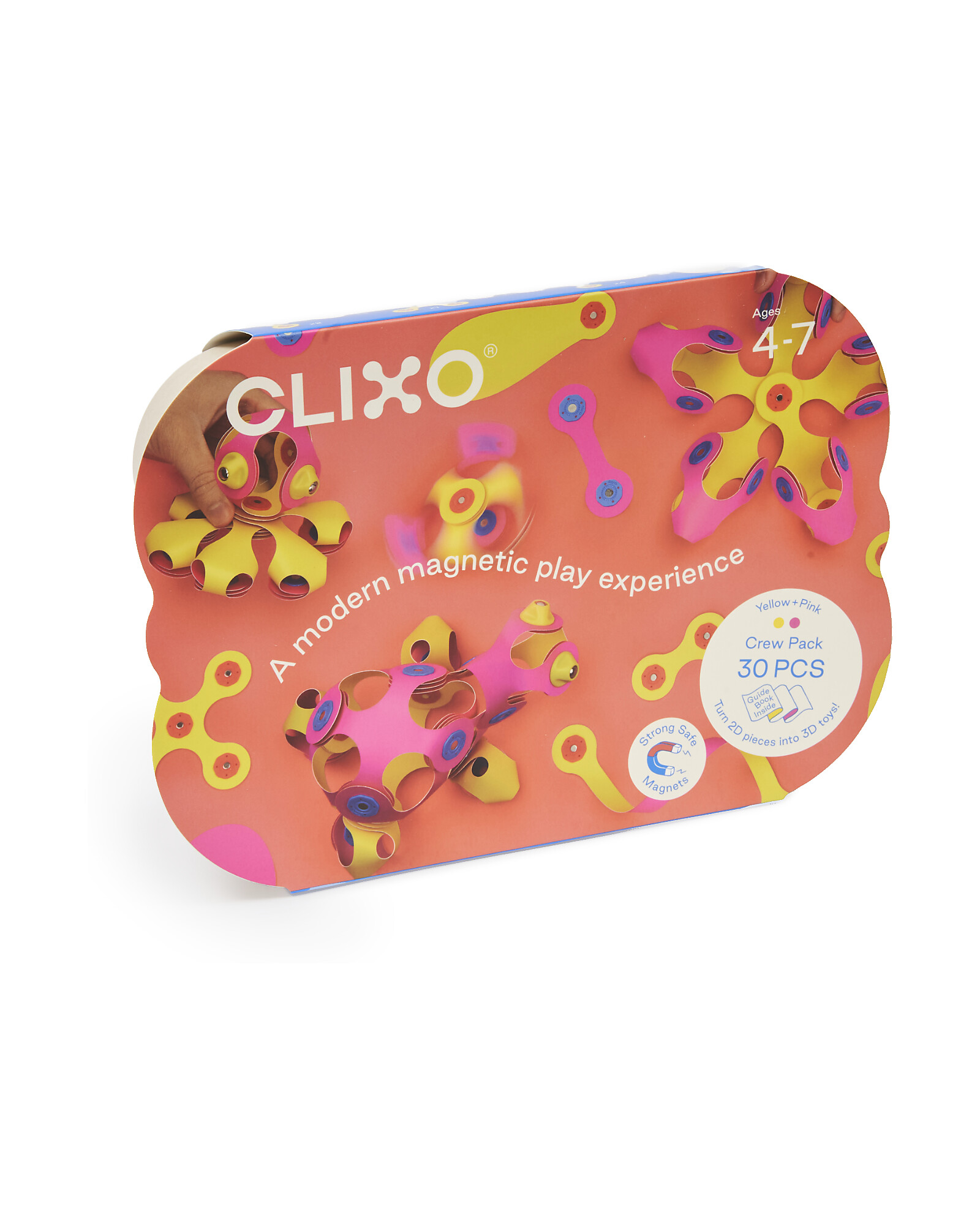 Endless possibilities to make your imagination come true, with Clixo!The Crew pack set consists of 28 pieces of various shapes, from which you can create countless colorful 3D designs, just a simple click and the powerful magnets will do the rest. Made of recyclable synthetic paper, it has magnets at its ends that will allow you to make shapes on shapes! With the 2 spinners included you will add a fun touch to the game, increasing the creative possibilities! It is also dishwasher safe! A versatile and colorful toy, which encourages STEAM learning, approaching scientific, artistic and mathematical disciplines through play. You can always carry it with you because Clixo is a compact, light toy that fits in your hand!