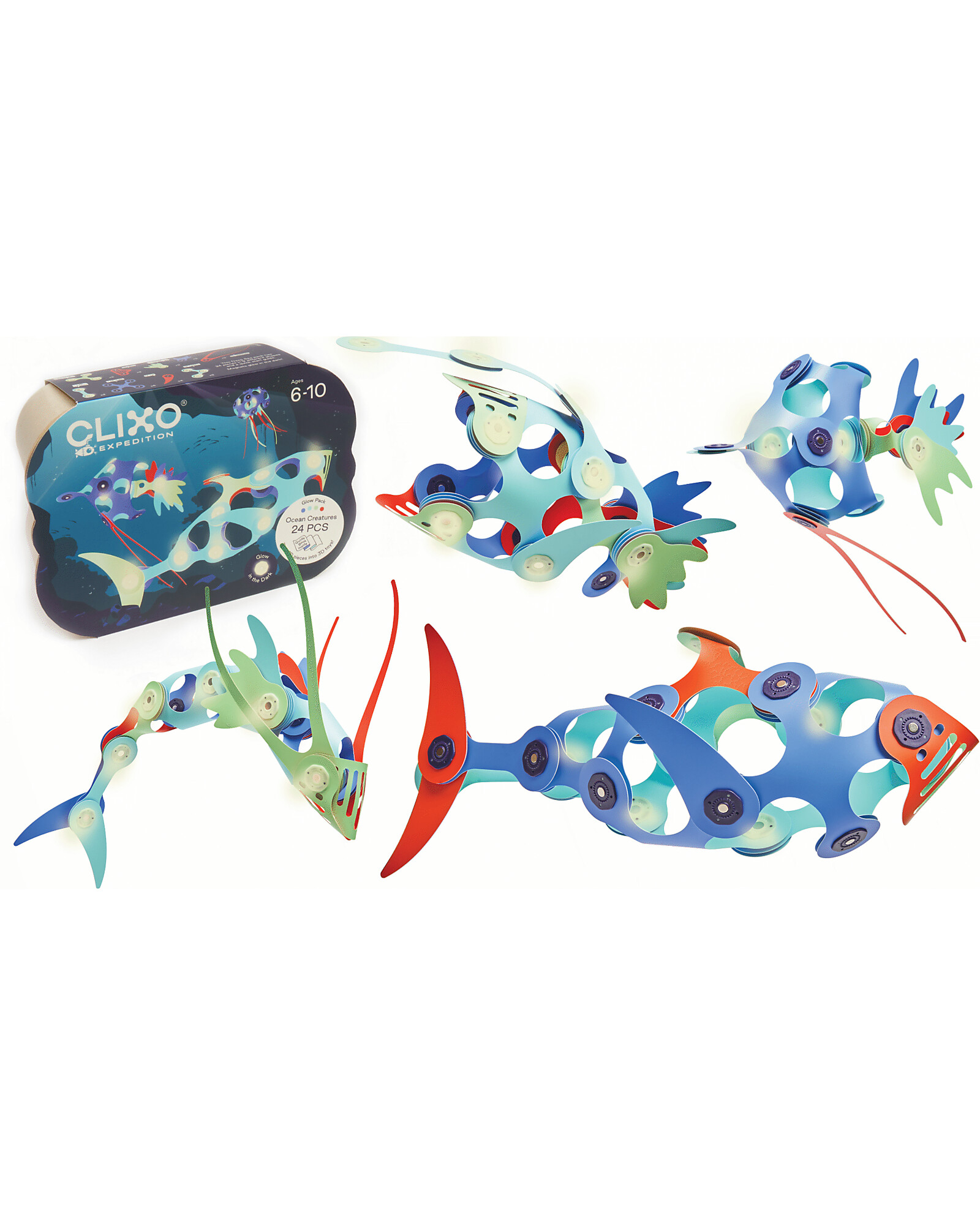 Endless possibilities to make your imagination real, with Clixo! The Ocean Creature set consists of 24 pieces from which you can create countless 3D shapes: just a simple click and the powerful magnets will do the rest. What's more, the pieces light up in the dark! Inspired by sustainability, it is made of recyclable synthetic paper and has magnets at its ends that will allow you to make shapes upon shapes! It is also dishwasher safe! A versatile and colourful toy that encourages STEAM learning, the approach to scientific, artistic and mathematical disciplines through play. You can take it with you at all times, because Clixo is a compact, lightweight toy that fits in your hand!