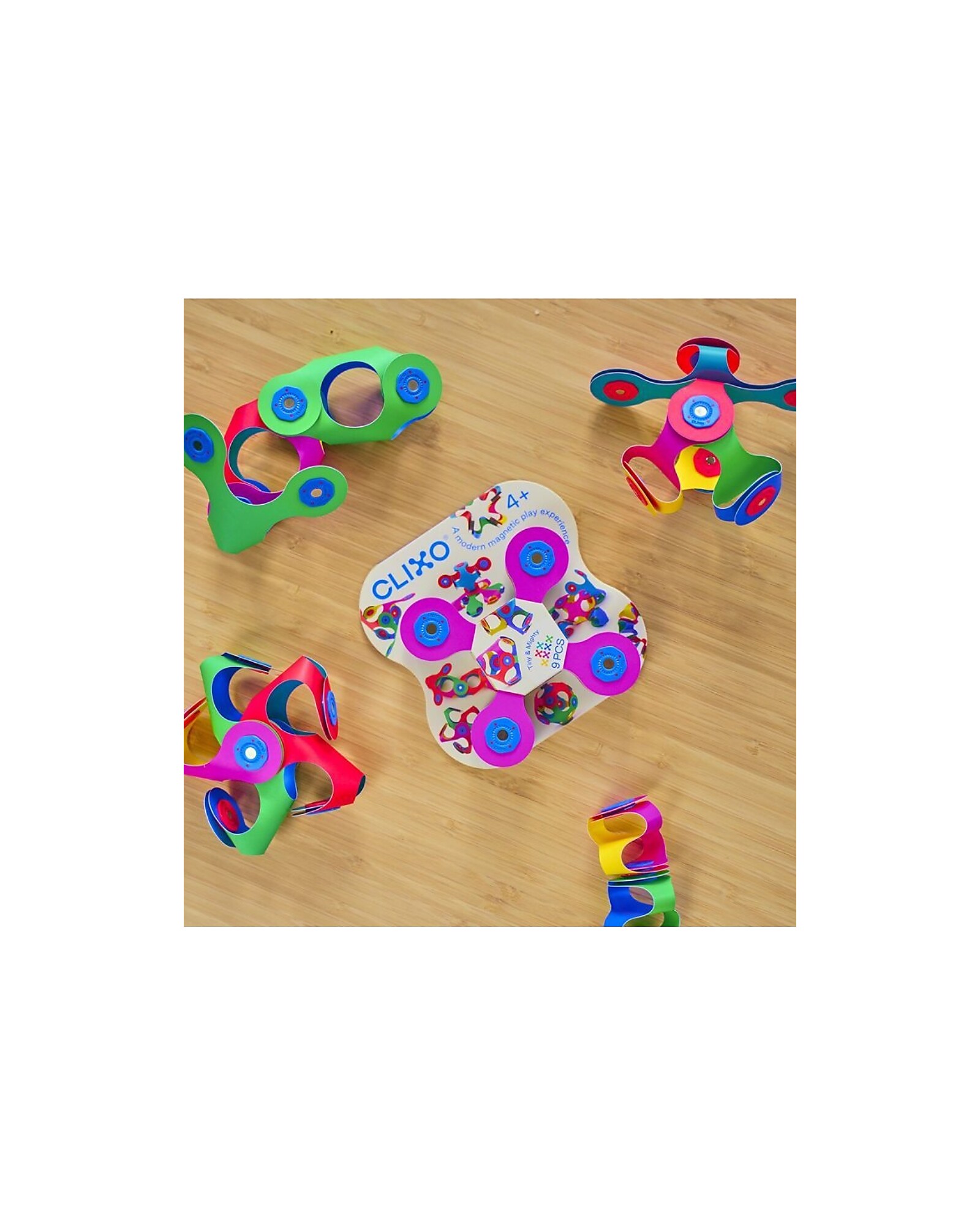 Endless possibilities to make your imagination come true, with Clixo! The Tiny&Mighty set consists of nine pieces in the characteristic Quad shape, from which you can create countless colorful 3D shapes, just a simple click and the powerful magnets will do the rest. Made of recyclable synthetic paper, it has magnets at its ends that will allow you to make shapes on shapes! It is also dishwasher safe! A versatile and colorful toy, which encourages STEAM learning, approaching scientific, artistic and mathematical disciplines through play. You can always carry it with you because Clixo is a compact, light toy that fits in your hand!