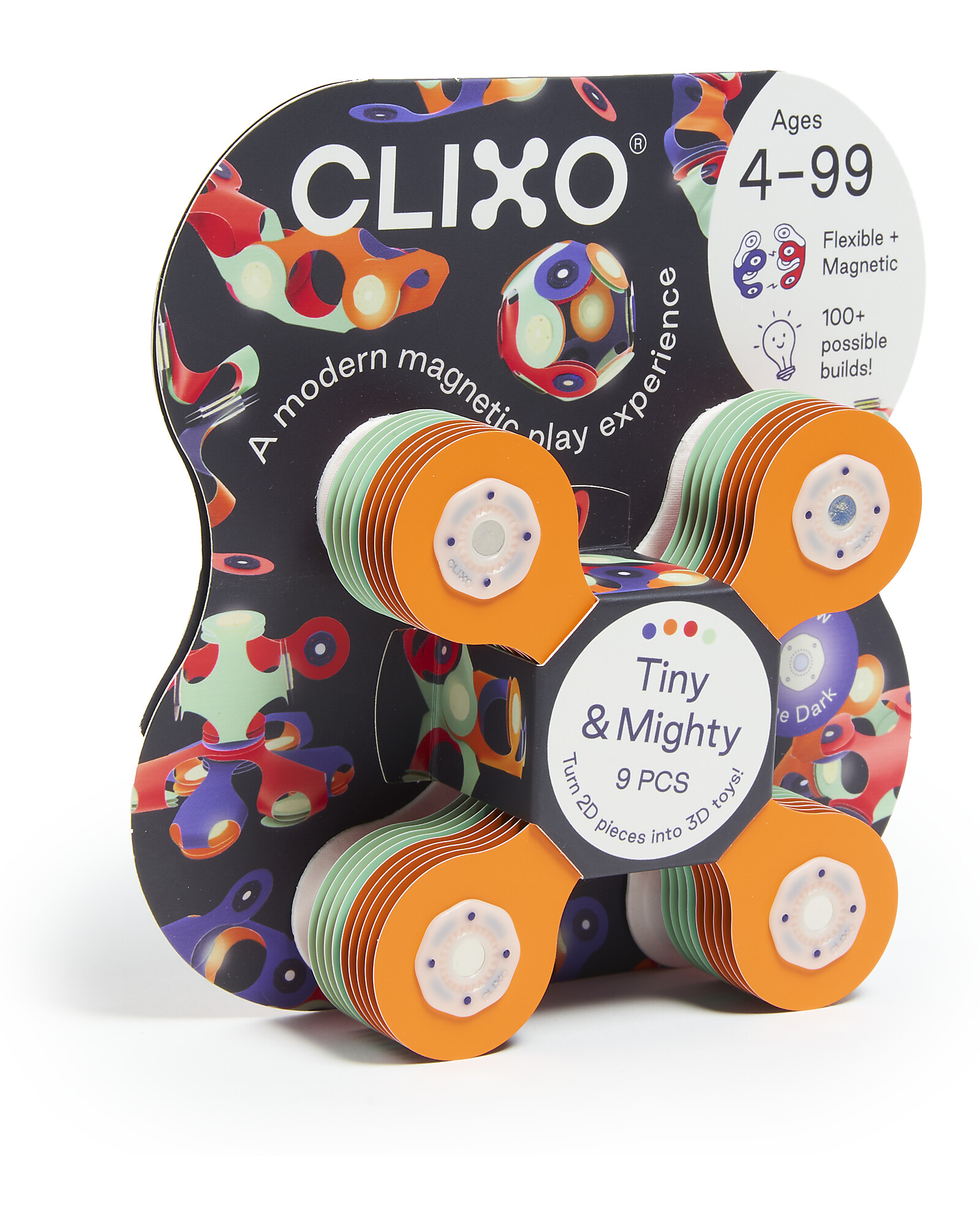 Endless possibilities to make your imagination come true, with Clixo! The Tiny&Mighty set consists of nine pieces in the characteristic Quad shape, from which you can create countless colorful 3D shapes, just a simple click and the powerful magnets will do the rest. Made of recyclable synthetic paper, it has magnets at its ends that will allow you to make shapes on shapes! It is also dishwasher safe! A versatile and colorful toy, which encourages STEAM learning, approaching scientific, artistic and mathematical disciplines through play. You can always carry it with you because Clixo is a compact, light toy that fits in your hand!