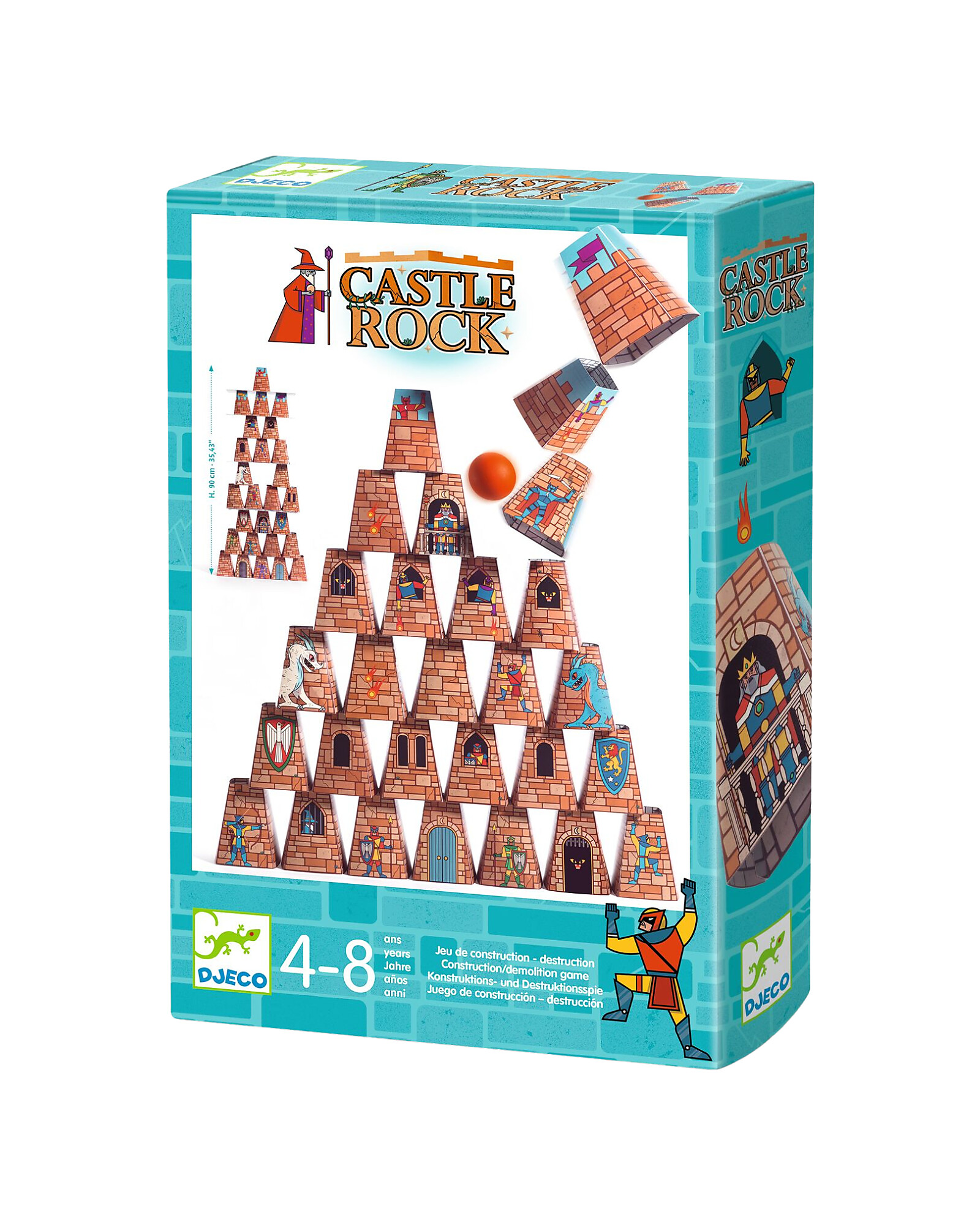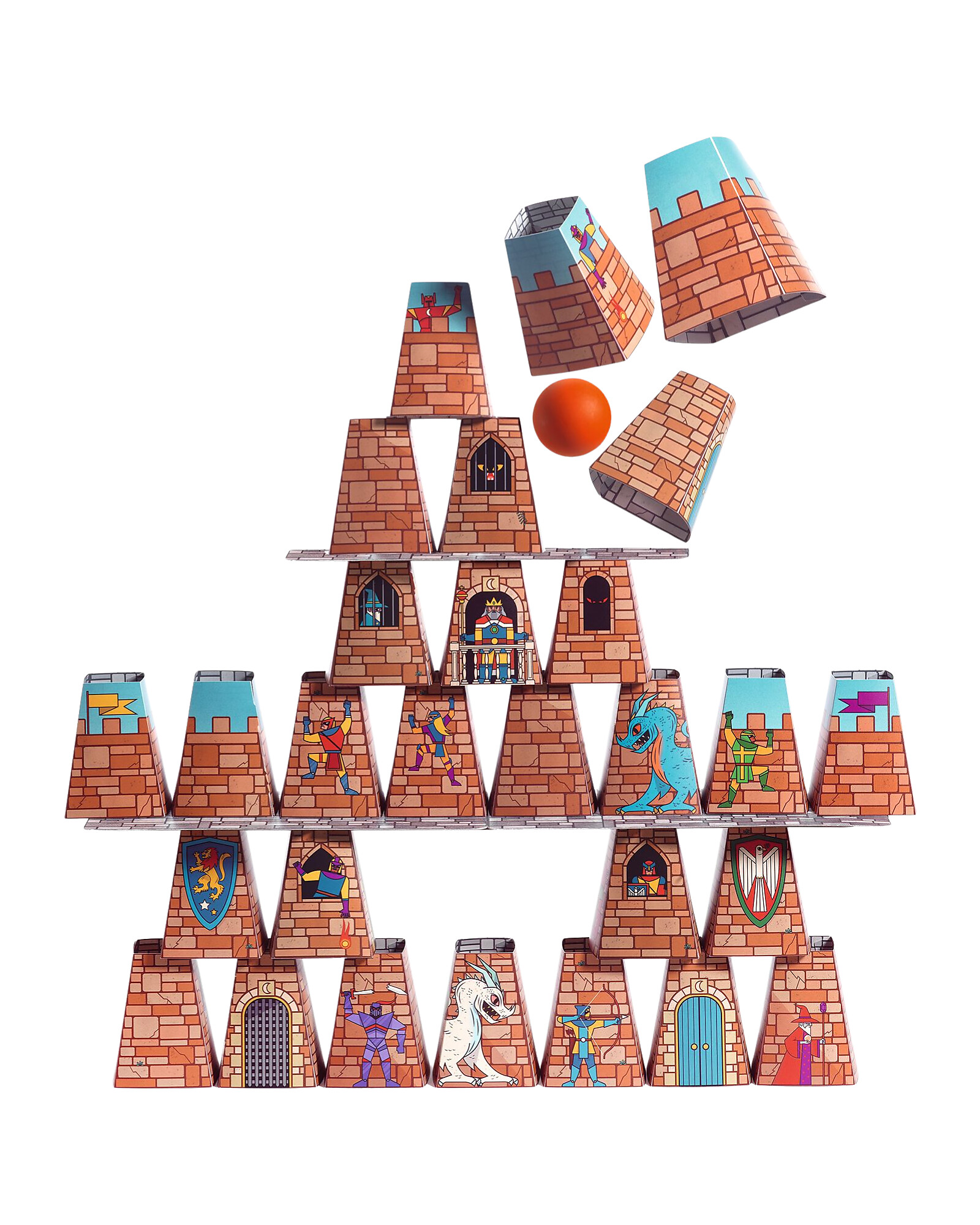 Castle Challenge is a 2-in-1 game, both a building game and a knock-down game.