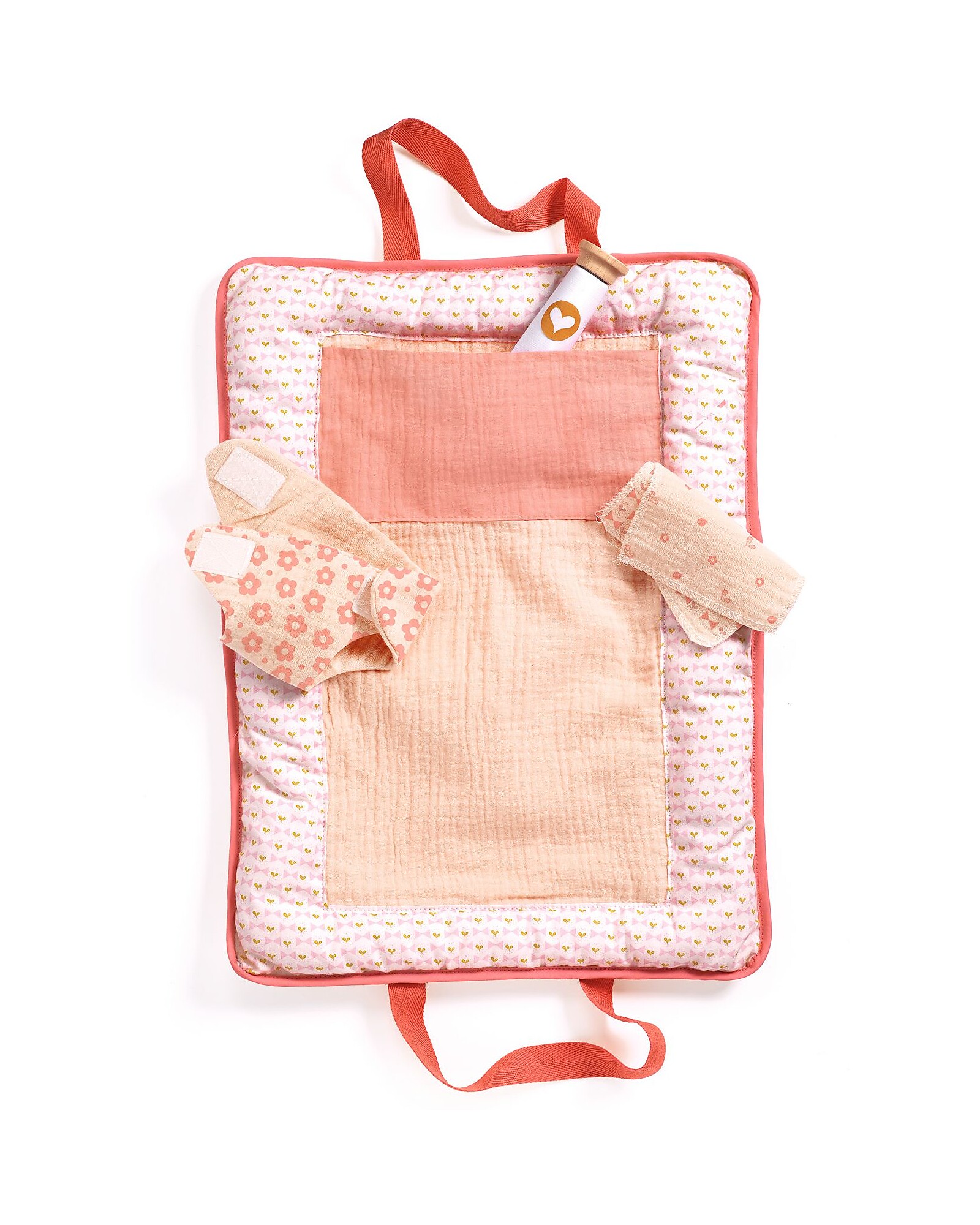 Pomea Pink Changing Set for Dolls, an essential accessory for doll play. It’s changing time! This set includes everything needed for the perfect diaper change: changing mat, cream, diaper, and wipes.