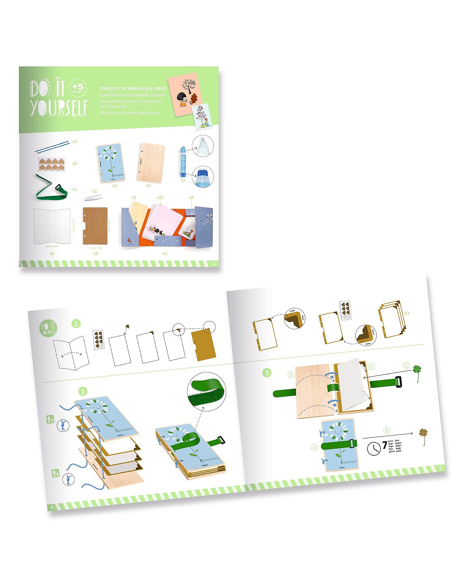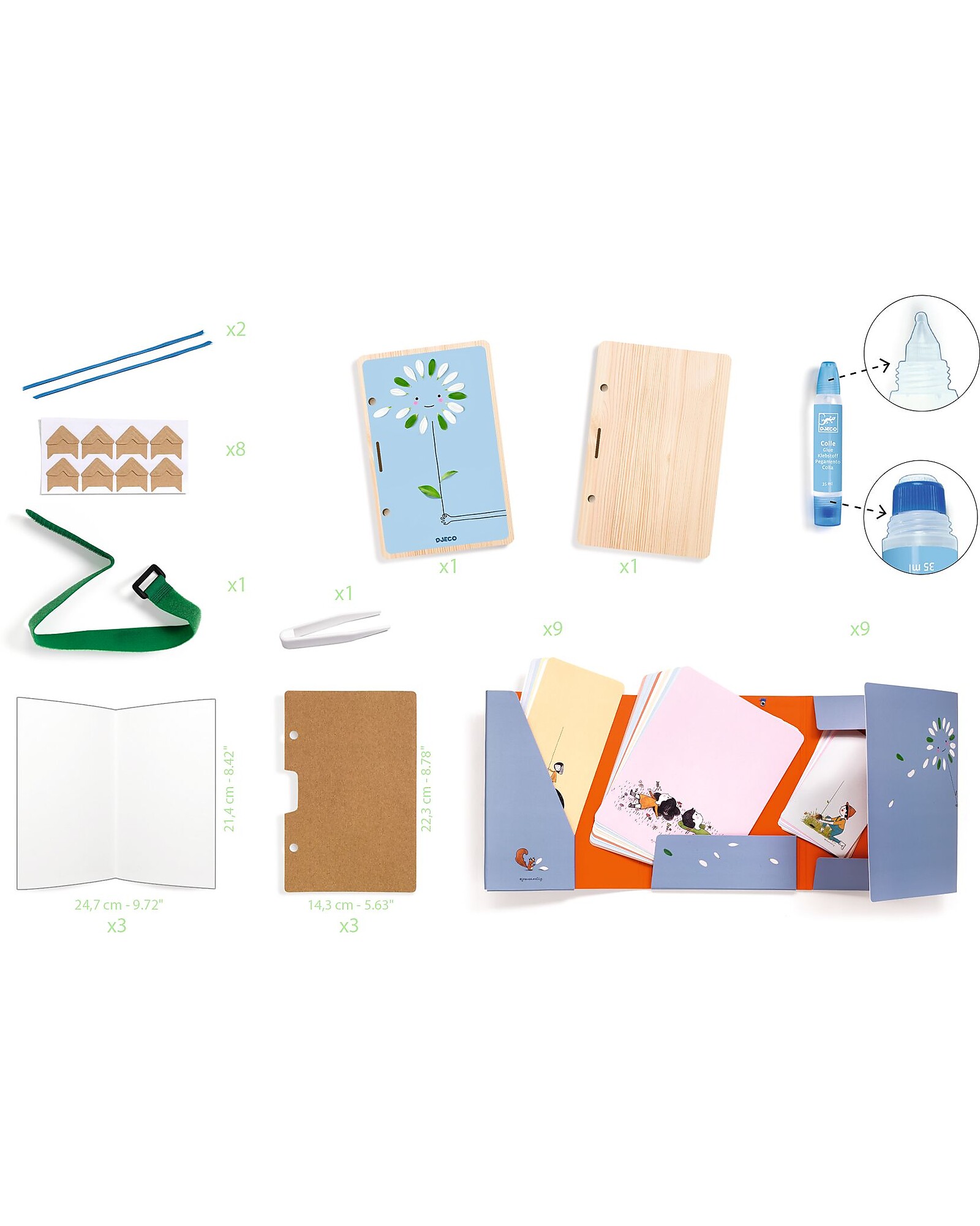 - The box includes: 1 wooden press to assemble (2 illustrated and perforated wooden boards, 1 Velcro strap, 3 cardboard boards, 8 corner stickers, 3 sheets of paper, 2 rubber bands), 1 illustrated storage pouch, 12 illustrated tables ( 18.5 x 23.5 cm), 9 large cards (10.5 x 25 cm), 9 small cards (10 x 15 cm), 1 tube of double-ended liquid glue (a wide end and a precision end to facilitate the collage activity) and a notice guiding the child step by step in all the stages of its creation.