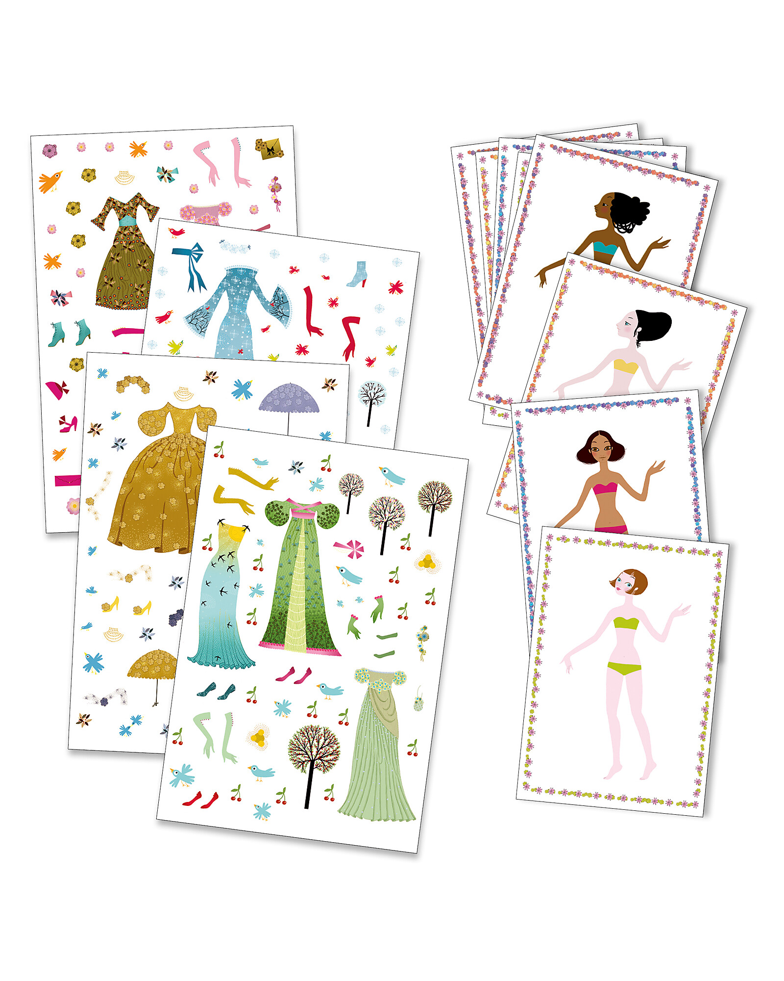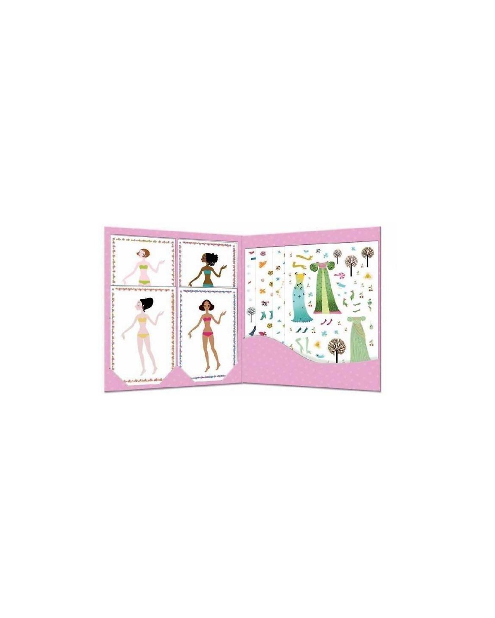 With the Doll Stickers Kit for Djeco you bring home endless fun! Dress the 8 model cards with reusable stickers, which stick and detach, and create new and creative combinations. Use the elegant clothes and accessories of the 4 sheets of stickers to create endless combinations of dresses for your personal and exclusive fashion collection. Once finished playing you can store the stickers in the practical and comfortable.