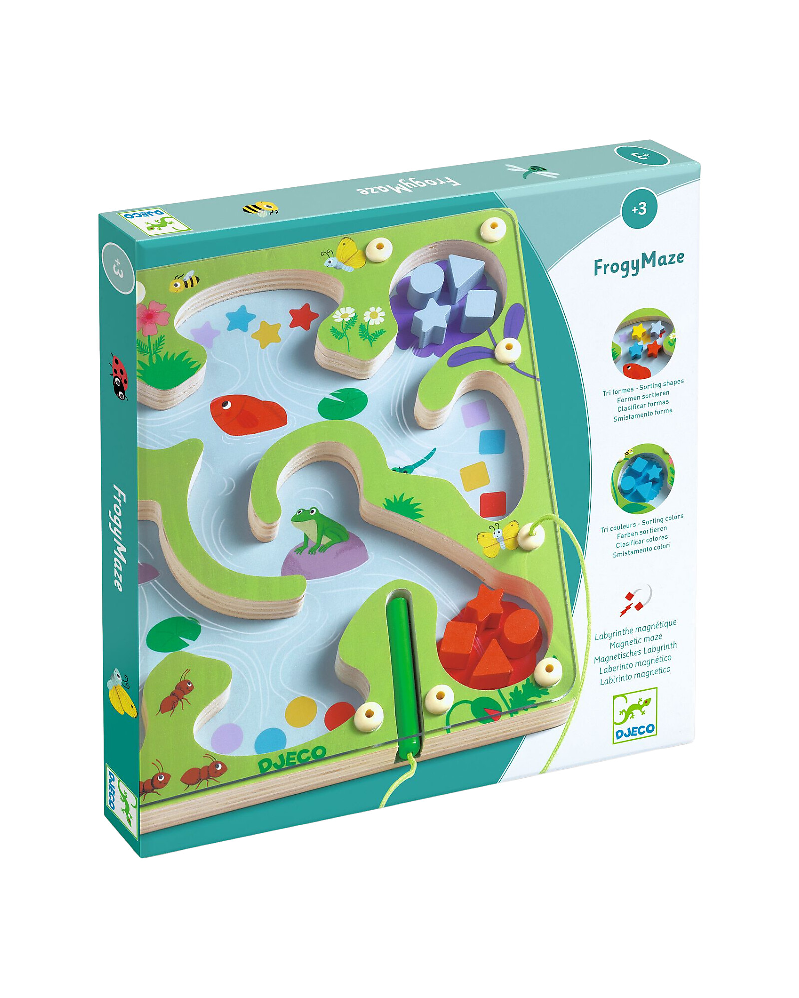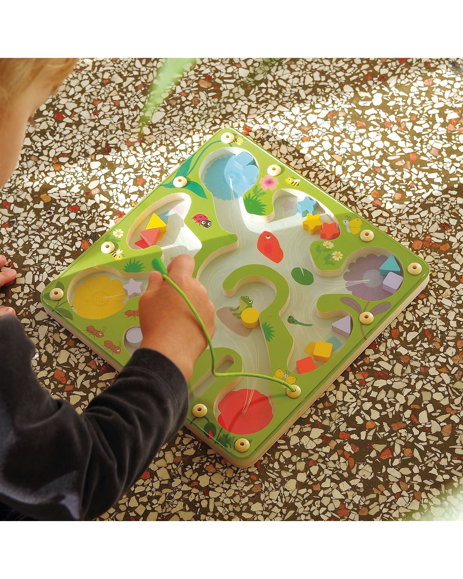 The Djeco FrogyMaze Magnetic Labyrinth is a perfect travel game for little explorers aged 3 and up. With the magnetic pen, children guide the 16 FSC® wooden pieces through the maze, placing them in the 8 slots according to colors and shapes. The colorful flowers help identify the correct destination right away, turning each path into a fun and educational challenge. Ideal for developing hand-eye coordination, logic, and visual recognition. Compact and durable, it’s the perfect companion for playing anywhere with imagination and focus.