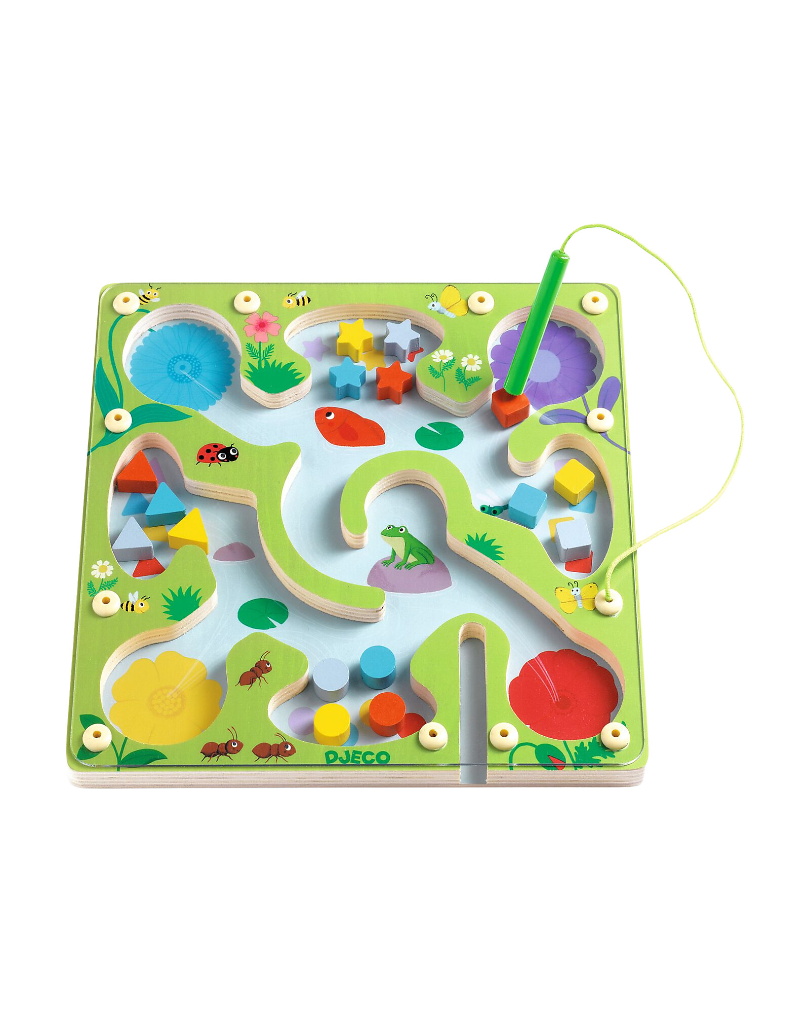 The Djeco FrogyMaze Magnetic Labyrinth is a perfect travel game for little explorers aged 3 and up. With the magnetic pen, children guide the 16 FSC® wooden pieces through the maze, placing them in the 8 slots according to colors and shapes. The colorful flowers help identify the correct destination right away, turning each path into a fun and educational challenge. Ideal for developing hand-eye coordination, logic, and visual recognition. Compact and durable, it’s the perfect companion for playing anywhere with imagination and focus.
