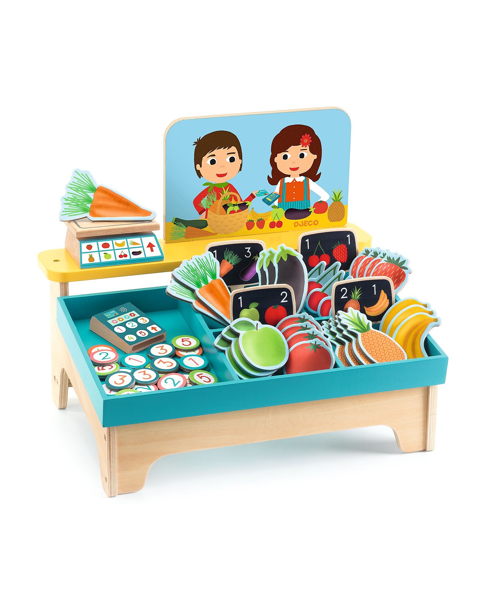 - Includes: 1 market stand, 1 scale, 1 card payment machine, 1 card, 30 coins, 4 price signs in chalkboard style, 29 fruits and vegetables, 1 bag
