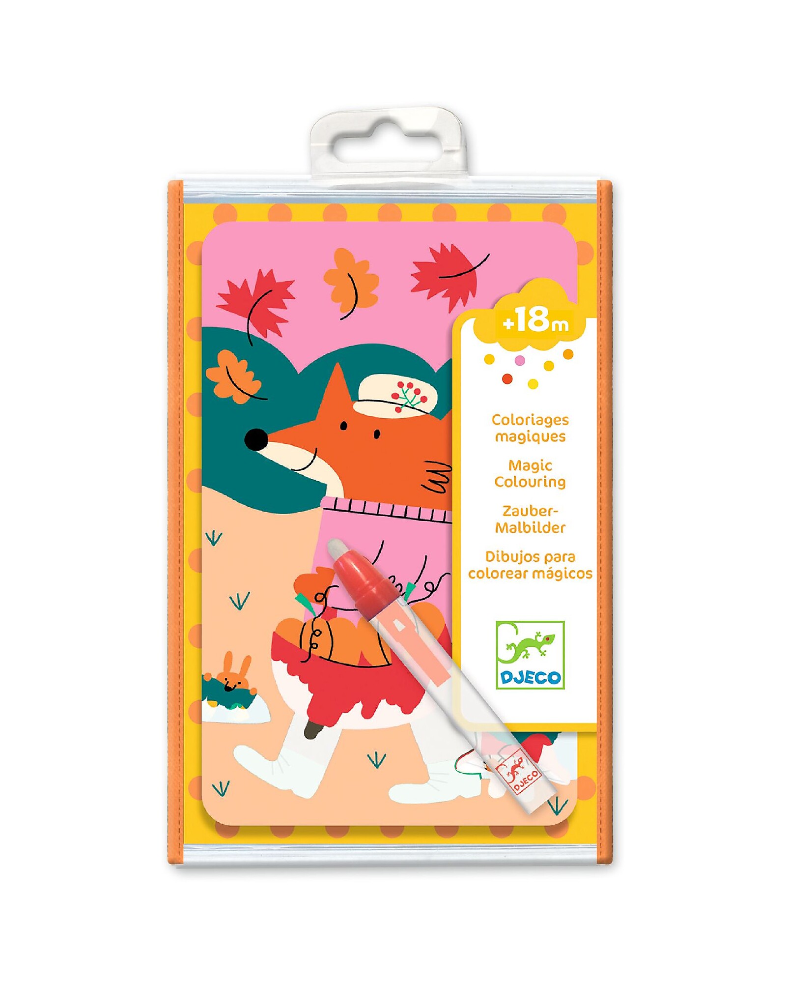 A water-based coloring book suitable for children aged 18 months and up. The child colors the white areas with the water marker to reveal what’s hidden underneath. It’s like magic — patterns appear and colors change! Once the pages dry, the child can start all over again!