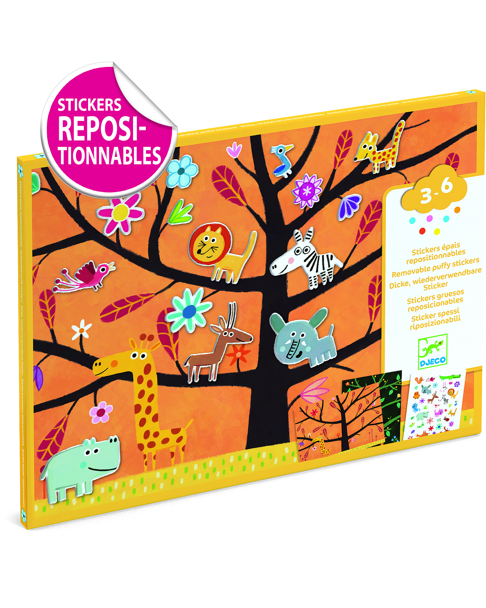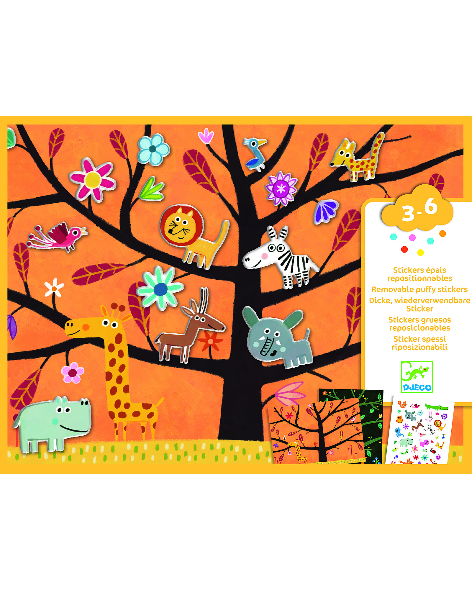 The Djeco Puffy Stickers Off-Ground Tag! set includes super squishy 3D stickers on two sheets. These puffy stickers are perfect for tiny hands because they can peel and place them all by themselves. Great for decorating anything they can reach! This set comes with 2 different tree backgrounds to decorate- day and night!