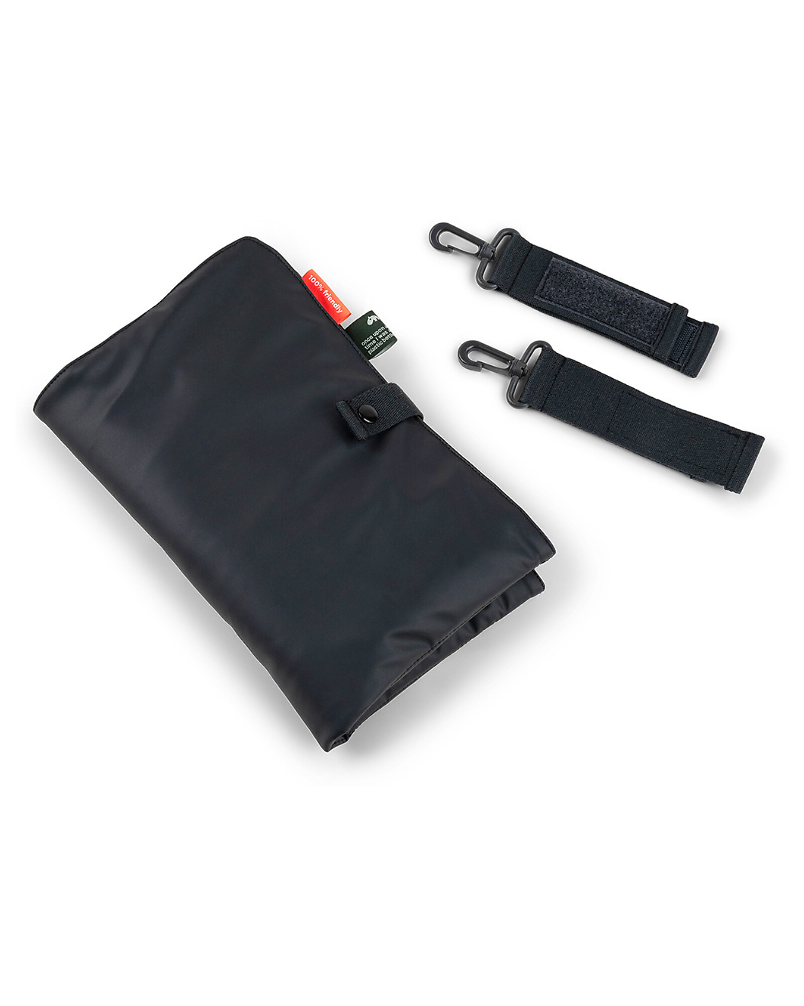 The bag has an internal thermal pocket to keep a bottle both warm and cold, is waterproof and are made from 100% recycled polyester from a total of 48 PET bottles. The straps on the outside make it easy to attach the bag to the stroller.