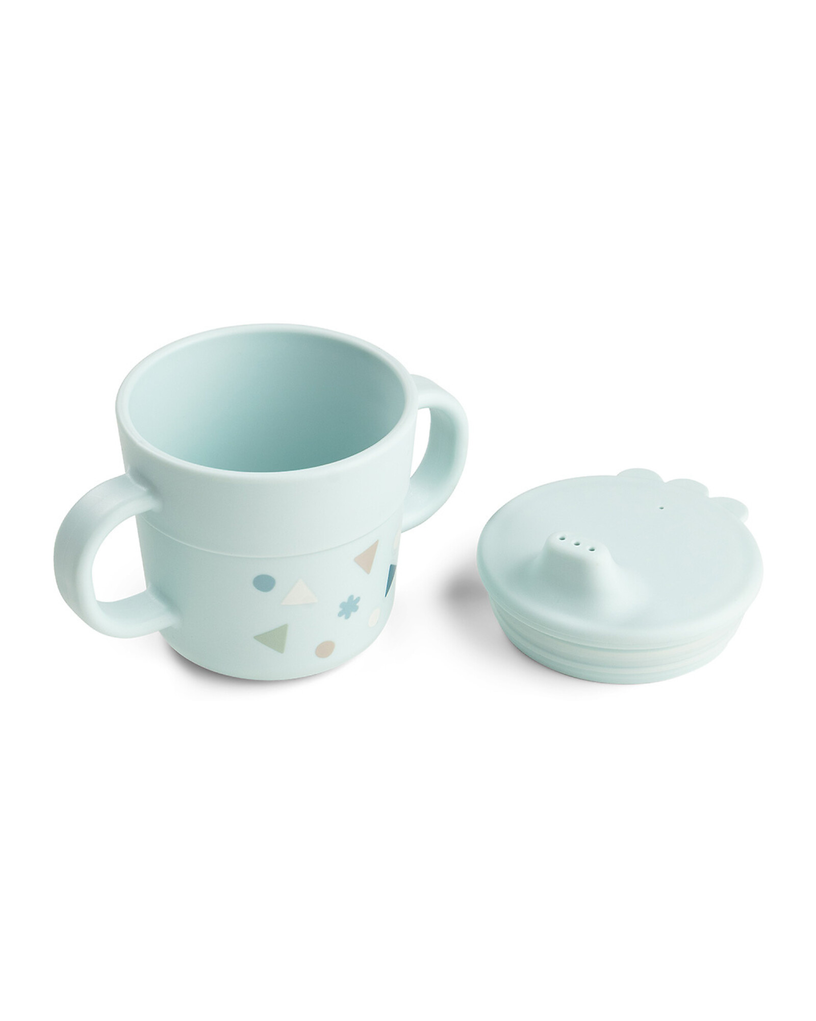 - The cup with spout and two handles offers a secure grip and encourages independent sipping