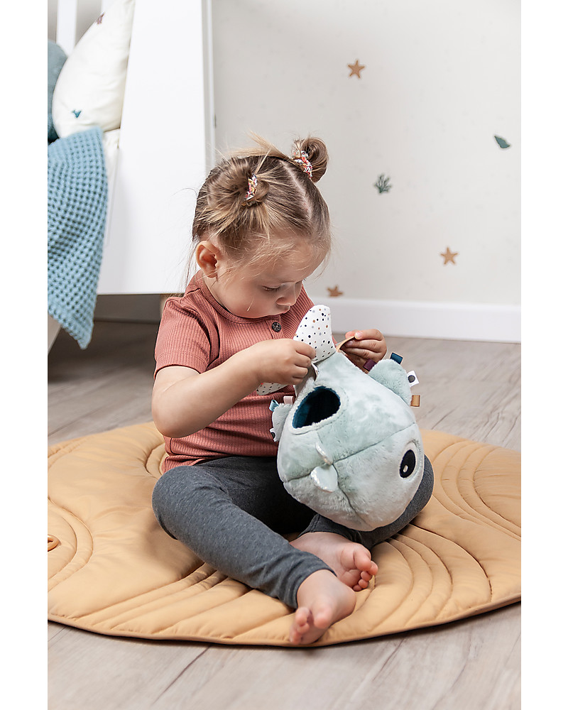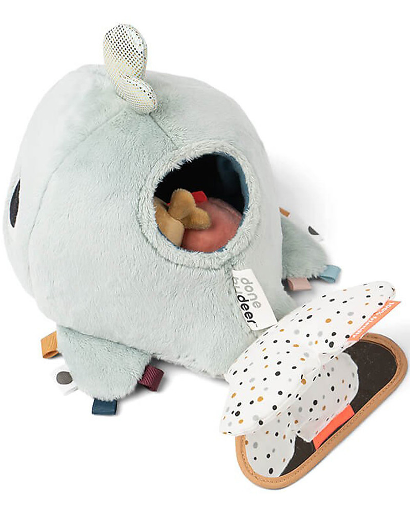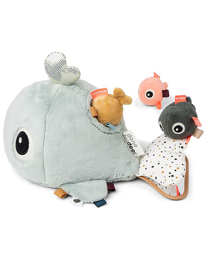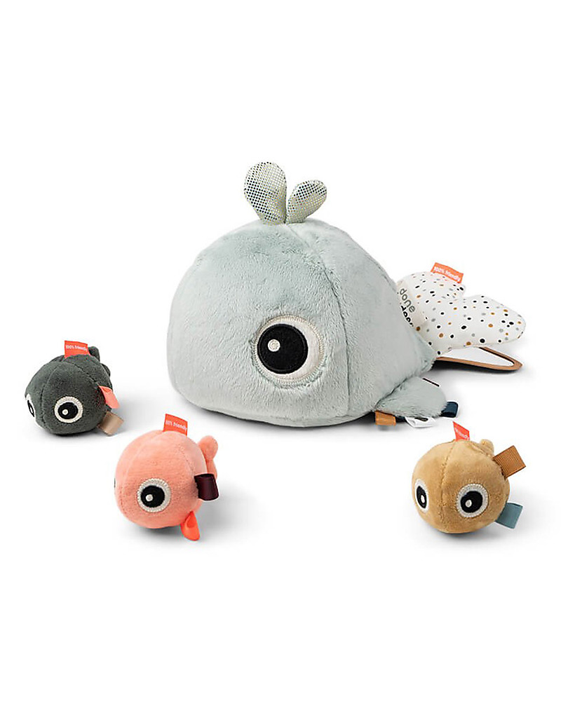 The hide and seek activity toy will entertain toddlers, while developing their concentration skills and hand-eye coordination. The super soft minty blue whale toy is covered in exciting dots on the tale and has little fish friends in playful colours.