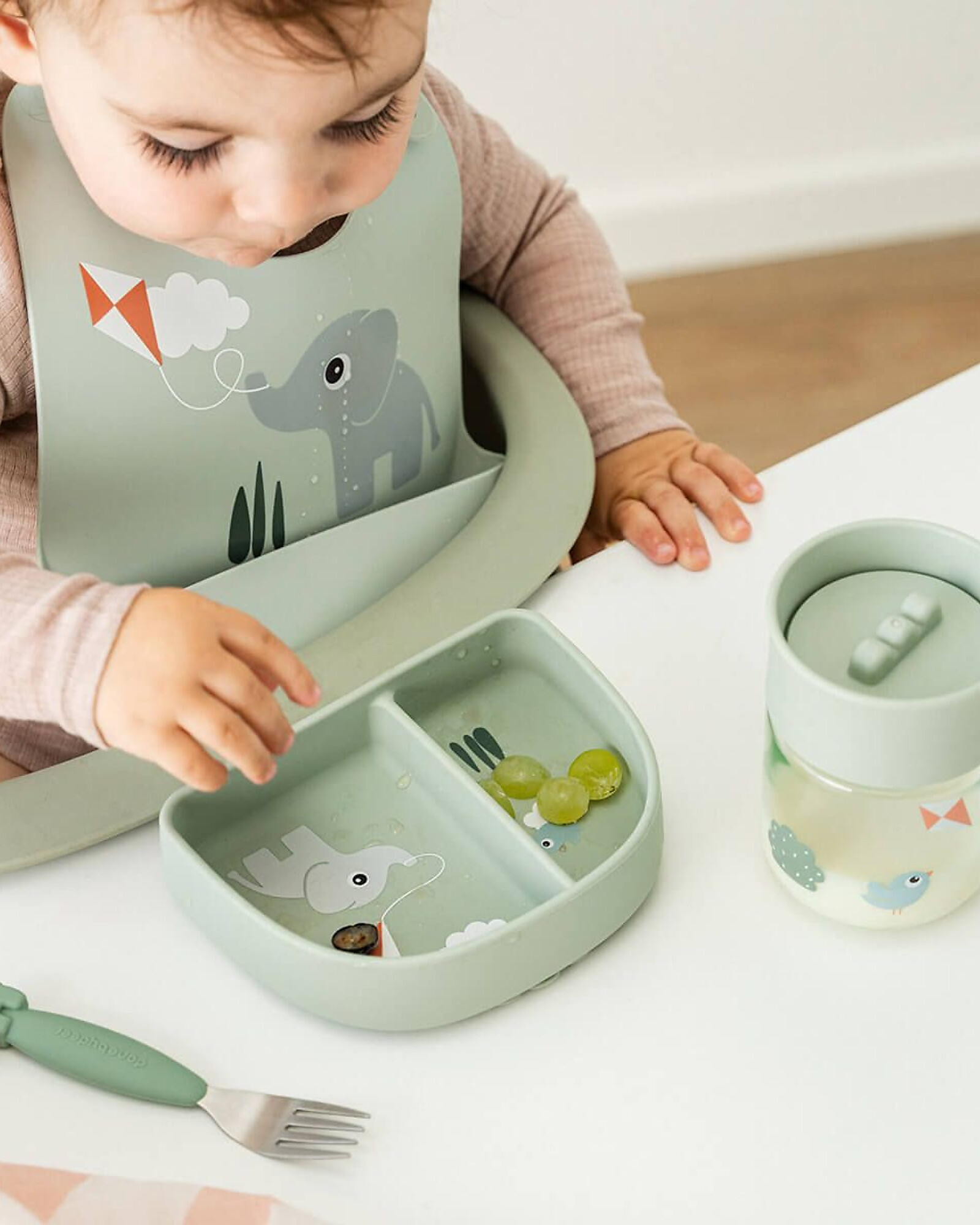 - The Peekaboo line is made from food-grade silicone, designed to spark curiosity in little diners with animal friends peeking out from the tableware! Mealtime will be even more fun this way!