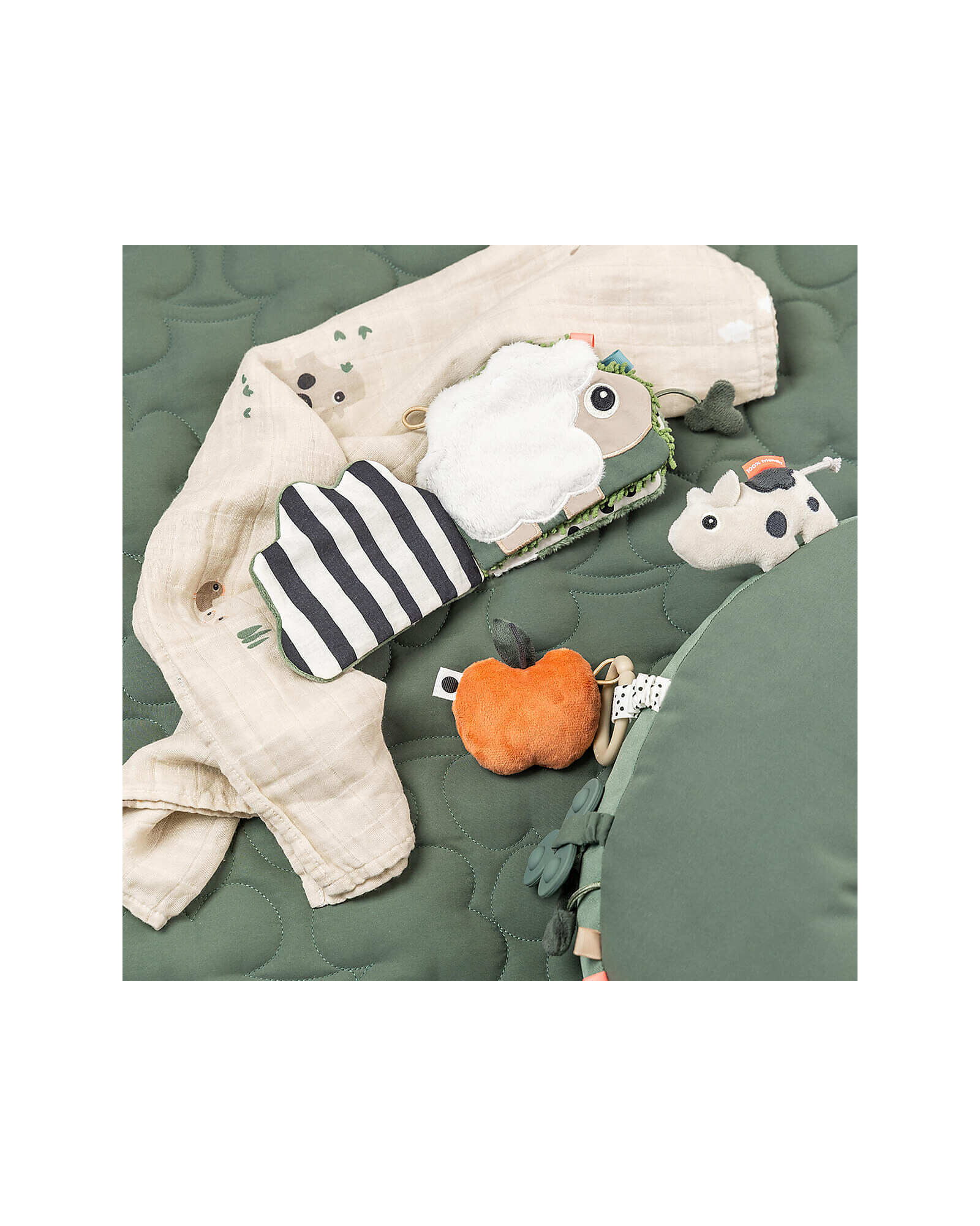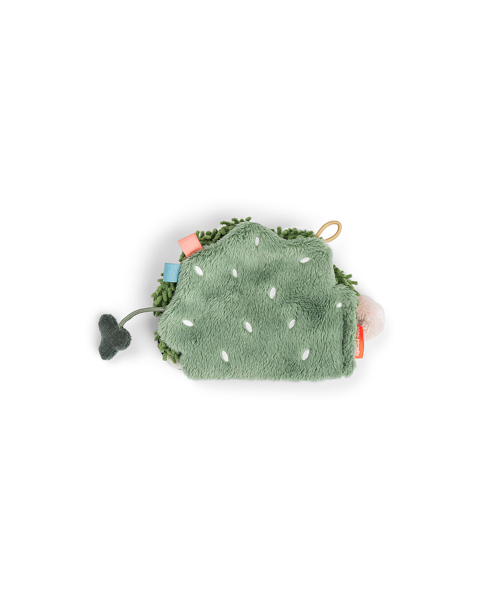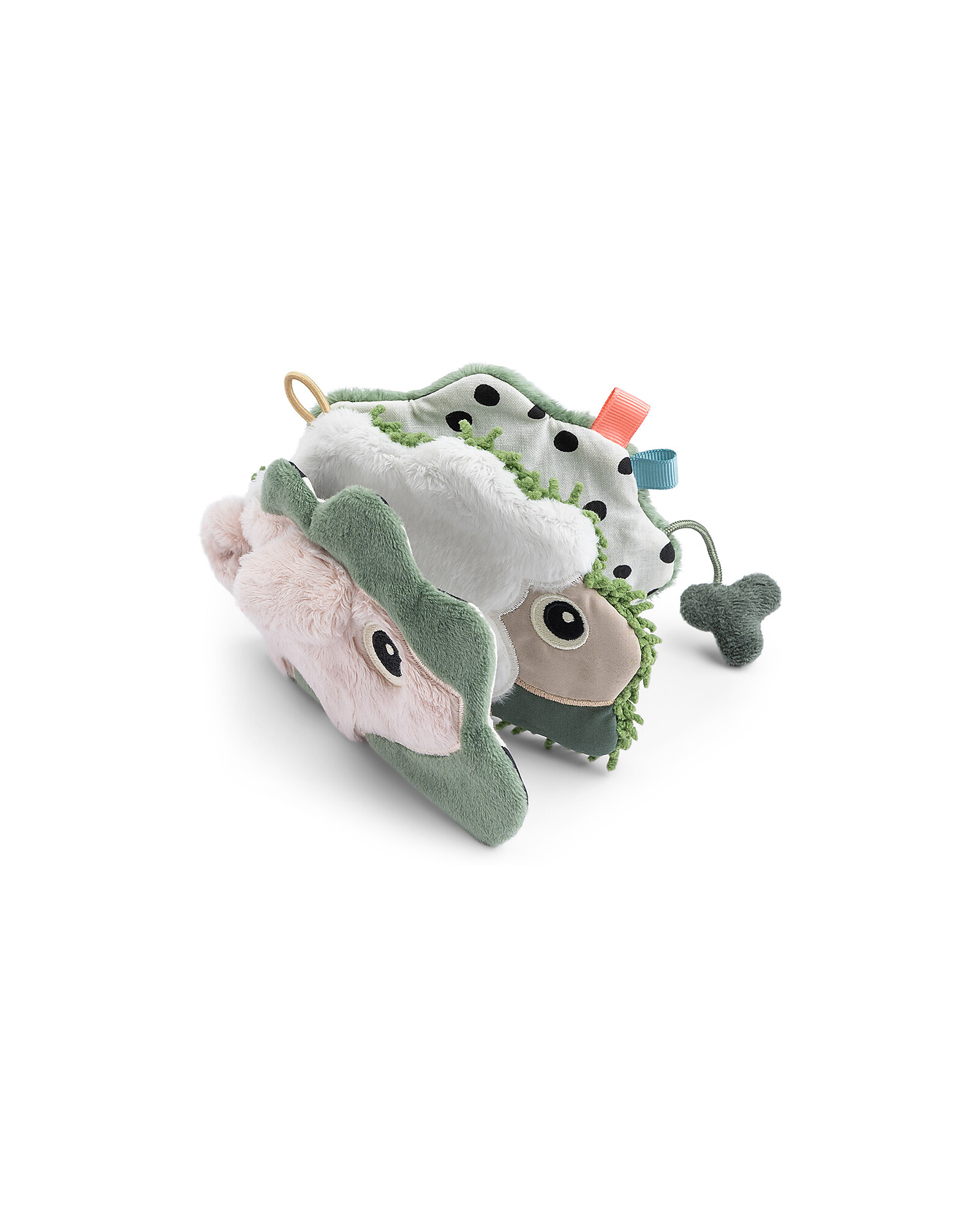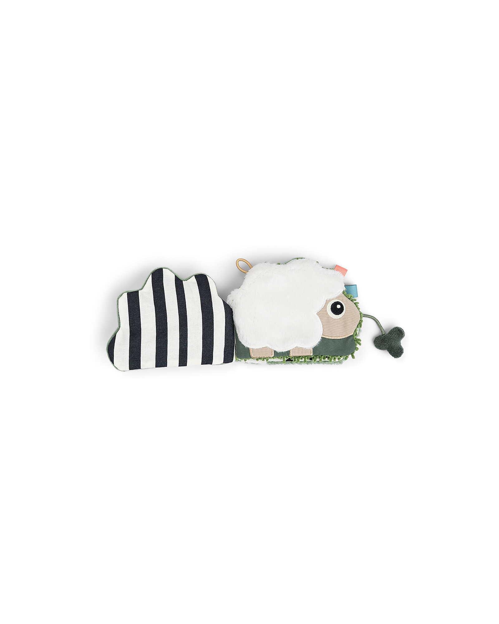 The Multi-Activity Book by Done by Deer from the new Tiny Farm Collection is an interactive book designed to stimulate the senses of newborns. It features sensory elements such as folds, beads, and different textures that engage the sense of hearing and touch. The pages are filled with playful contrasts and bright colors, perfect for visual stimulation. The baby can discover who is hiding behind the bushes, meeting cute characters like deer, who entertain them during play. Additionally, it comes with an elastic ring that allows it to be easily attached to a play gym or other products, making it practical for transport and use. This book promotes the sensory and motor development of little ones, providing an educational and fun experience.