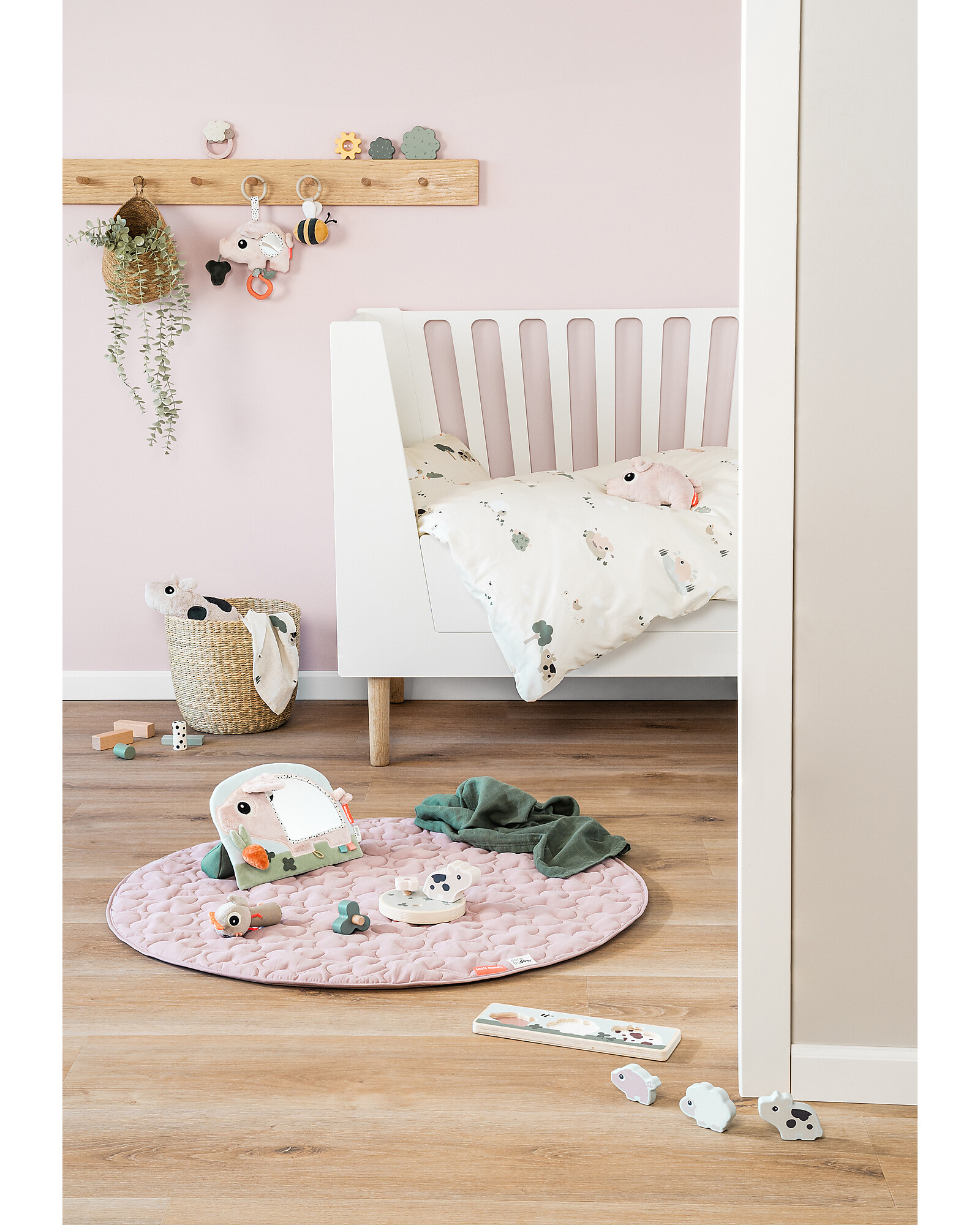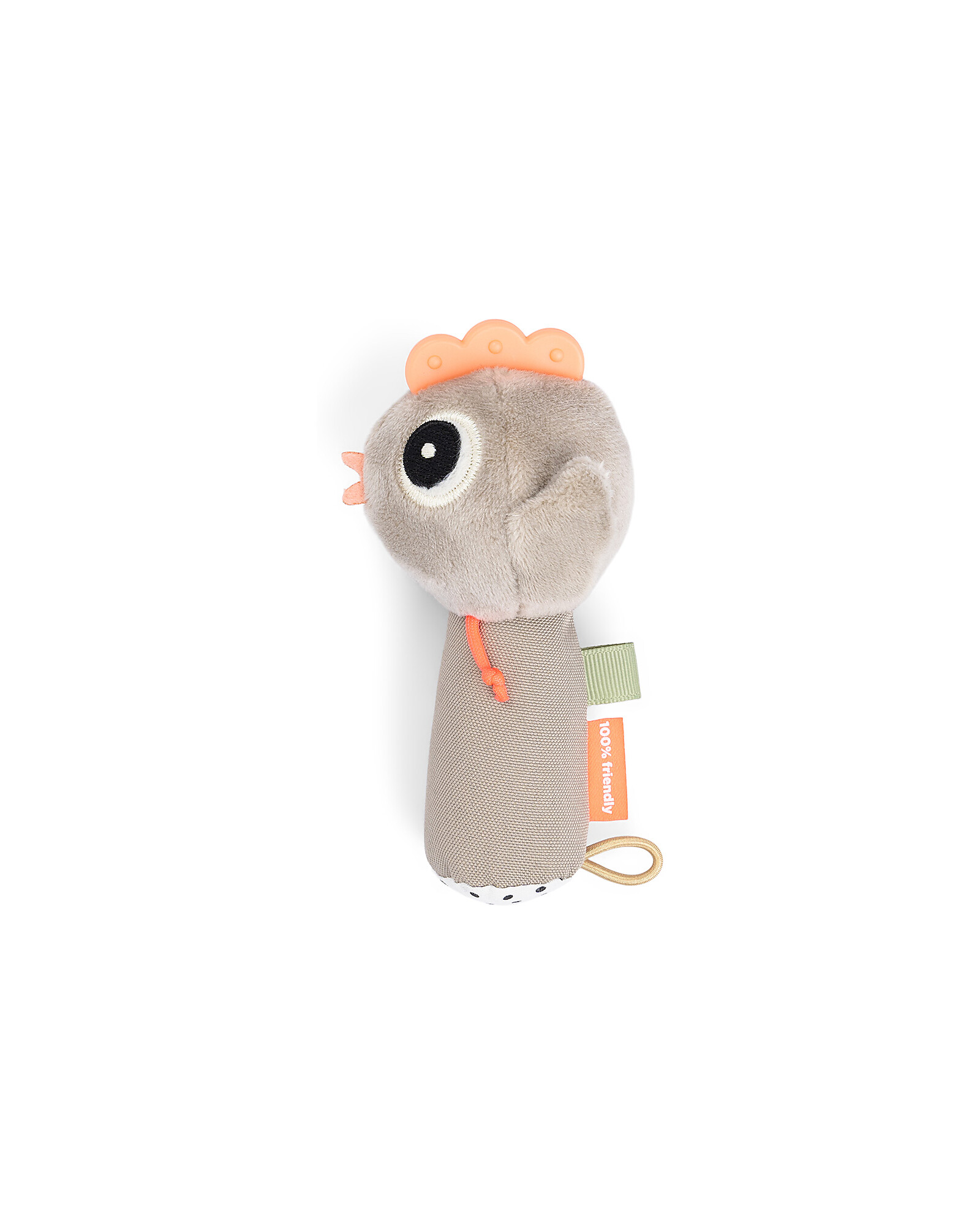 The Sensory Rattle from the new Tiny Farm collection by Done by Deer is an interactive toy designed to stimulate the baby's senses. It features sensory elements like a rattle and various textures that engage all five senses. The rooster's comb also functions as a teething ring, providing relief for irritated gums. The soft design in sandy tones, with contrasting colors, stimulates vision. Thanks to the elastic loop, it can be easily attached to a play gym or other toys, making it practical and easily portable. Perfect for the baby's first rattle, this toy encourages sensory and motor development. Its shape and materials are ideal for little hands, making it an educational, fun, and soothing toy.