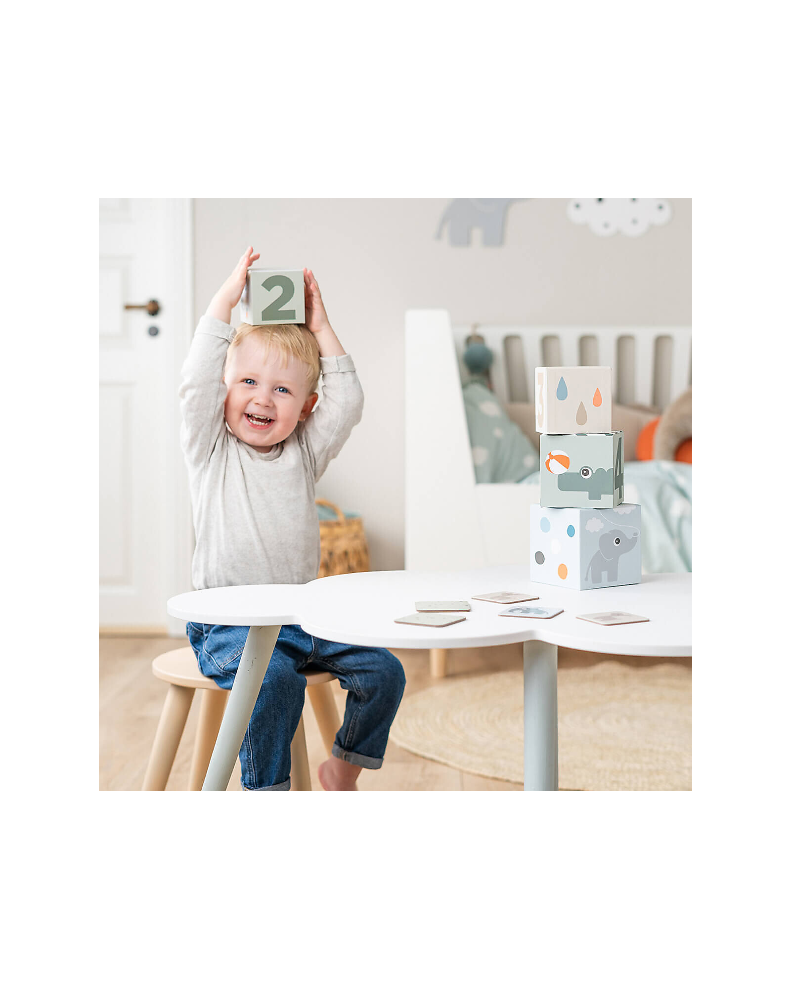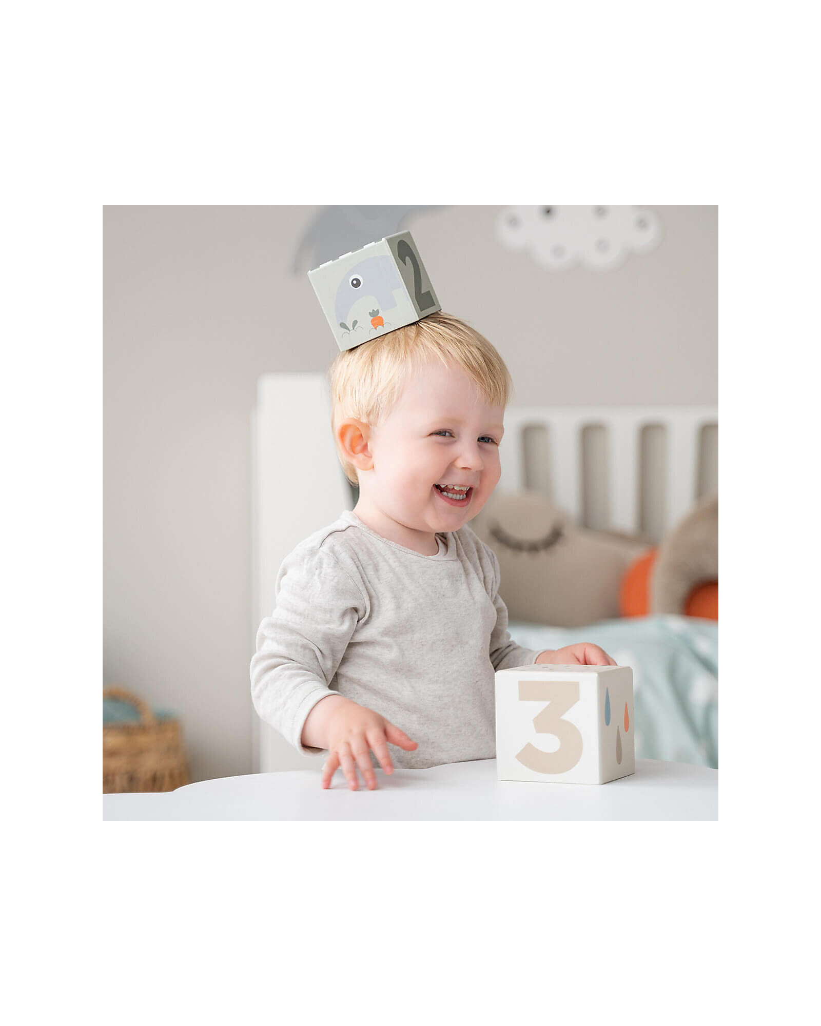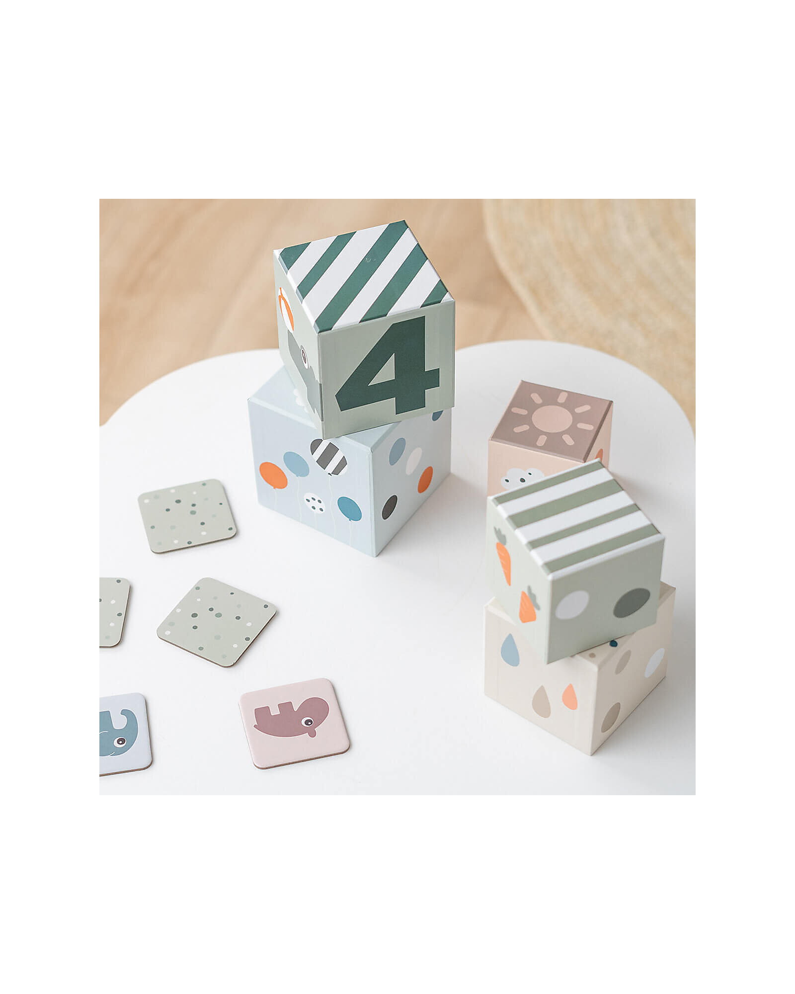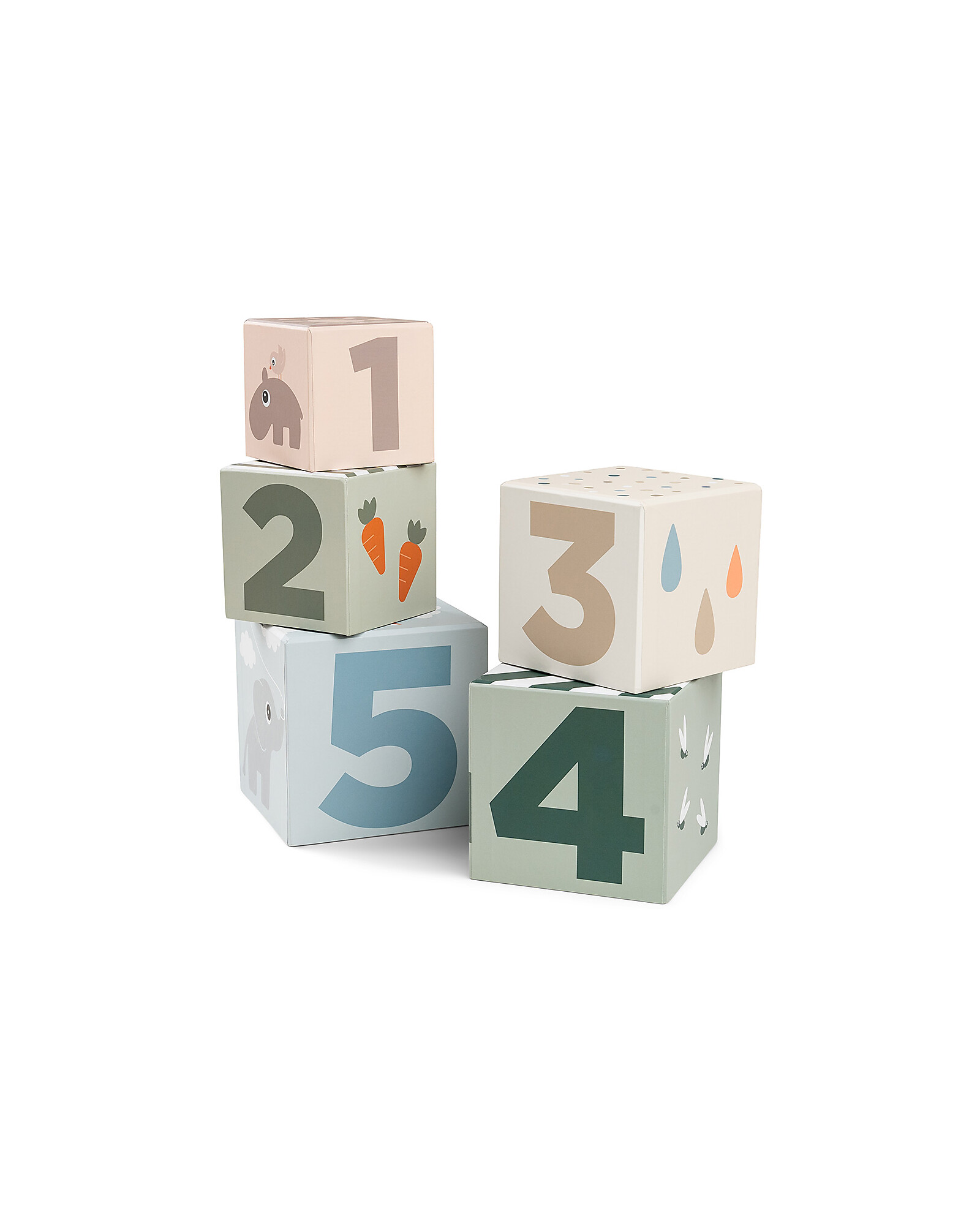 - 5 stacking cubes in a range of sizes from 7x7 cm up to 13x13 cm and in a mix of soft colours