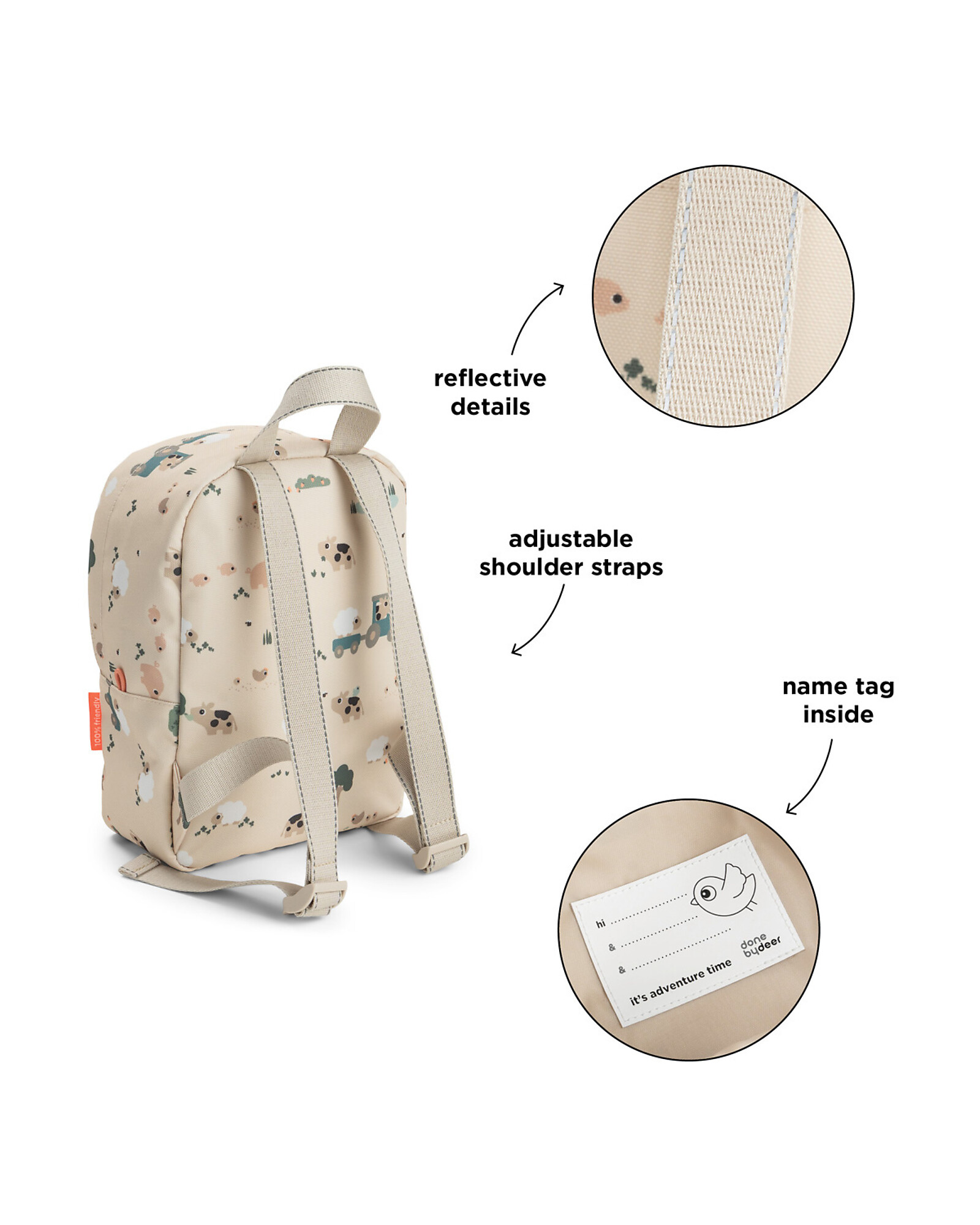 The large main compartment makes organisation simple, while the internal name tag helps with easy identification. Reflective details on the shoulder straps and carry handle enhance visibility, and the removable reflective cloud adds safety with a playful touch.