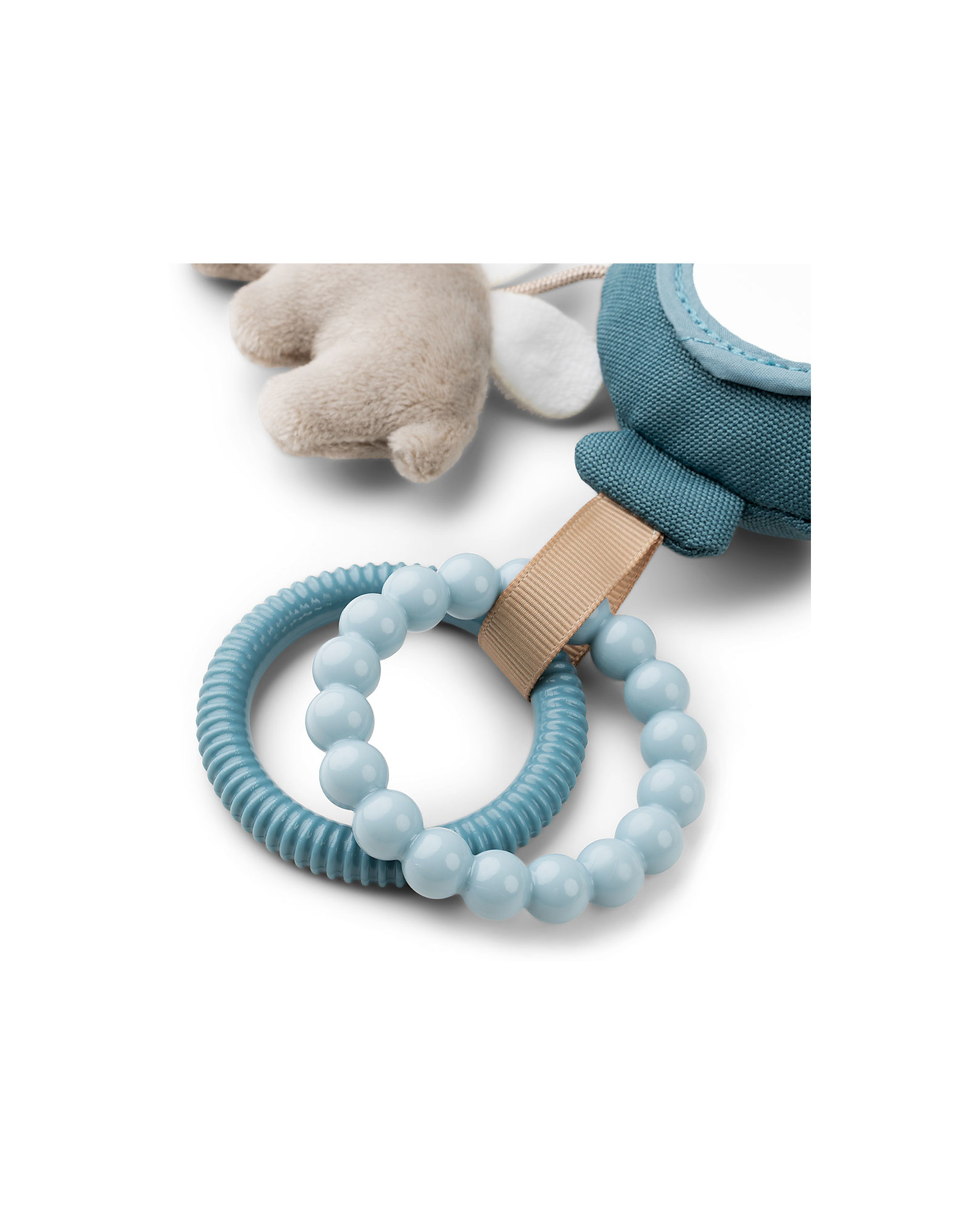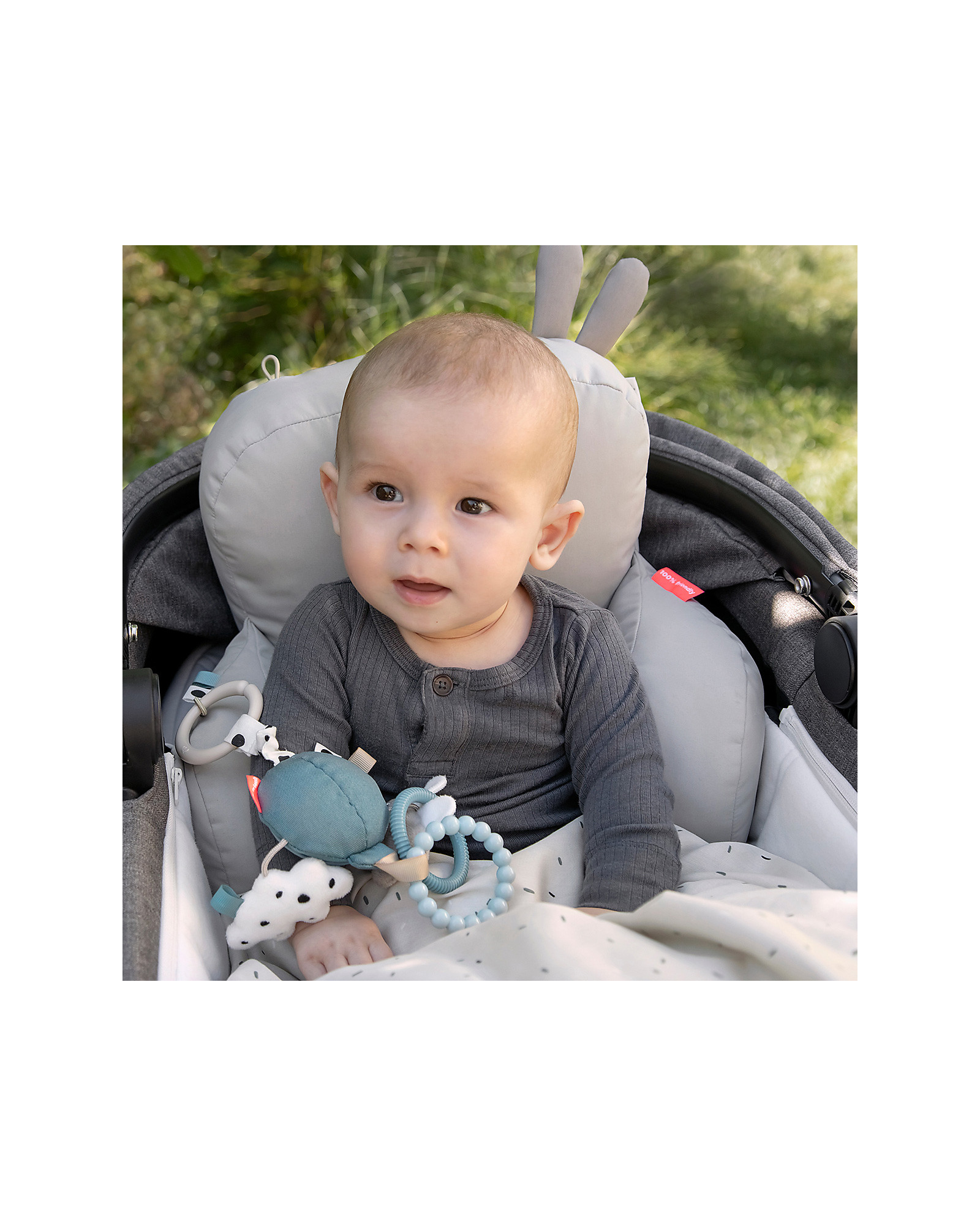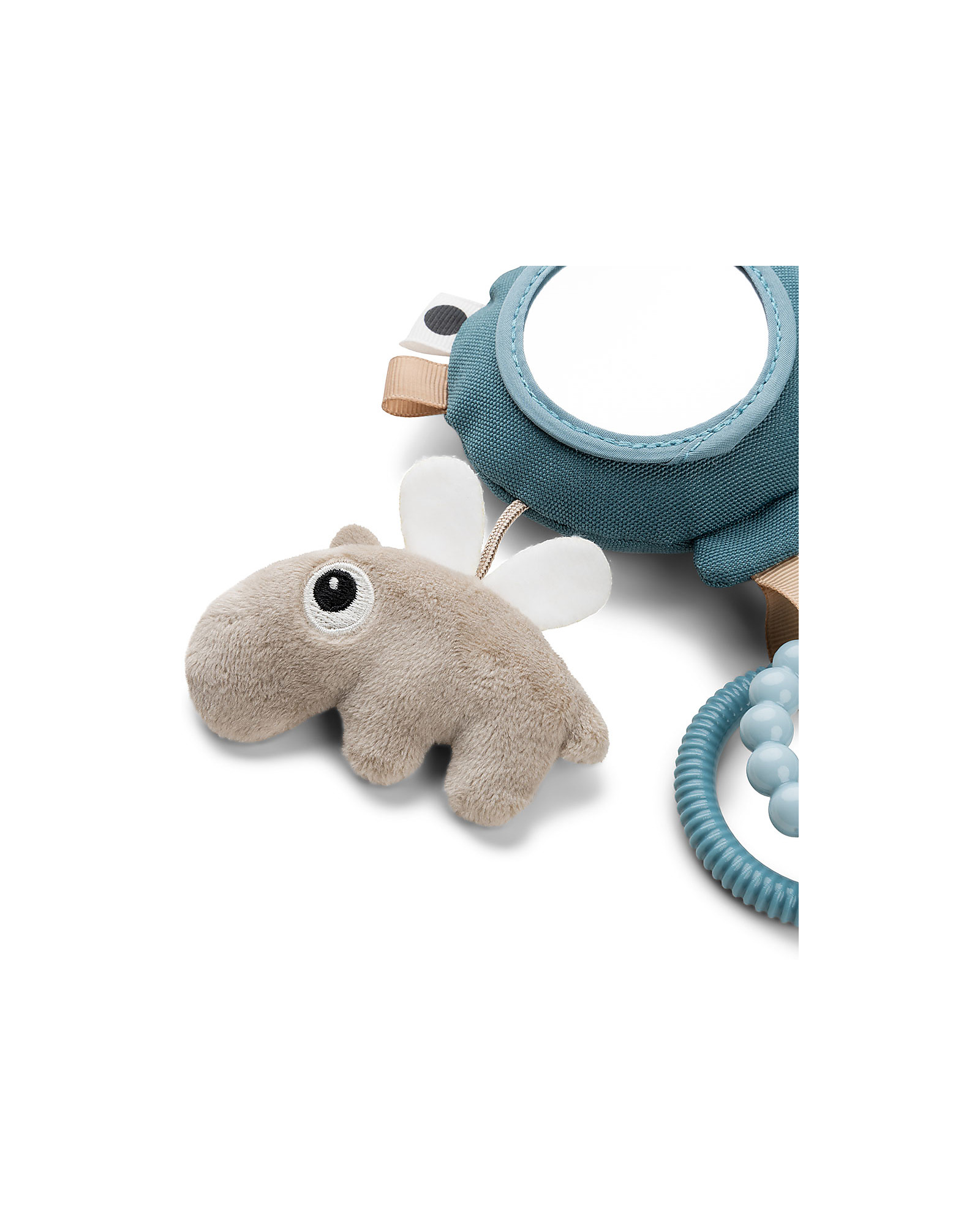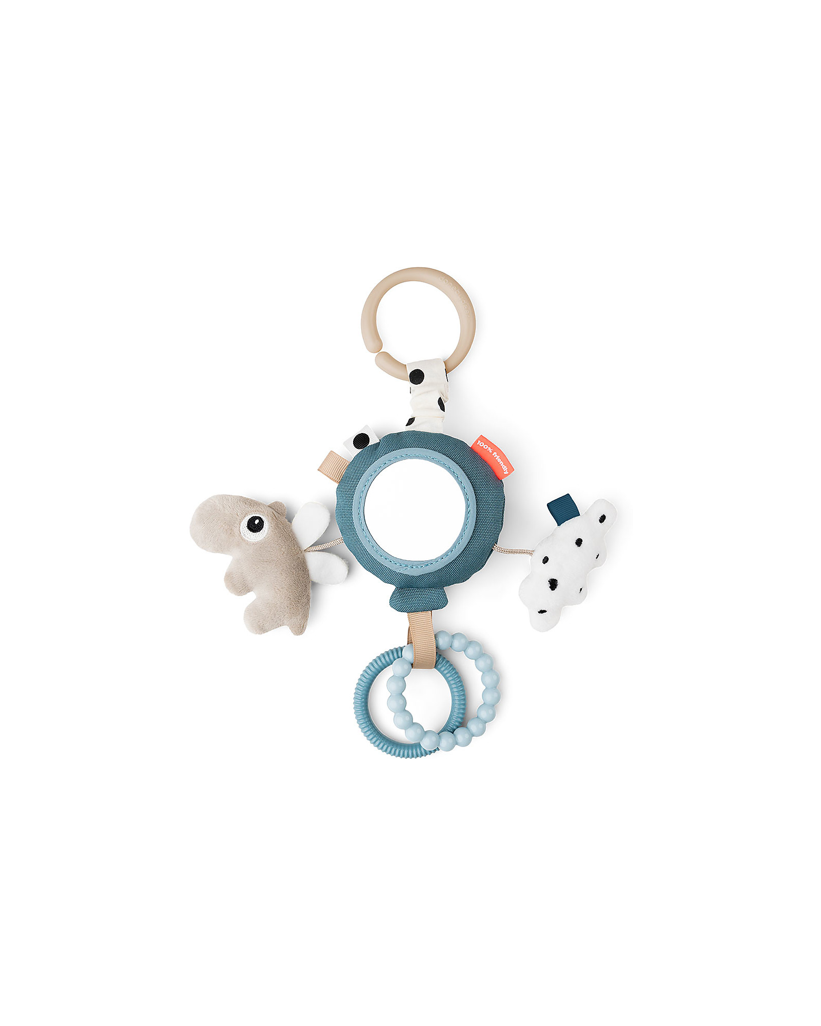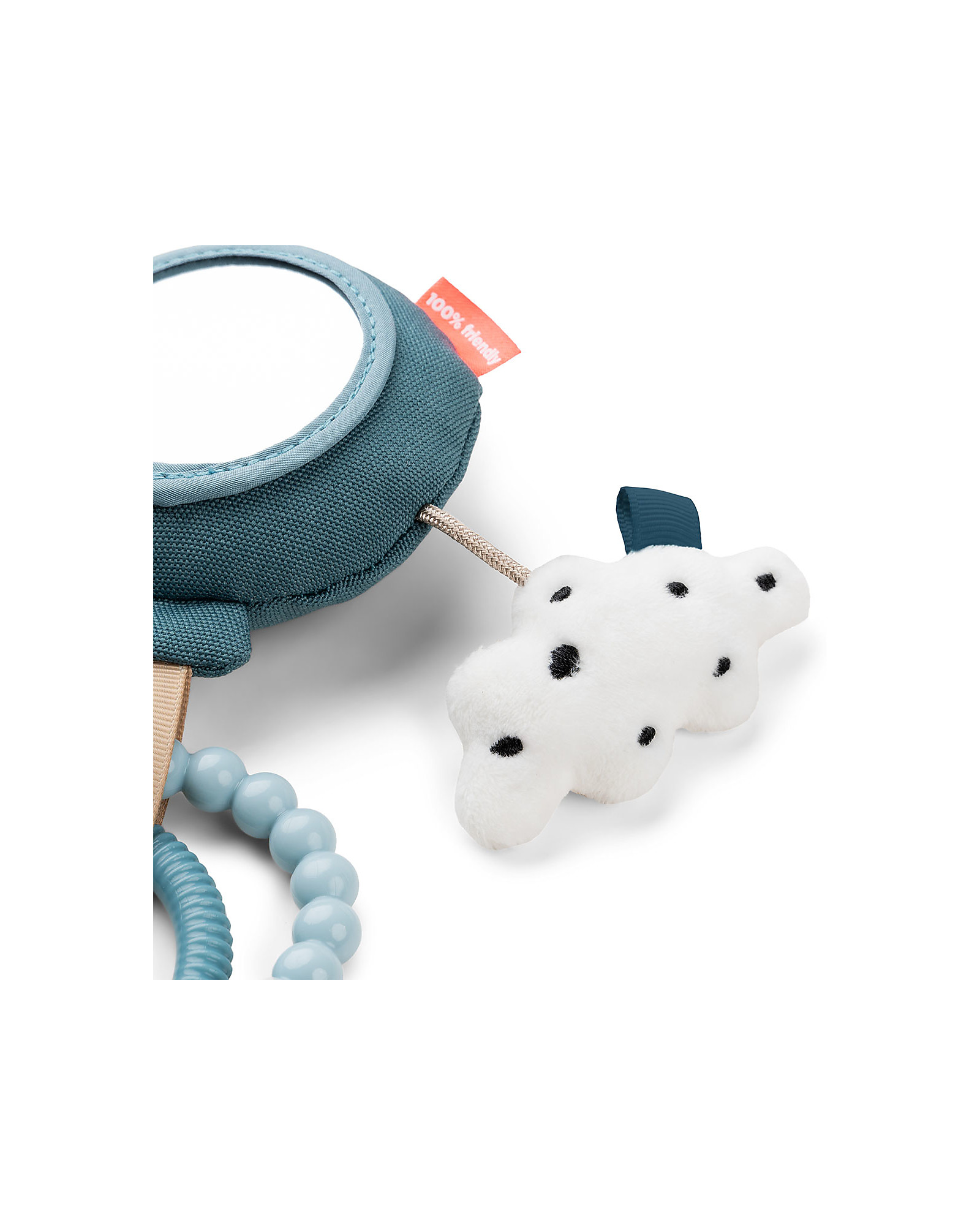 The activity mirror has a balloon rattle, a softly textured Ozzo and cloud, two textured rings, and fun tags. The child can easily grab the rings and hold the activity mirror. Use the toy link to attach it to the pram, car seat, or tummy time pillow.