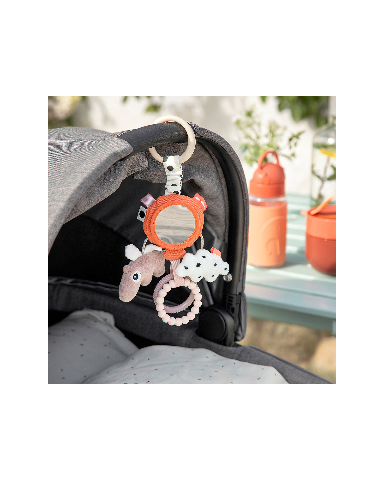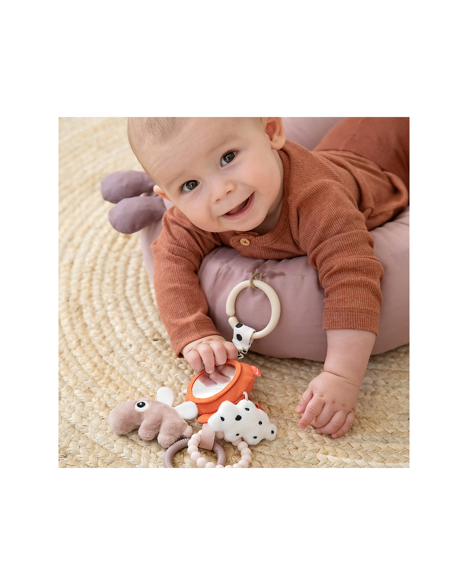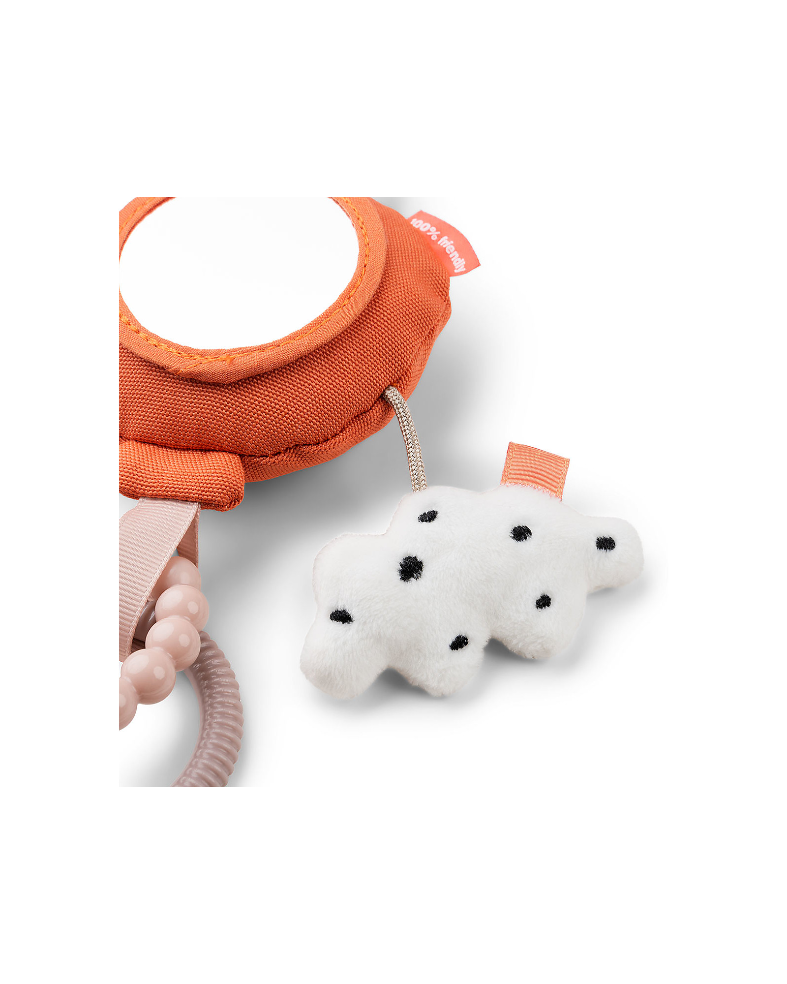 The activity mirror has a balloon rattle, a softly textured Ozzo and cloud, two textured rings, and fun tags. The child can easily grab the rings and hold the activity mirror. Use the toy link to attach it to the pram, car seat, or tummy time pillow.