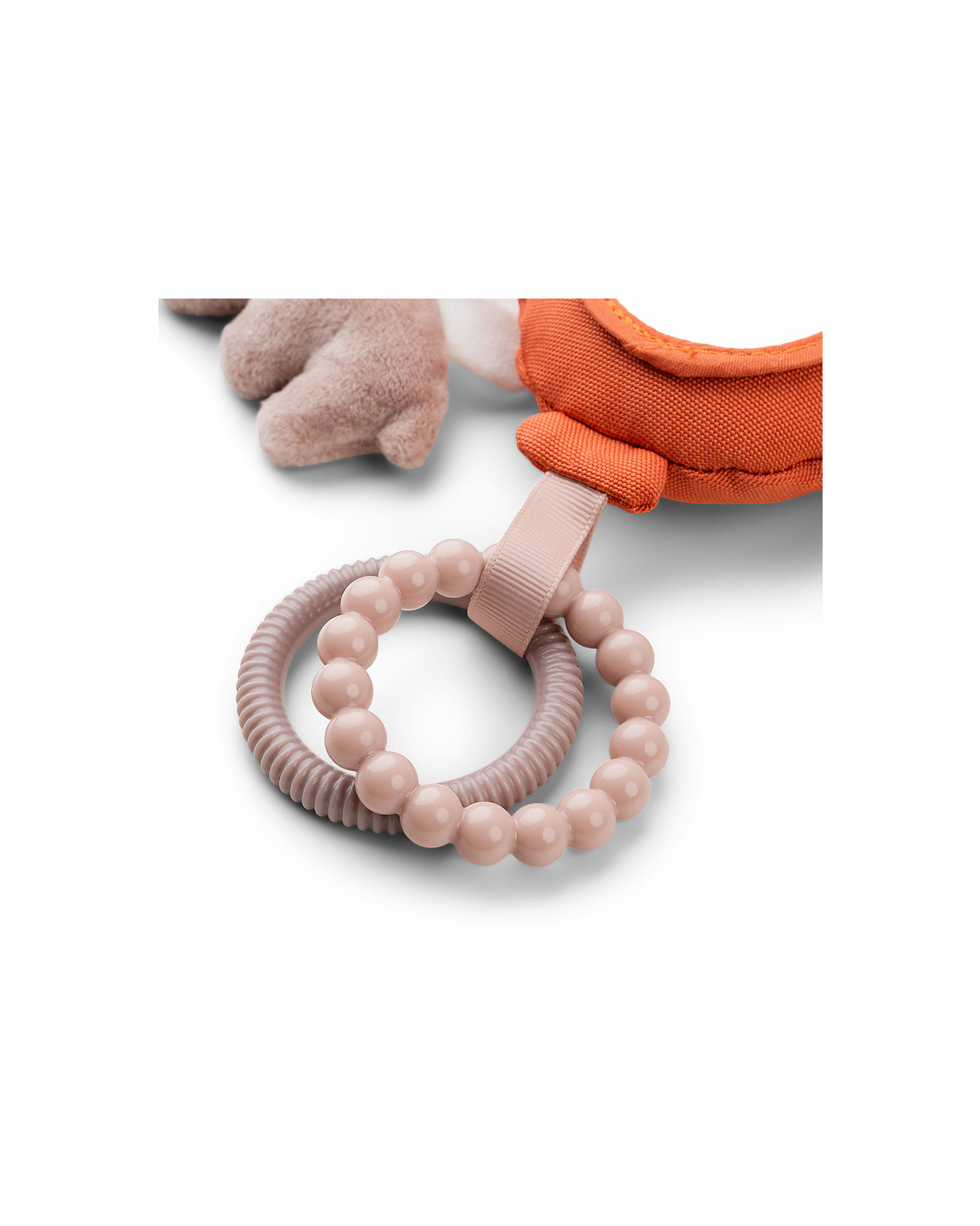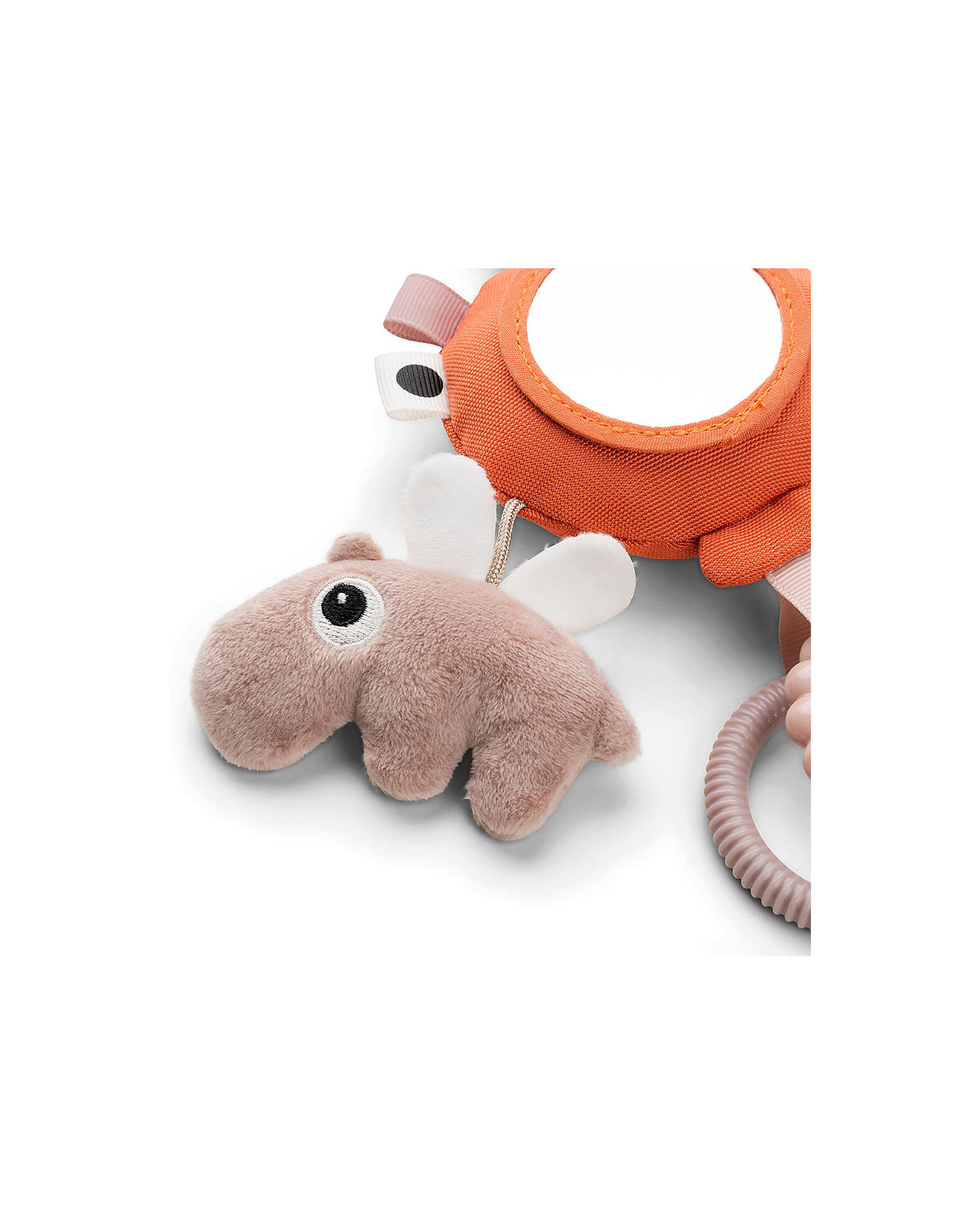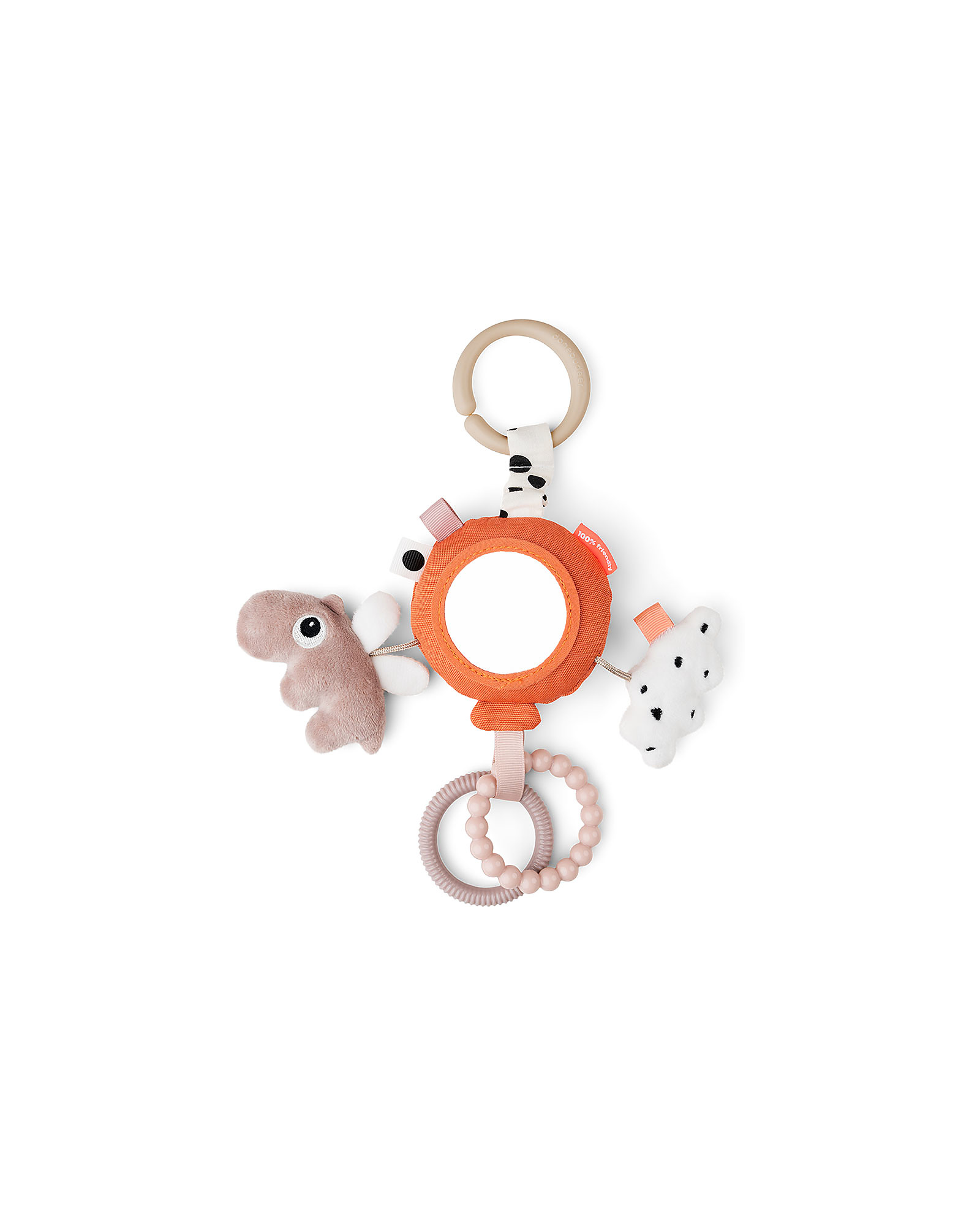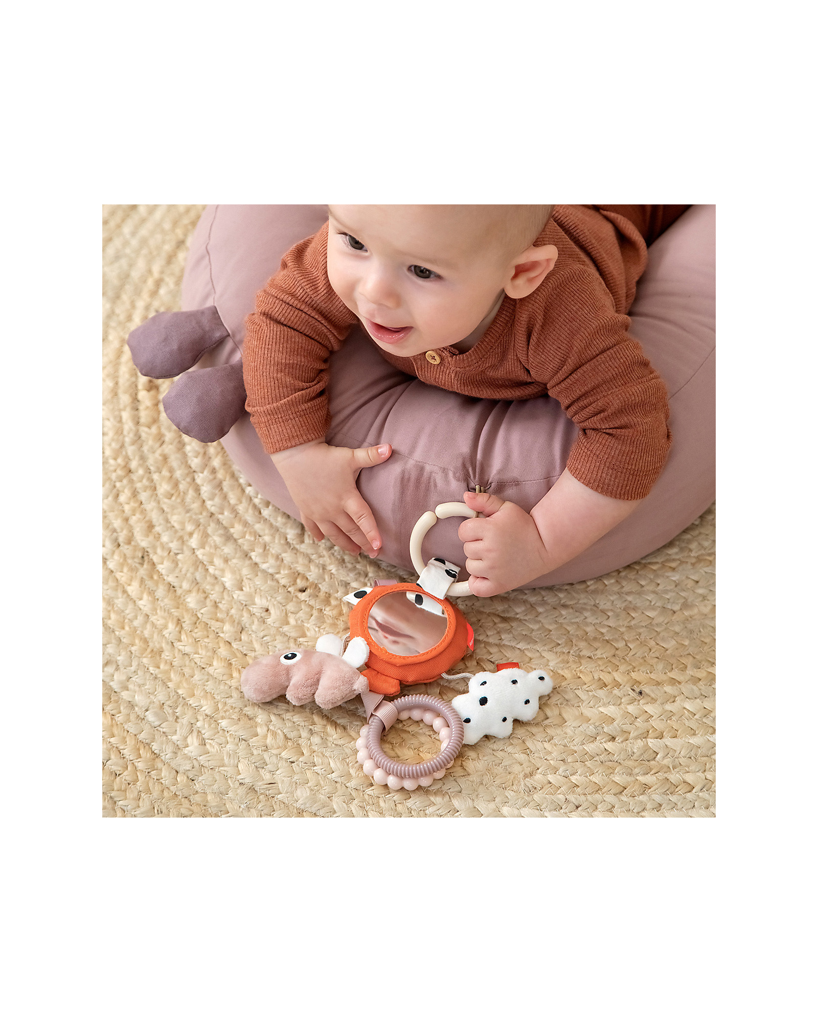 The activity mirror has a balloon rattle, a softly textured Ozzo and cloud, two textured rings, and fun tags. The child can easily grab the rings and hold the activity mirror. Use the toy link to attach it to the pram, car seat, or tummy time pillow.
