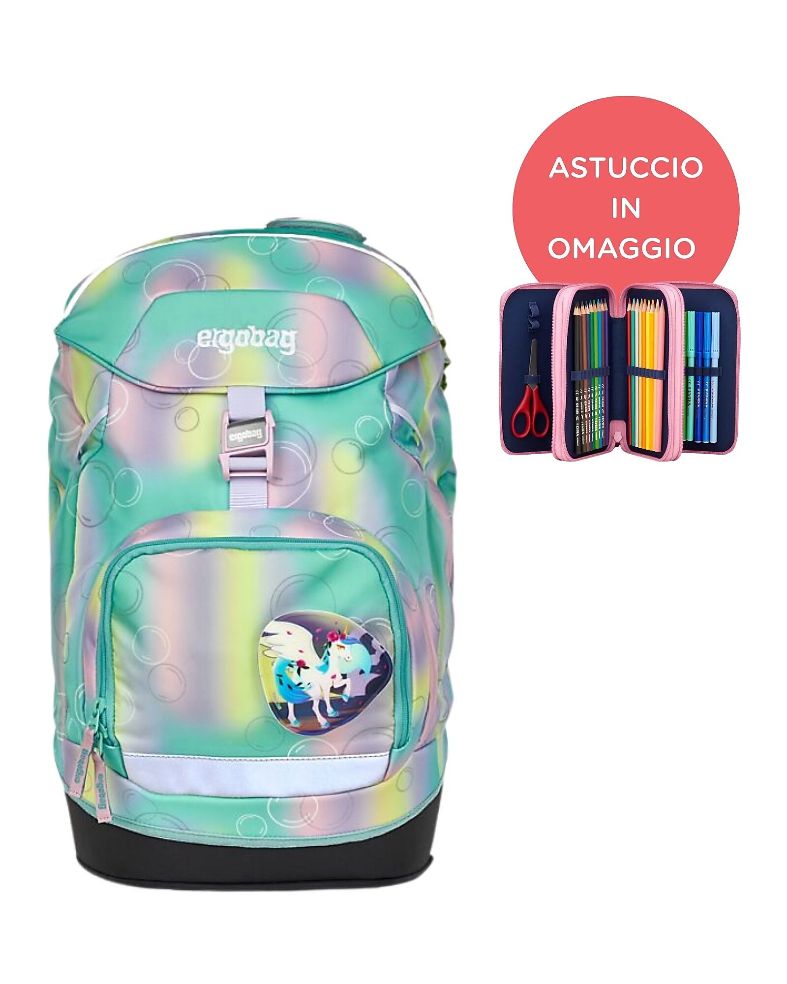 The Ergobag Backpack and Pencil Case Set combines comfort, functionality, and sustainability in a modern, colorful design. The Prime School backpack is lightweight, roomy, and features an ergonomic, height-adjustable backrest, adapting to your child's growth from first to fifth grade. The curved shoulder straps and stable, waterproof base ensure proper posture and durability. Made from 18 recycled plastic bottles, the backpack is completely eco-friendly and features reflective surfaces for maximum safety even in the dark. The Ergobag Maxi Pencil Case, with three compartments and three zippers, contains everything you need for school: 18 colored pencils, 18 markers, pens, glue, and much more, up to 40 items. Also made from recycled PET, it is durable, well-organized, and coordinates with the backpacks with bright, eye-catching graphics. A perfect set for tackling school in style, comfort, and respect for the environment.