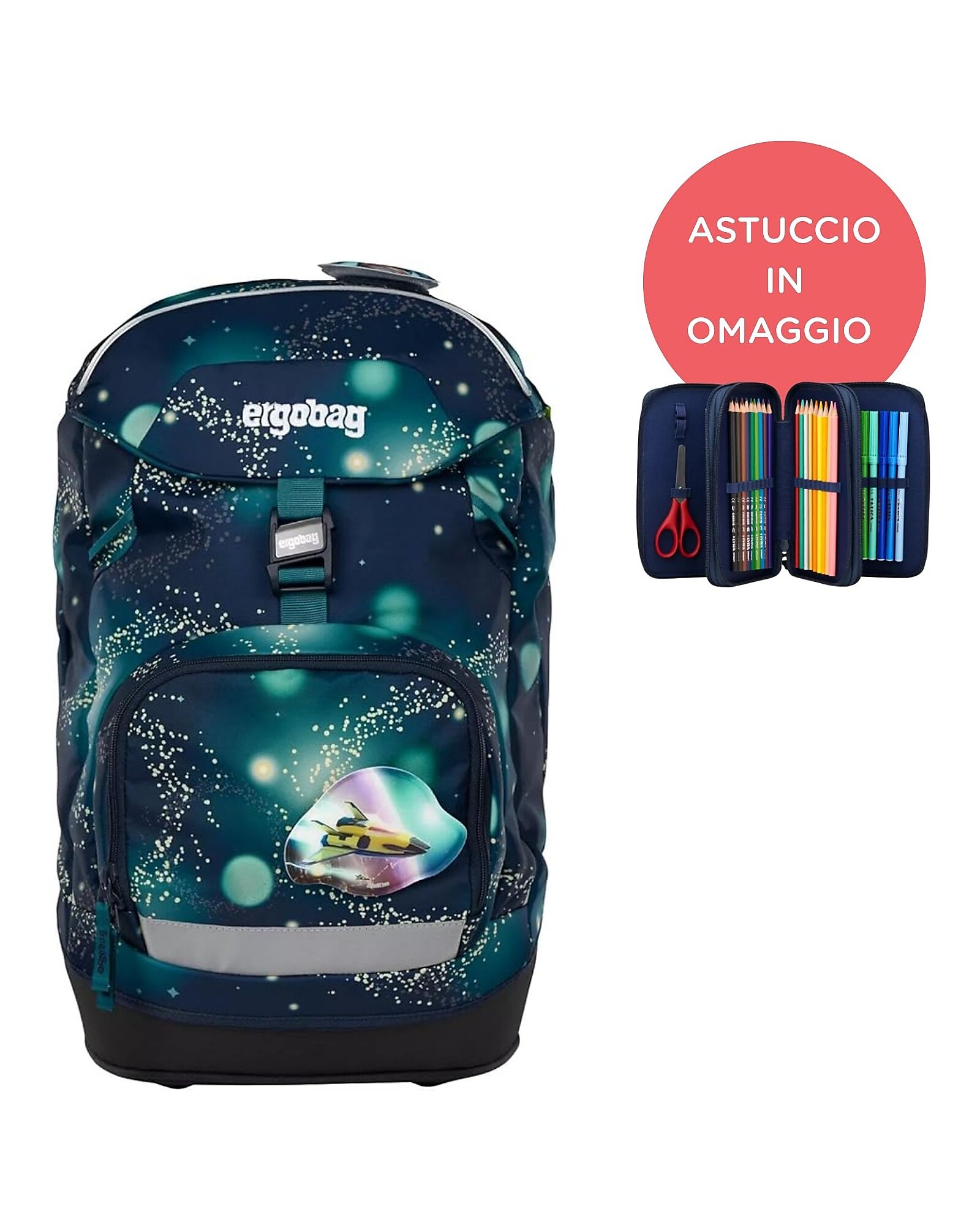 The Ergobag Backpack and Pencil Case Set combines comfort, functionality, and sustainability in a modern, colorful design. The Prime School backpack is lightweight, roomy, and features an ergonomic, height-adjustable backrest, adapting to your child's growth from first to fifth grade. The curved shoulder straps and stable, waterproof base ensure proper posture and durability. Made from 18 recycled plastic bottles, the backpack is completely eco-friendly and features reflective surfaces for maximum safety even in the dark. The Ergobag Maxi Pencil Case, with three compartments and three zippers, contains everything you need for school: 18 colored pencils, 18 markers, pens, glue, and much more, up to 40 items. Also made from recycled PET, it is durable, well-organized, and coordinates with the backpacks with bright, eye-catching graphics. A perfect set for tackling school in style, comfort, and respect for the environment.
