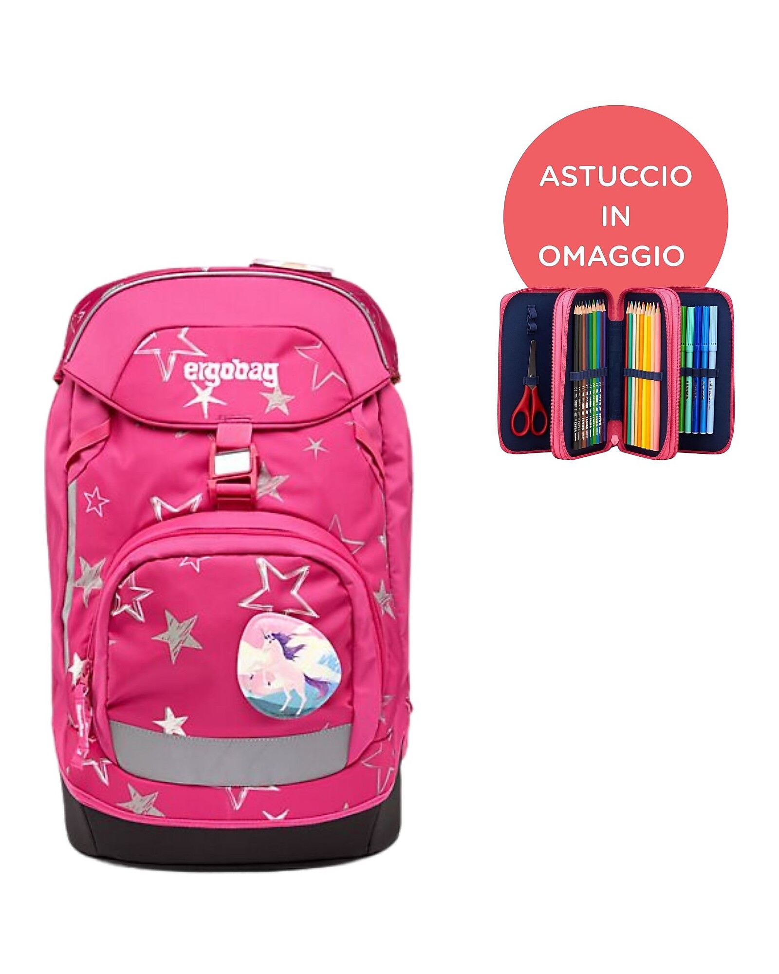 The Ergobag Backpack and Pencil Case Set combines comfort, functionality, and sustainability in a modern, colorful design. The Prime School backpack is lightweight, roomy, and features an ergonomic, height-adjustable backrest, adapting to your child's growth from first to fifth grade. The curved shoulder straps and stable, waterproof base ensure proper posture and durability. Made from 18 recycled plastic bottles, the backpack is completely eco-friendly and features reflective surfaces for maximum safety even in the dark. The Ergobag Maxi Pencil Case, with three compartments and three zippers, contains everything you need for school: 18 colored pencils, 18 markers, pens, glue, and much more, up to 40 items. Also made from recycled PET, it is durable, well-organized, and coordinates with the backpacks with bright, eye-catching graphics. A perfect set for tackling school in style, comfort, and respect for the environment.