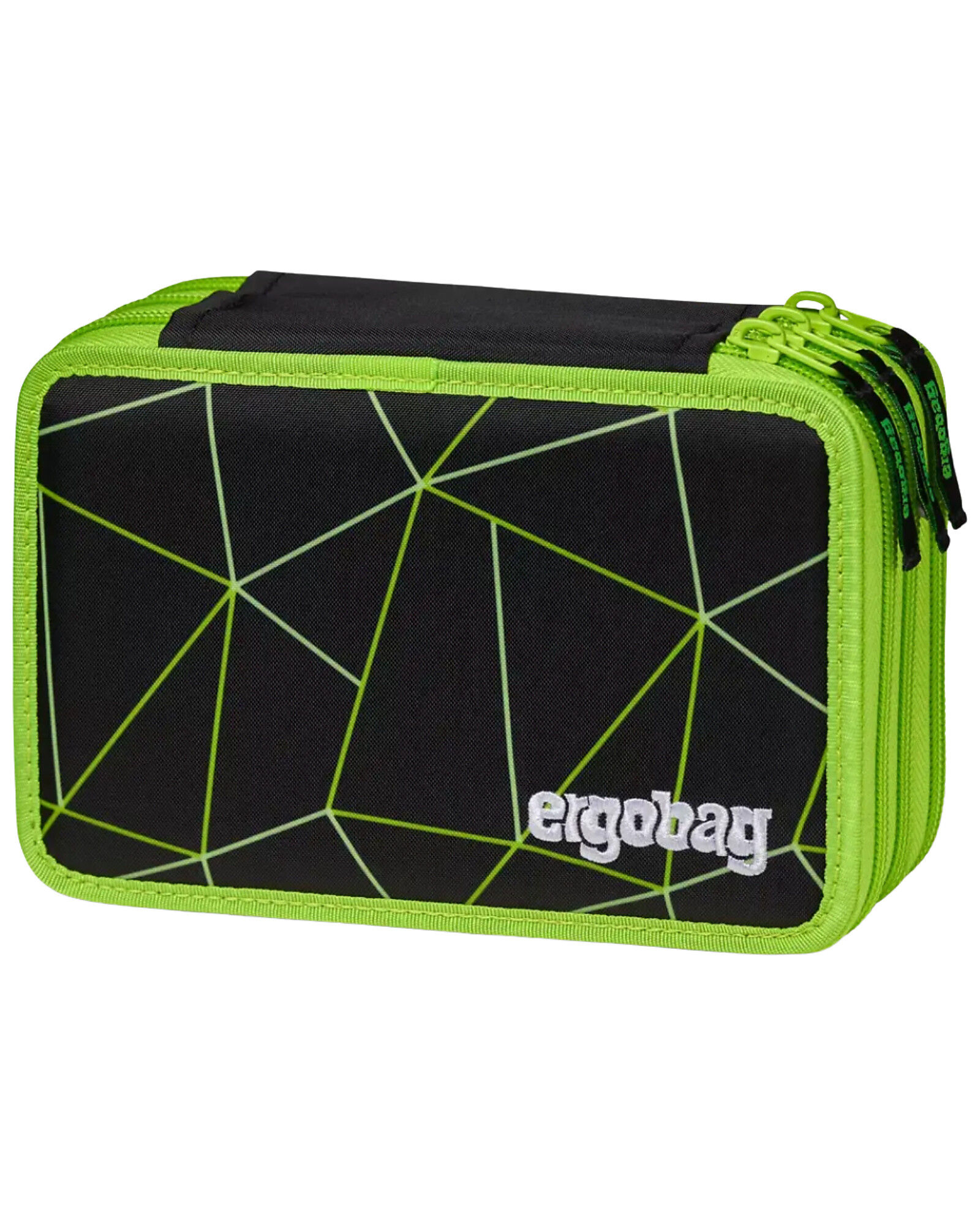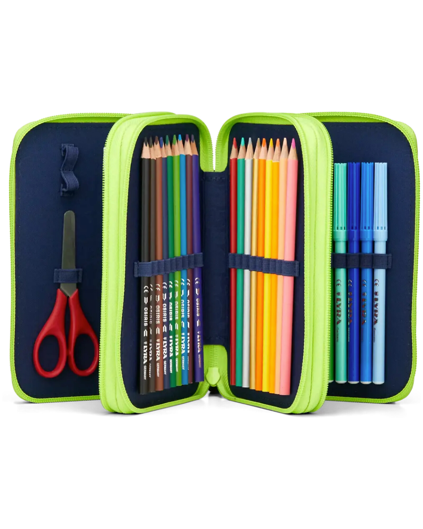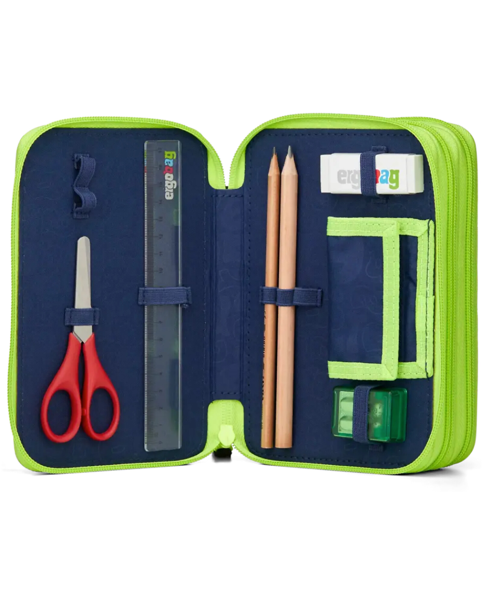 Filled Maxi Pencil Case of the German brand Ergobag is beautiful, practical and super equipped. It has a triple compartment with 3 zips and contains everything you need for school: pens, colored pencils, markers, glue and much more. It can hold up to 40 pieces, with 18 colored pencils and 18 markers supplied, triple compartment and a pocket for coins. It features resistant elastics, ultra-sliding zips and lined and customized interiors.