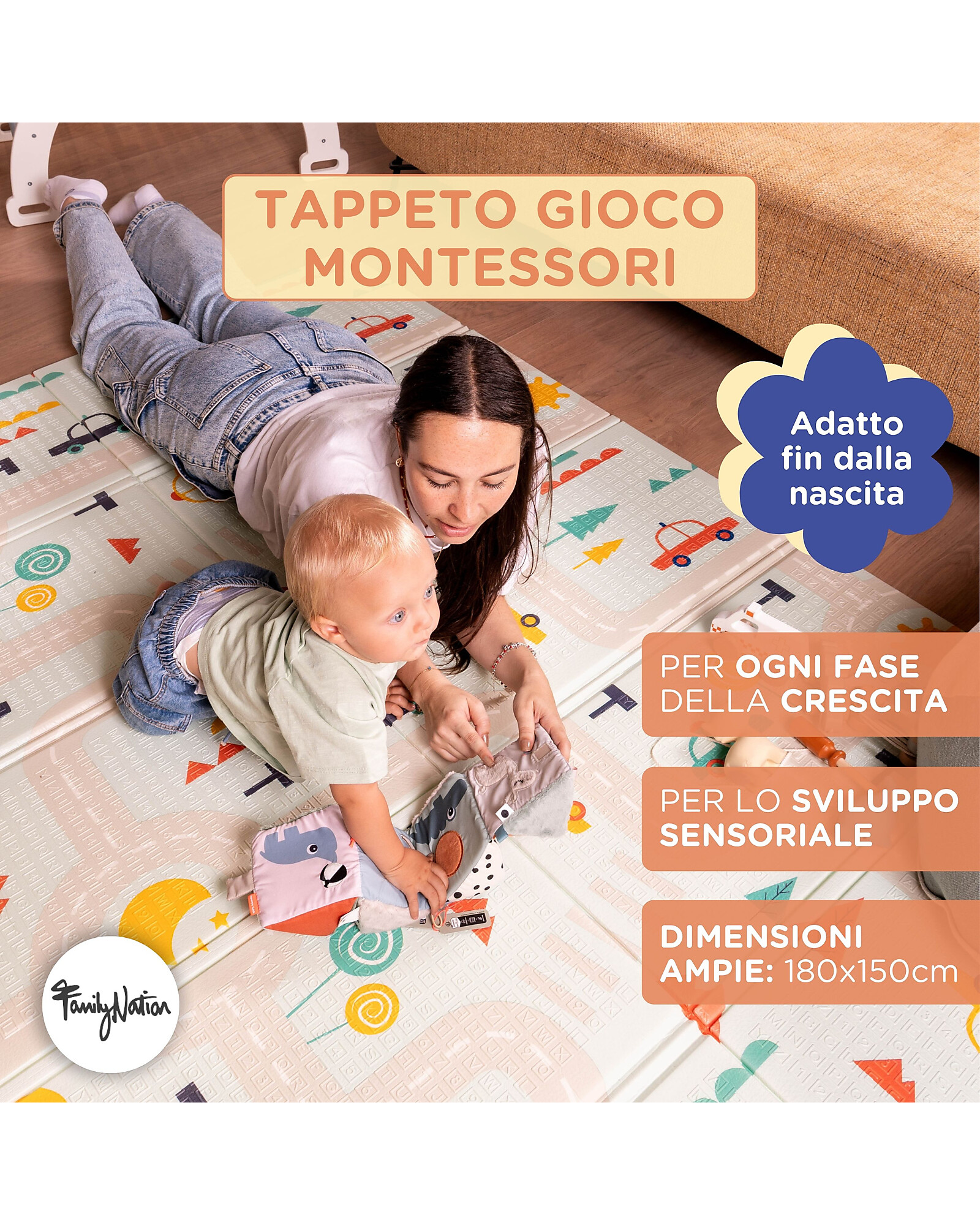 Turn every playtime into a safe, soft, and fun experience with the Montessori Animal Friends playmat. With dimensions of 180 x 150 cm, it is made from hypoallergenic XPE foam. Being completely non-toxic, waterproof, and non-slip, it’s perfect for supporting your baby from the very first months. Its colorful, foldable design stimulates curiosity and easily fits into any space, indoors or outdoors. It wipes clean in seconds and stores away without clutter, making it the ideal companion for practical and mindful parents. It's more than just a playmat – it's a safe foundation for first steps, gentle play, and lasting memories.