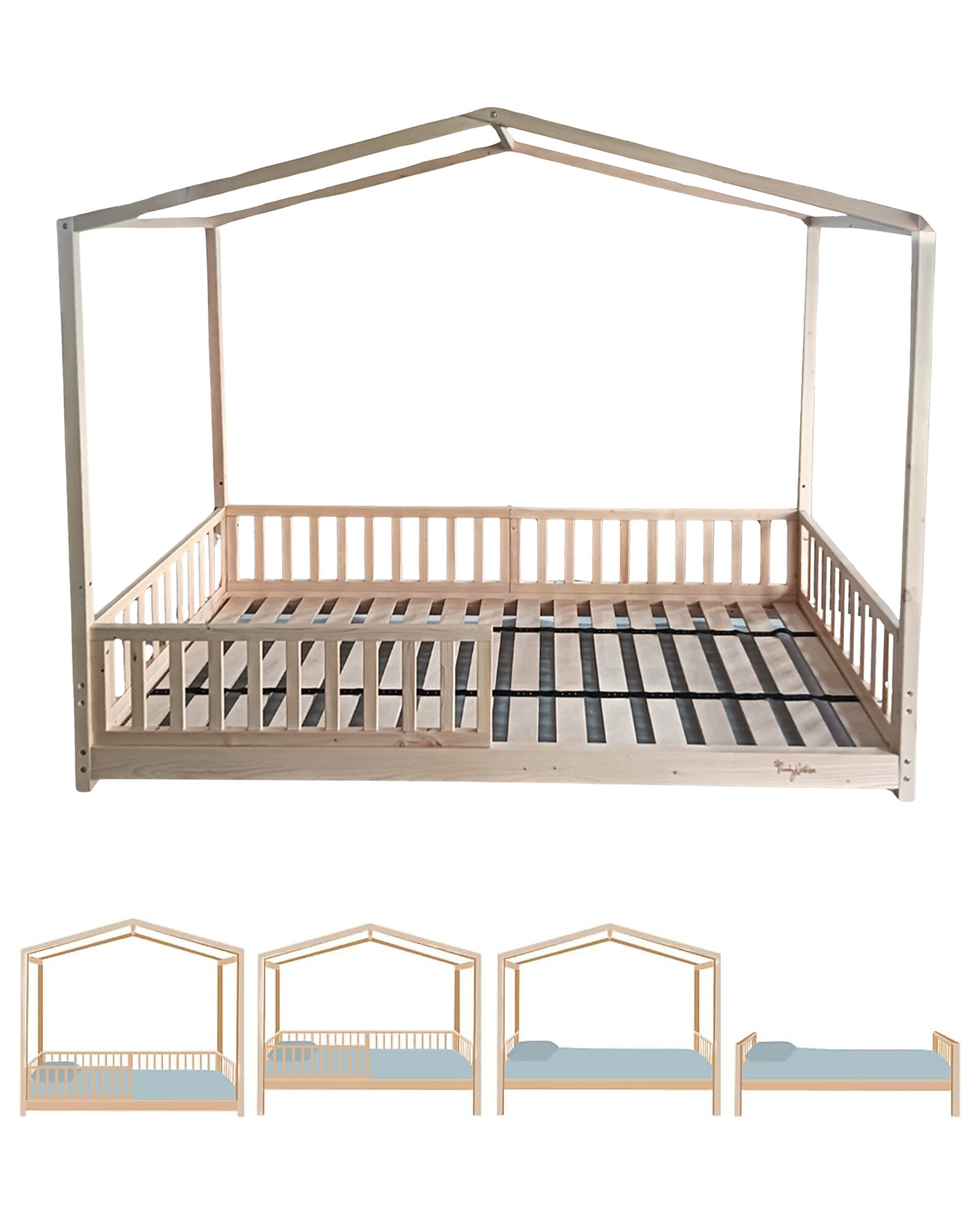 - The Kit Includes: bed frame, 5 sides (headboard, footboard, two-part side, and a fall-prevention side on the access side), house roof structure, slats, and legs for the single bed.