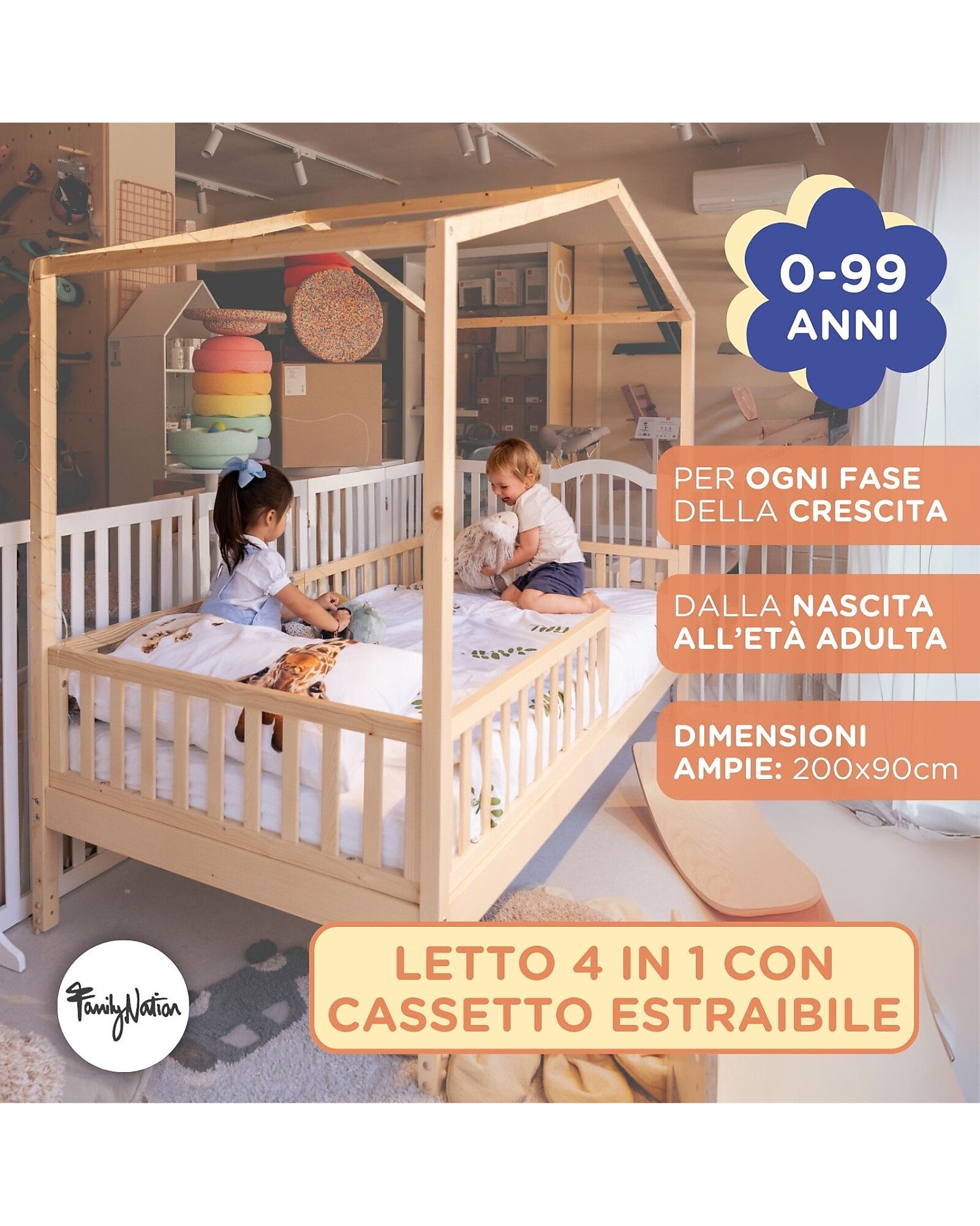 The Evi 4-in-1 Montessori Evolutionary Bed by Family Nation is a single bed designed to accompany your child through every stage of growth, from birth to adulthood without the need to purchase other beds!