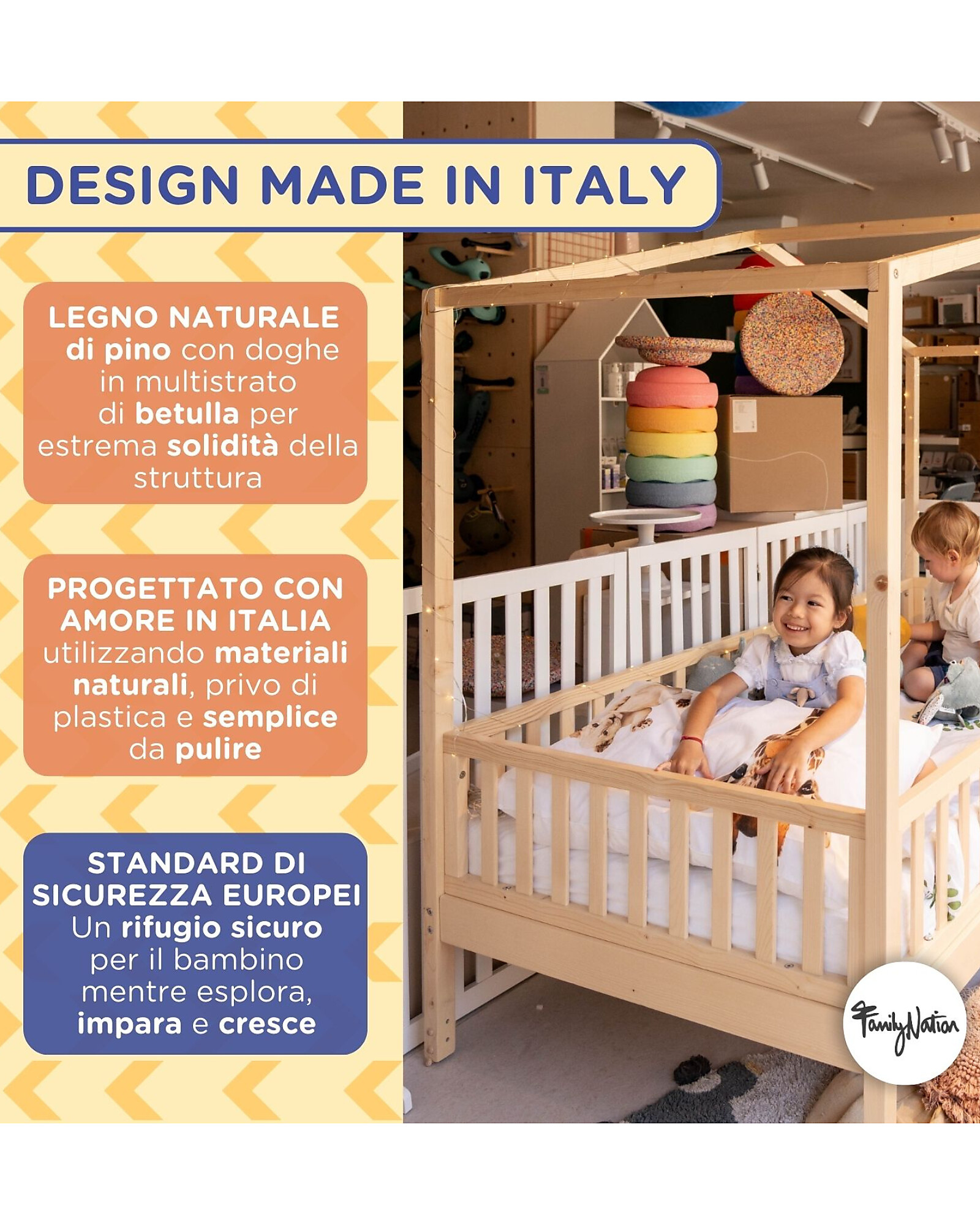 For more thorough cleaning and maintenance, you can use fine sandpaper (grain 180 or 220) on the areas that require it. The wood of Evi is untreated with varnish, so you can always refresh it by sanding. - Safety: There is no specific European regulation for Montessori-style beds, so we have applied the general safety principles valid for children's furniture. Furthermore, the Evi Bed meets the safety, strength, and durability requirements set by the European standard UNI EN 1725.