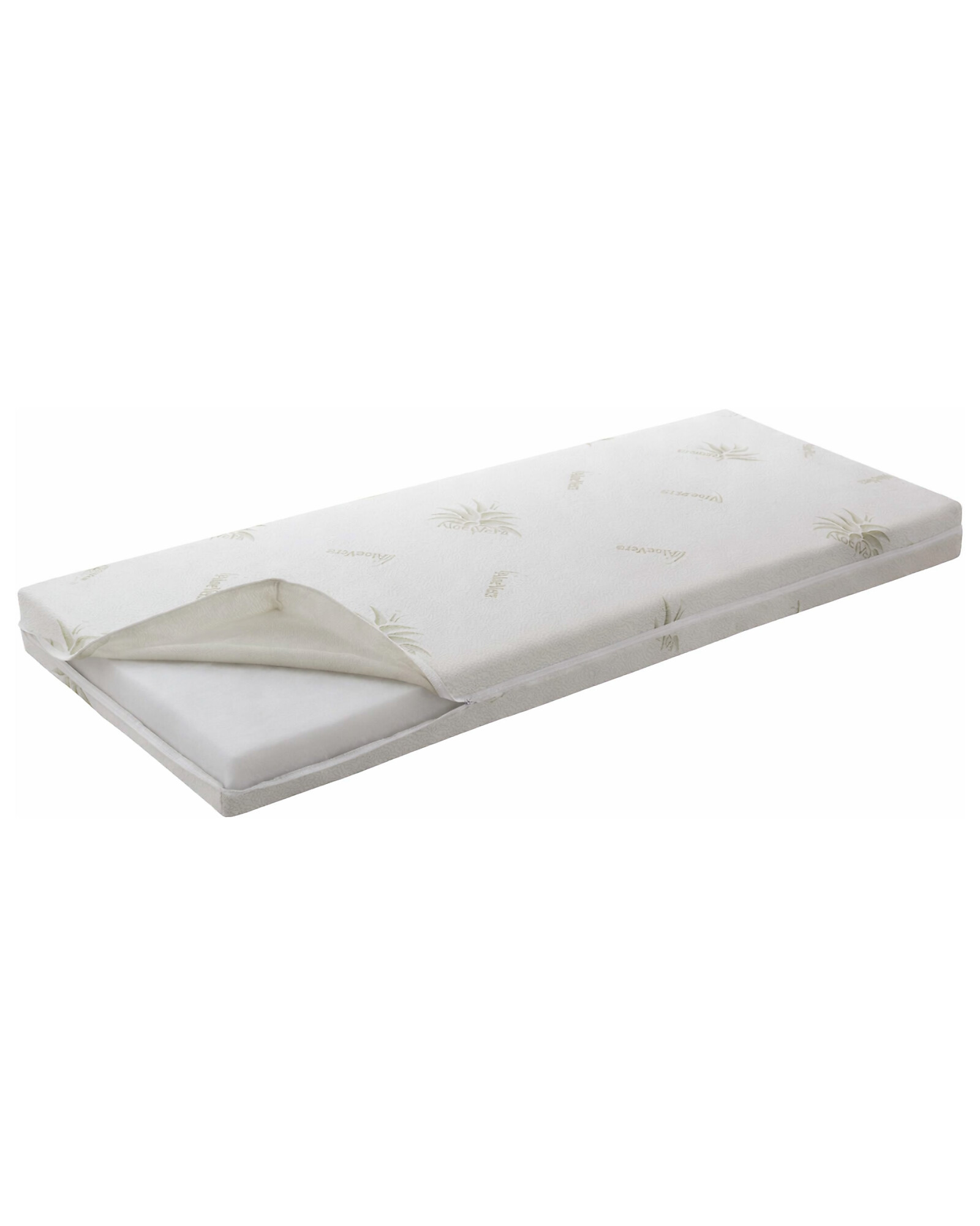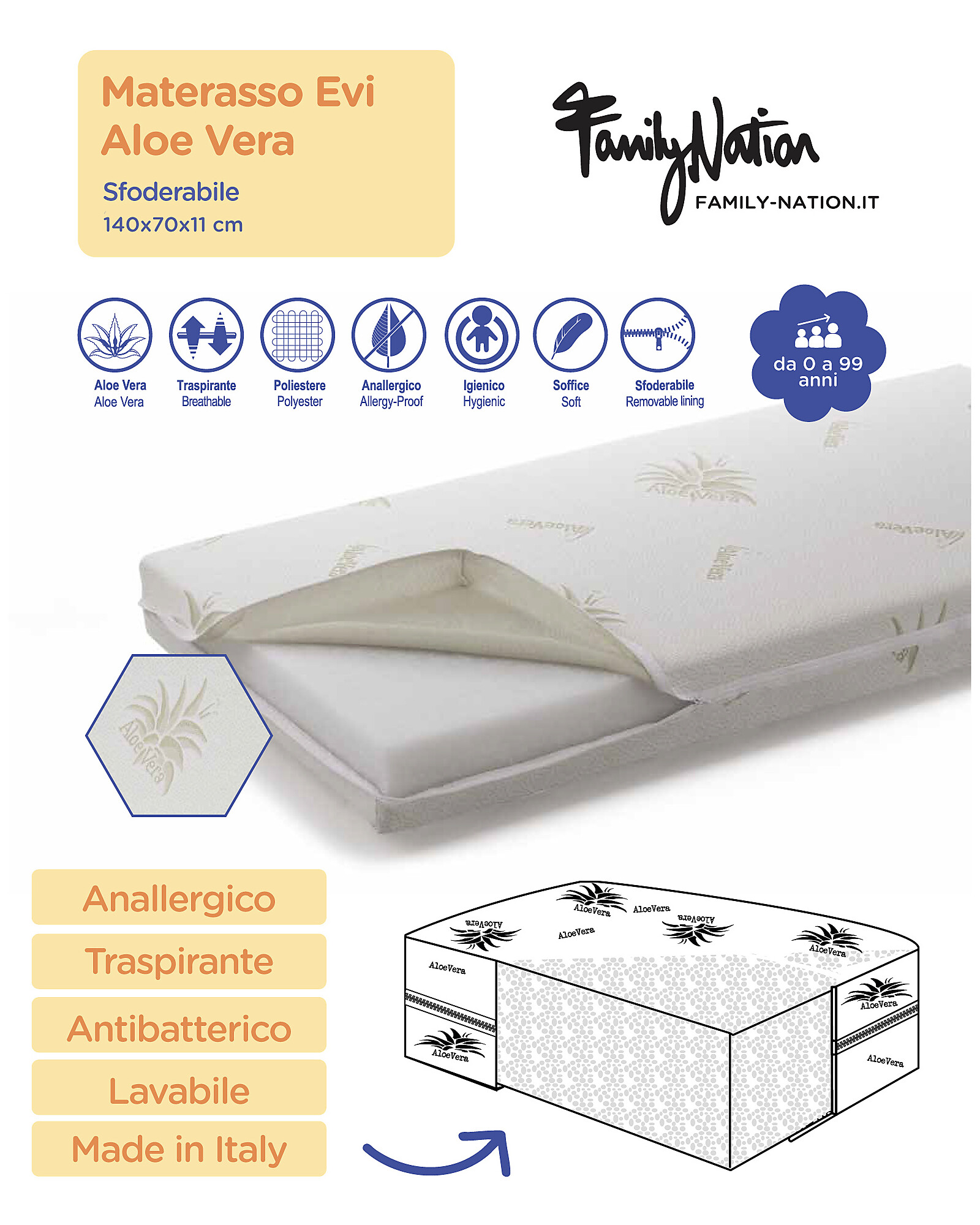 The Evi Mattress with Removable Cover - 140x70x11 cm - Aloe Vera is designed to ensure comfort, hygiene and safety in the long term. Made with high quality materials, it combines innovation and natural well-being thanks to the special treatment of Aloe Vera, a plant known for centuries for its beneficial properties.