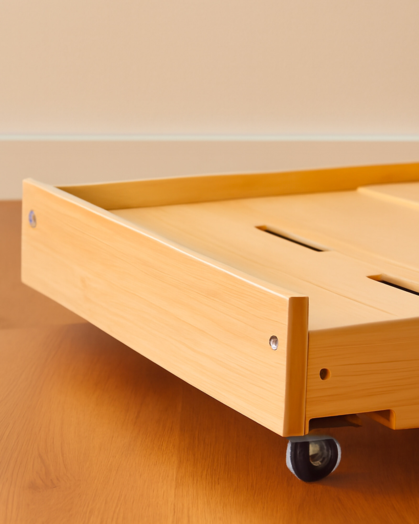 - To use the drawer as storage: install the dedicated perforated panels to create a closed yet ventilated space, place your items inside, and slide the drawer under the bed. Thanks to the wheels, movement is smooth and effortless.