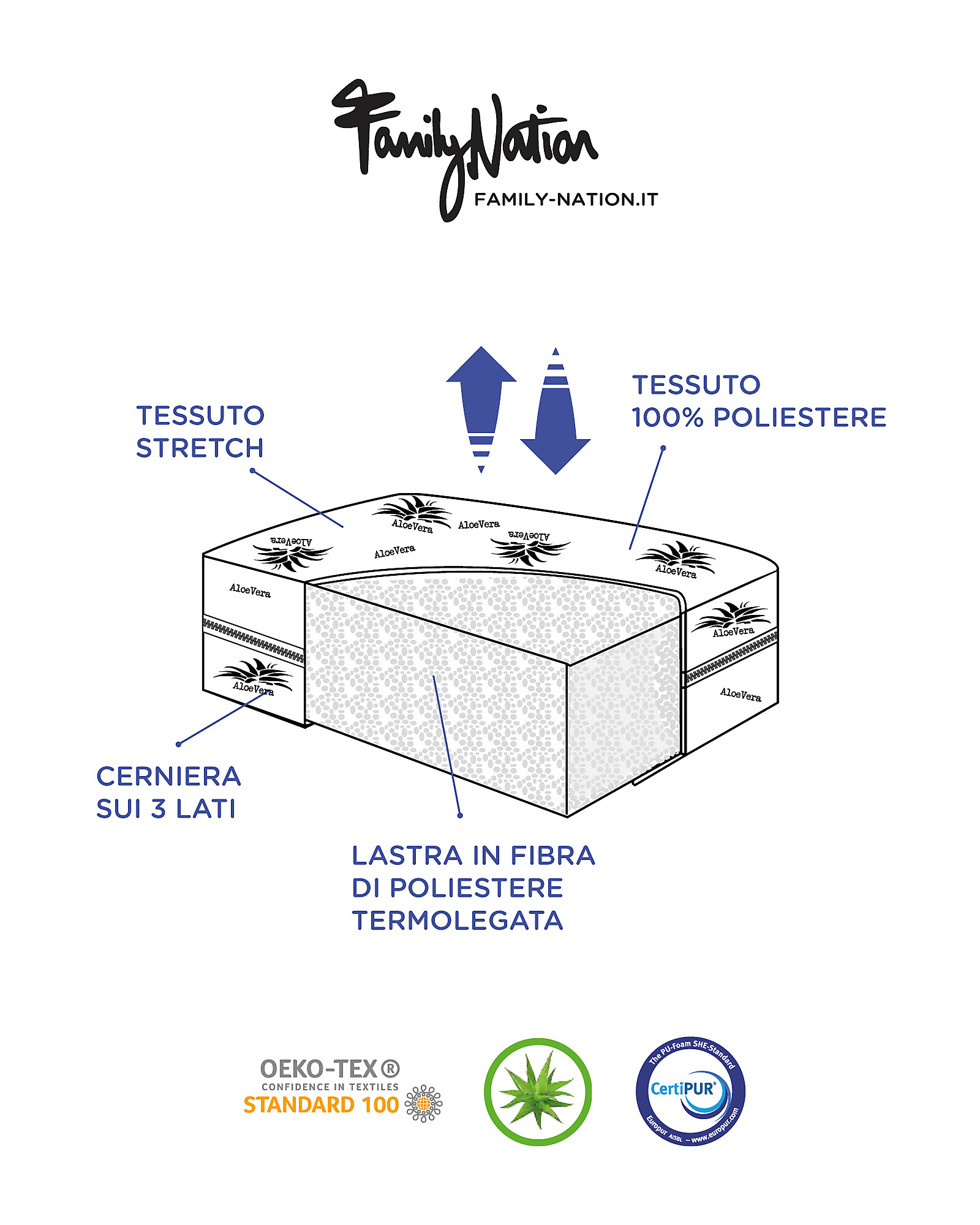 - External Cover: 100% polyester stretch fabric treated with Aloe Vera