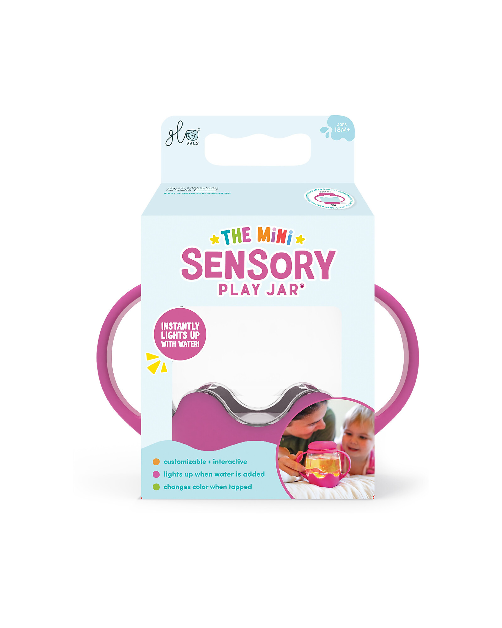The Sensory Play Jar Glo Pals beloved by fans, now in MINI version for little hands! From a playmate to calm down, to a travel companion or pajama party buddy, this jar is designed to go wherever your playtime takes you. Add tap water and watch the jar automatically light up, glow, and cycle through 9 soothing colors. Little ones can touch to change the color, and the spill-proof lid makes it perfect for playing at home or on the go.