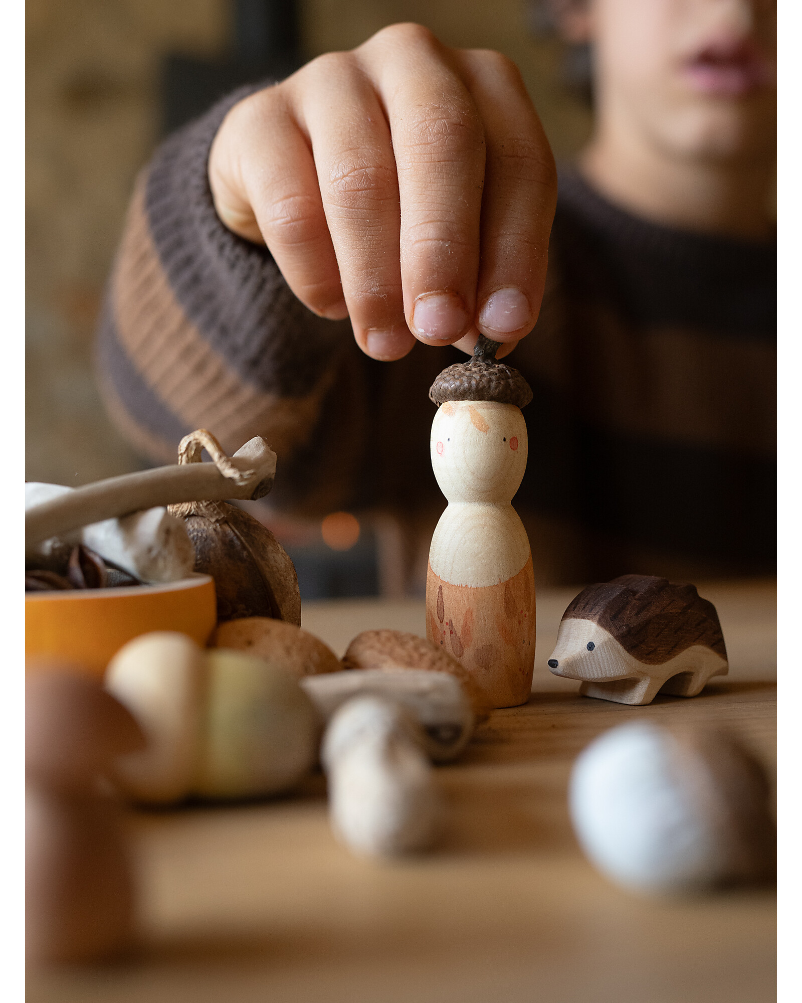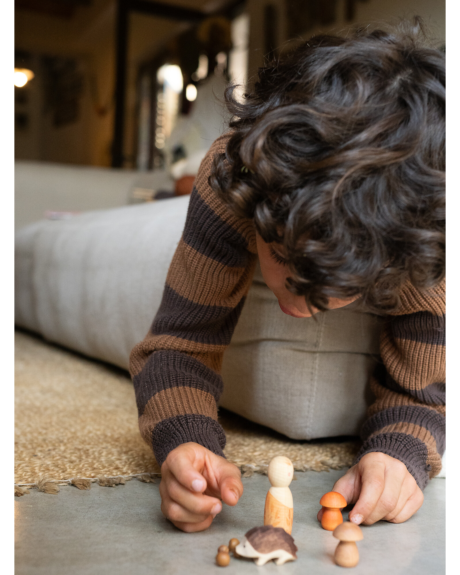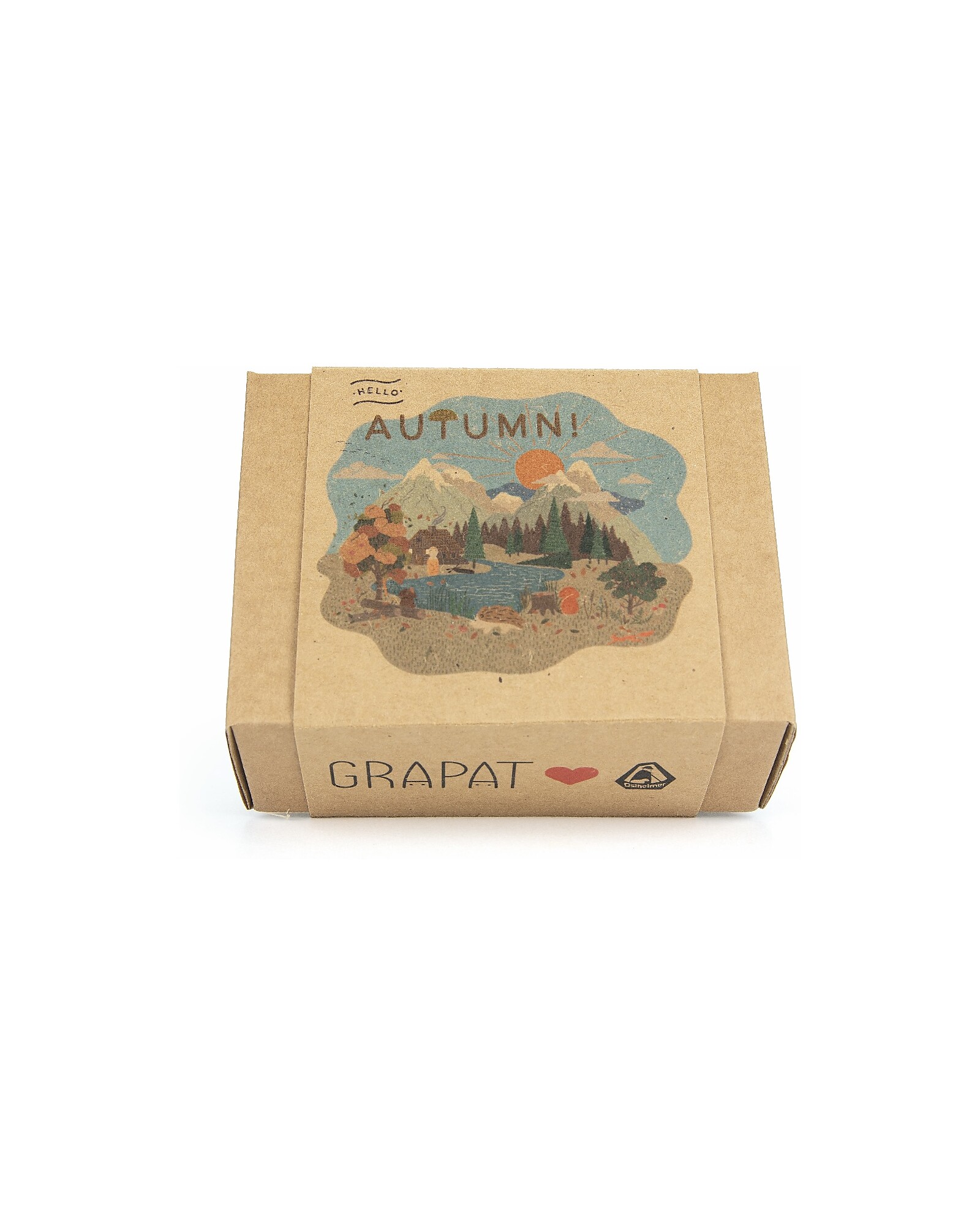 Grapat – Hello Autumn is a set that captures the magic of autumn. Inside, you'll find wooden figures designed to stimulate free play, imagination, and children's curiosity. With this set, little ones can create enchanted worlds, invent autumn stories, and play with the warm shades of brown, ochre, orange, and green – the most beautiful colors of this season. Each piece is handmade, smoothed, and treated with natural dyes, delicate to the touch. Hello Autumn is the game that celebrates the change of seasons, a gift that brings together nature and authenticity.