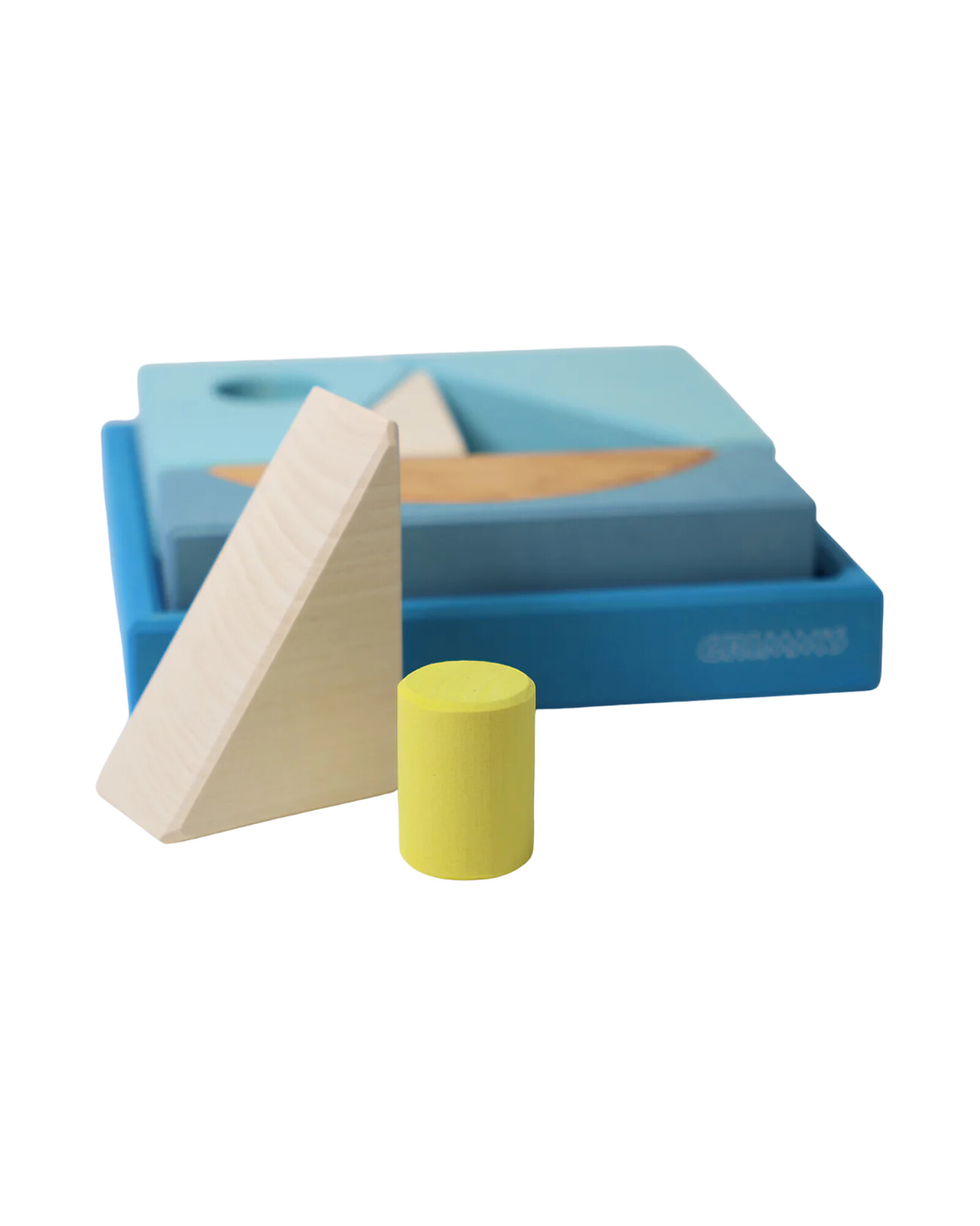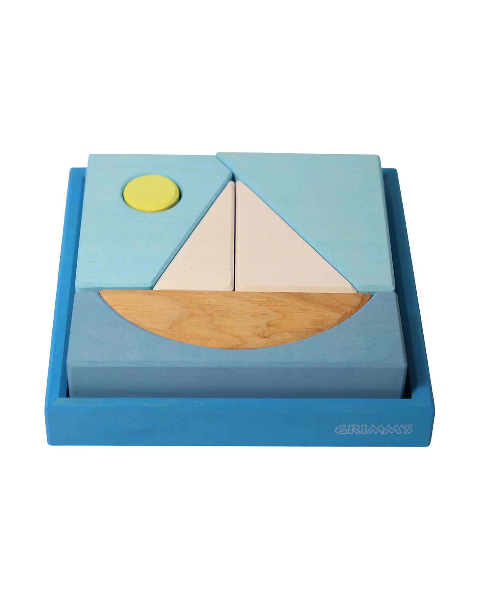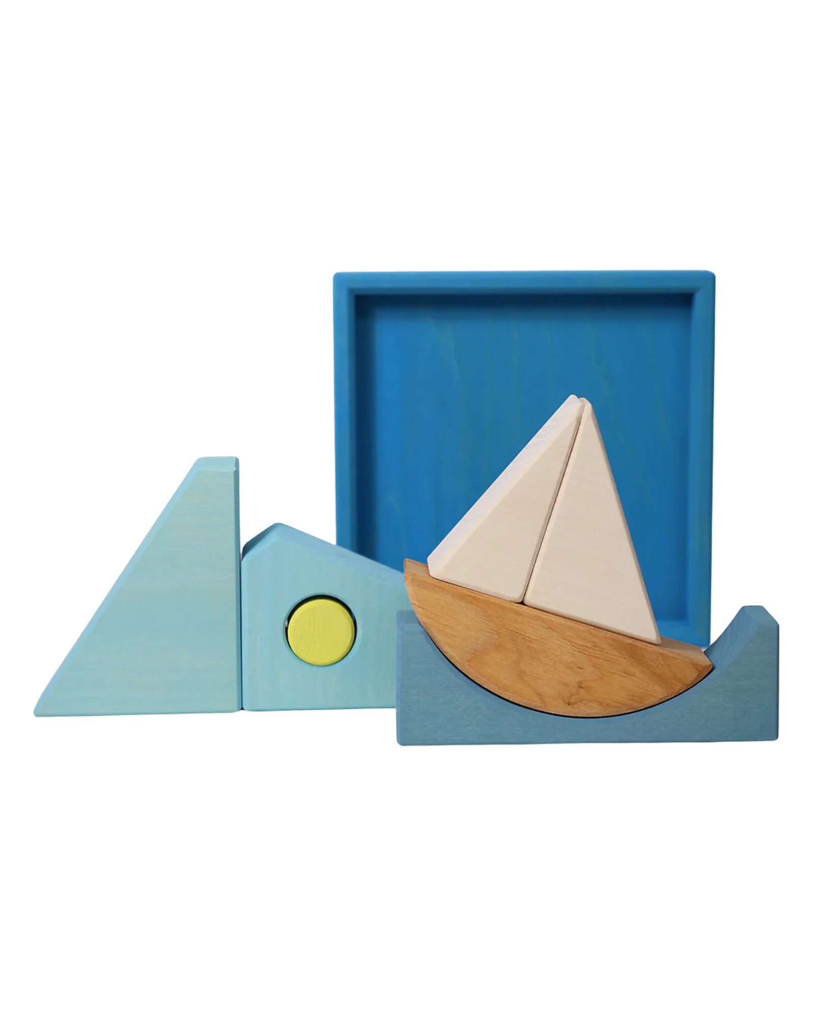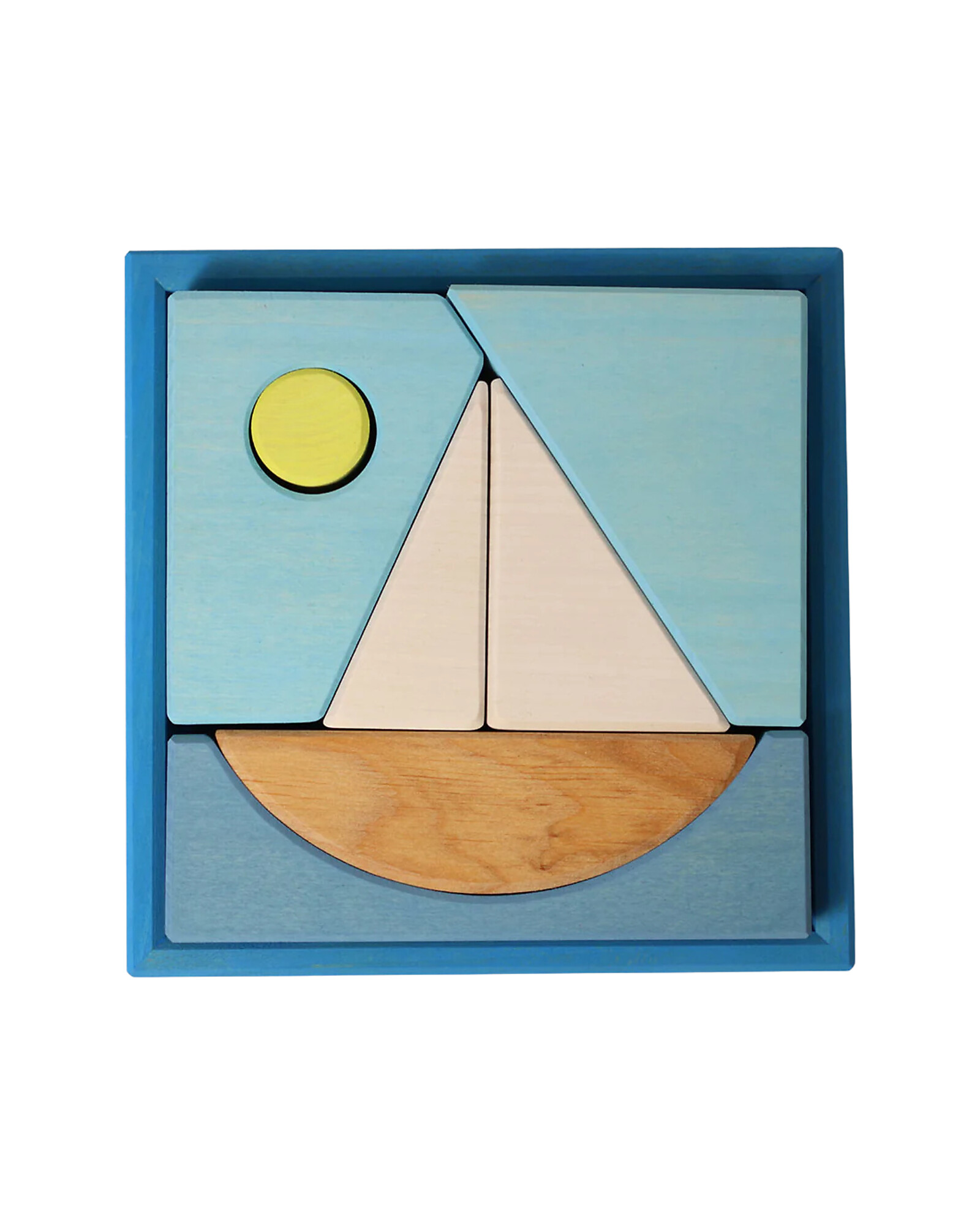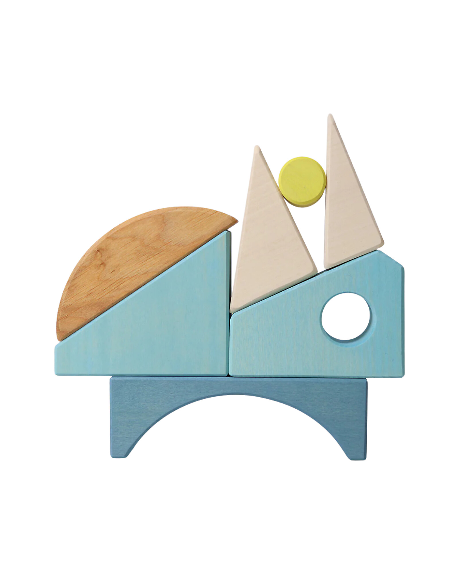 Carried by gentle waves, the sailing boat glides across the calm blue sea. Outside the frame, the geometric blocks transform into imaginative animal shapes.