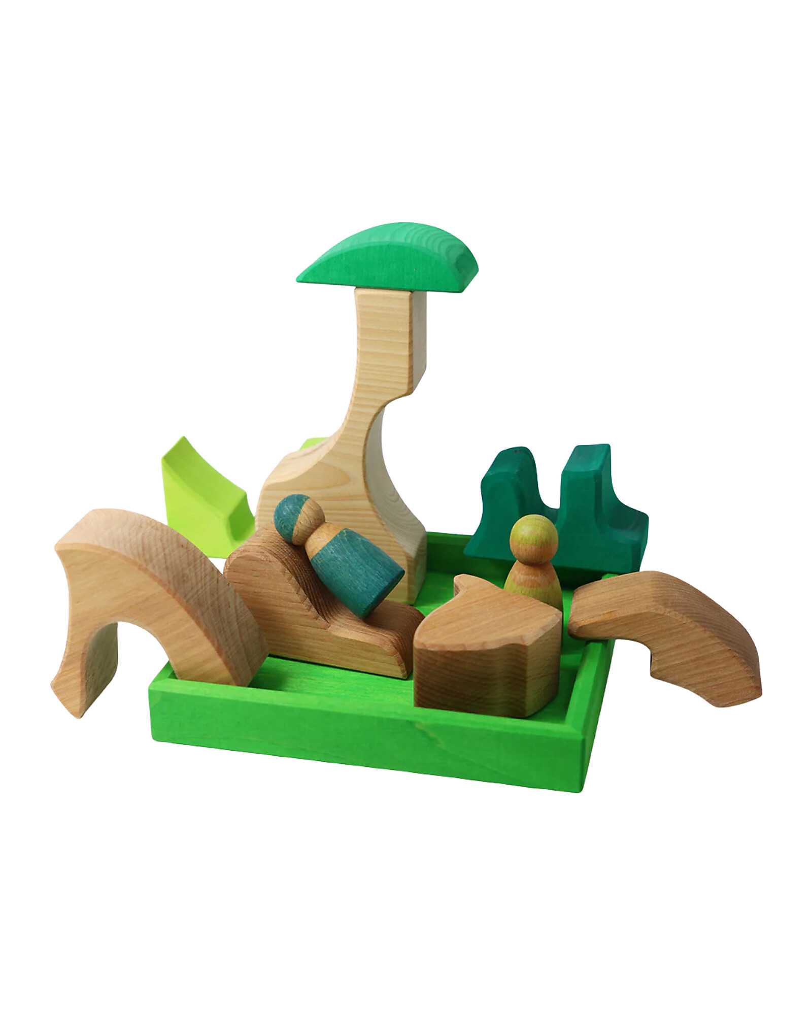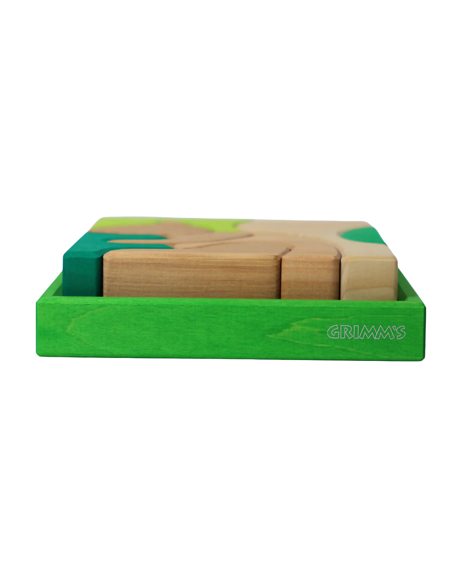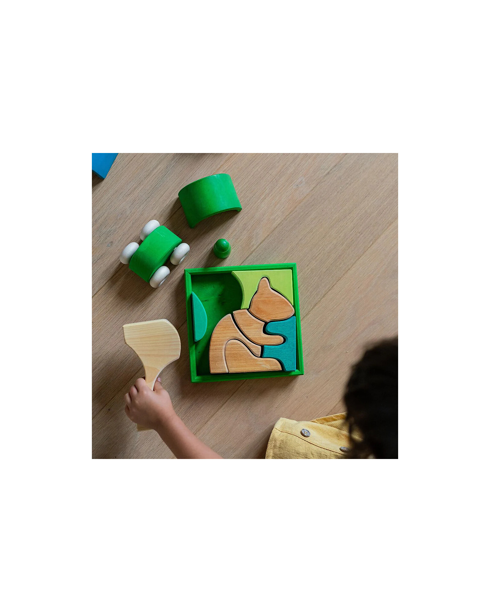 The Green Building Set is perfect for small hands thanks to its large pieces. The color shades provide a first introduction to primary and secondary colours, inviting children to explore their combinations and effects. Surrounded by the lush green of the leaves, the squirrel feels safe and protected. Outside the frame, the different building blocks transform into Jurassic landscapes filled with dinosaurs.
