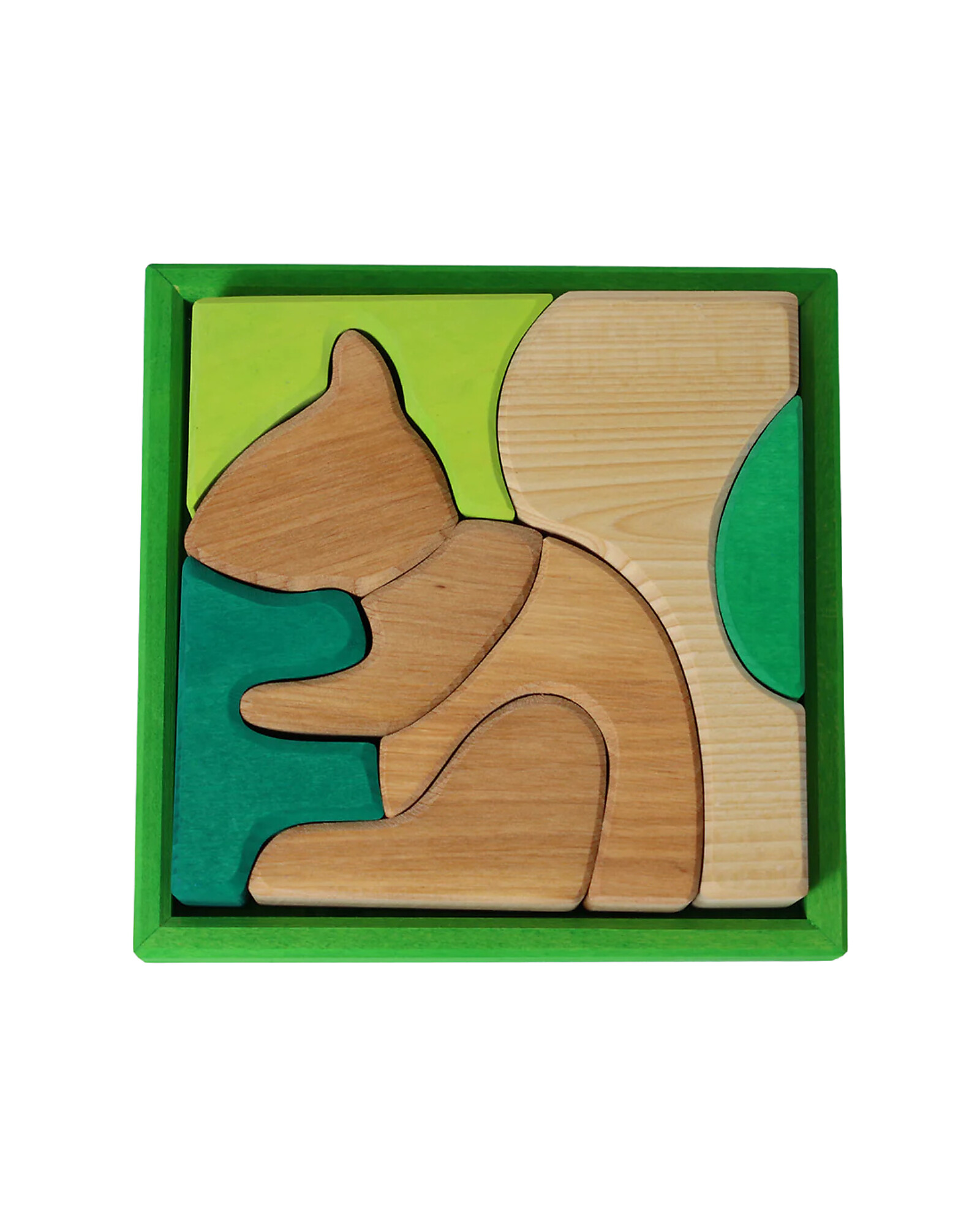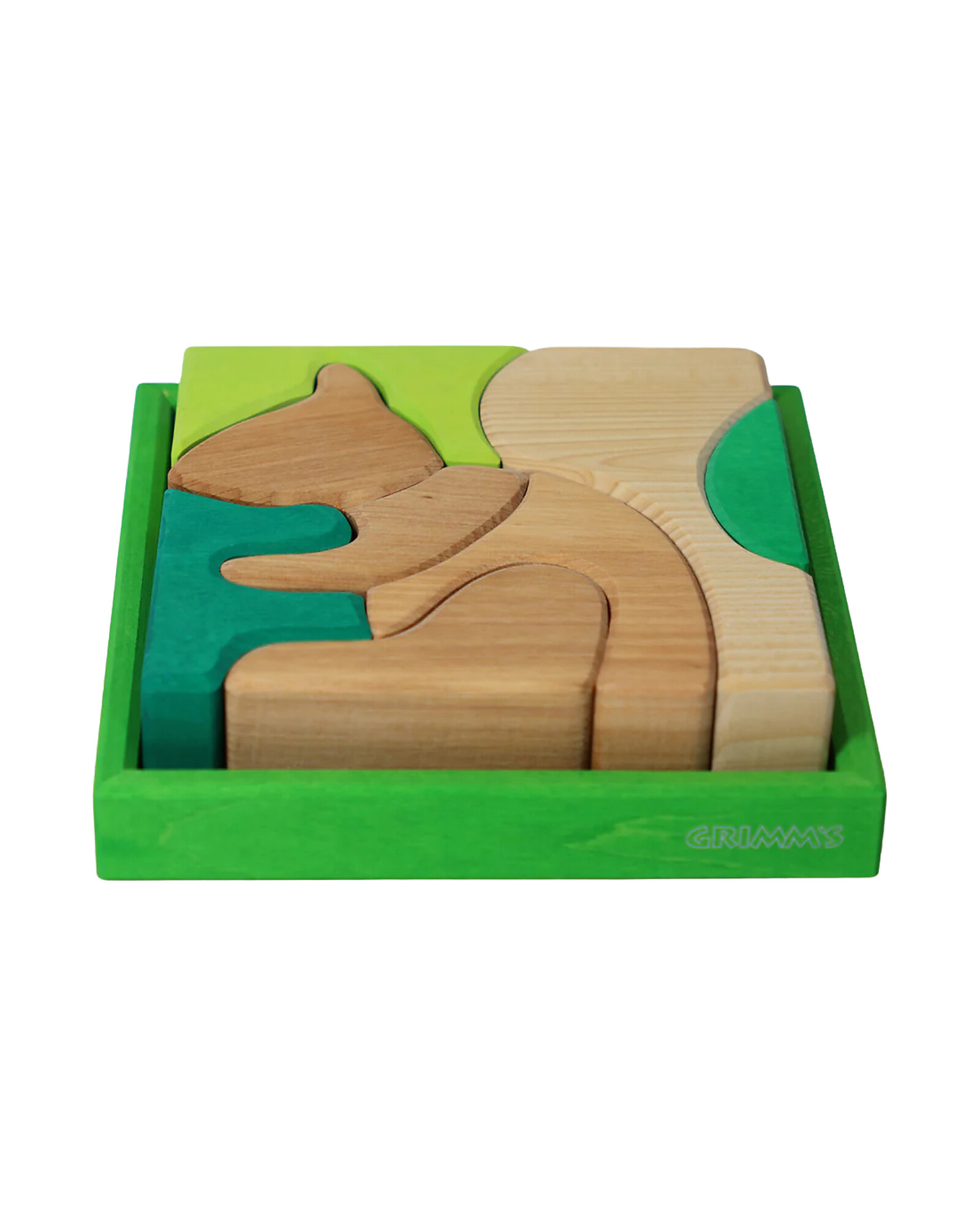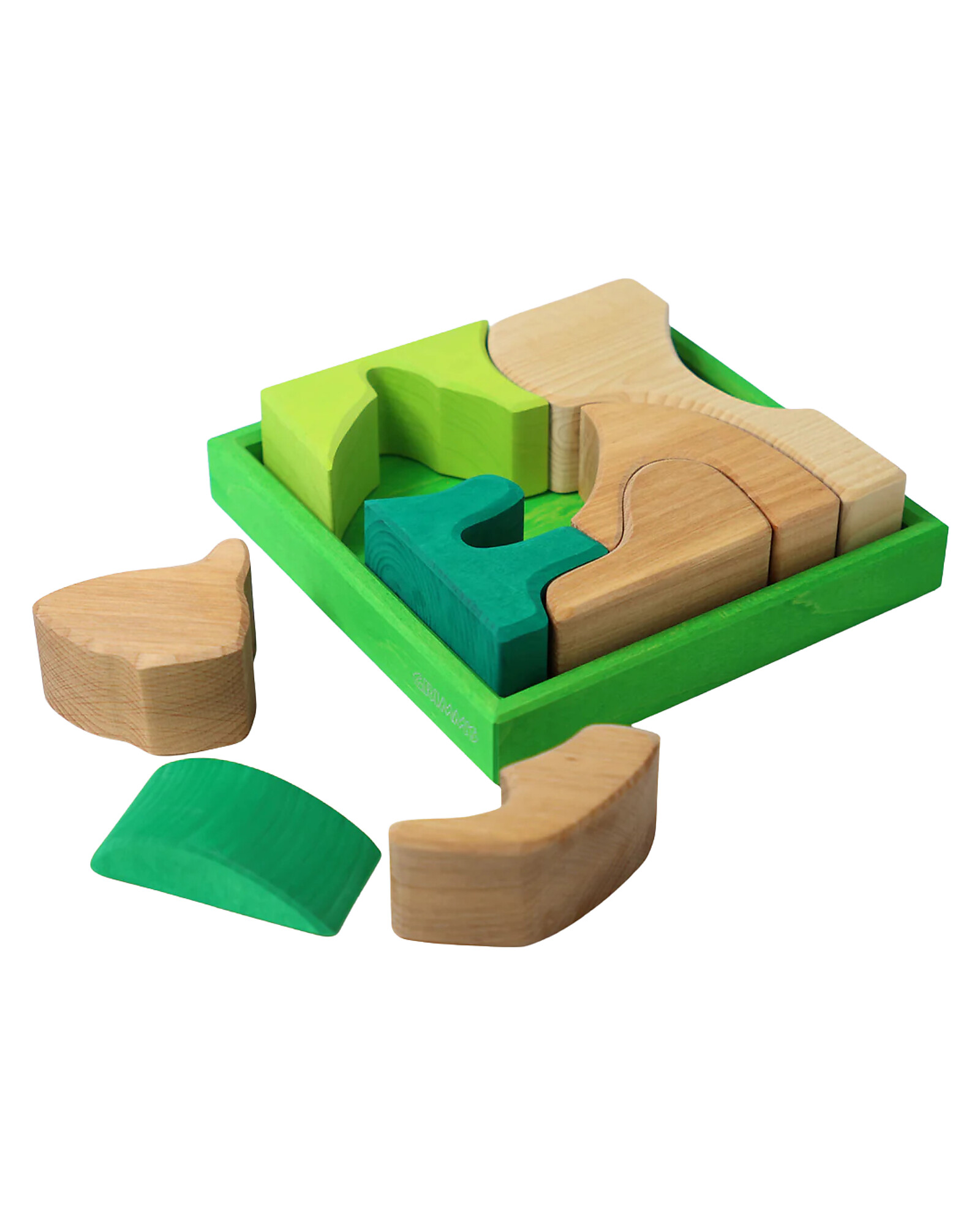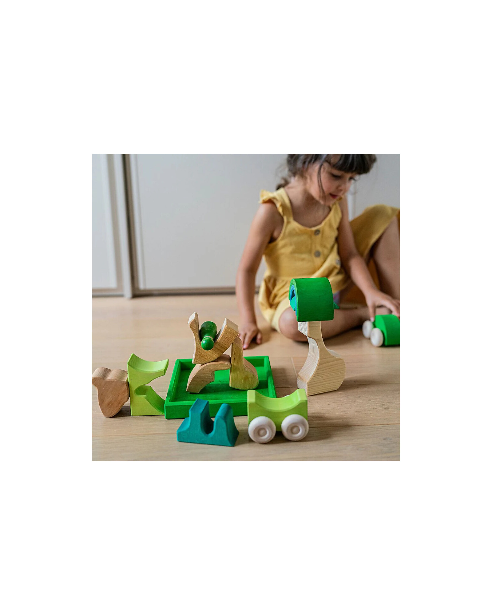 The Green Building Set is perfect for small hands thanks to its large pieces. The color shades provide a first introduction to primary and secondary colours, inviting children to explore their combinations and effects. Surrounded by the lush green of the leaves, the squirrel feels safe and protected. Outside the frame, the different building blocks transform into Jurassic landscapes filled with dinosaurs.