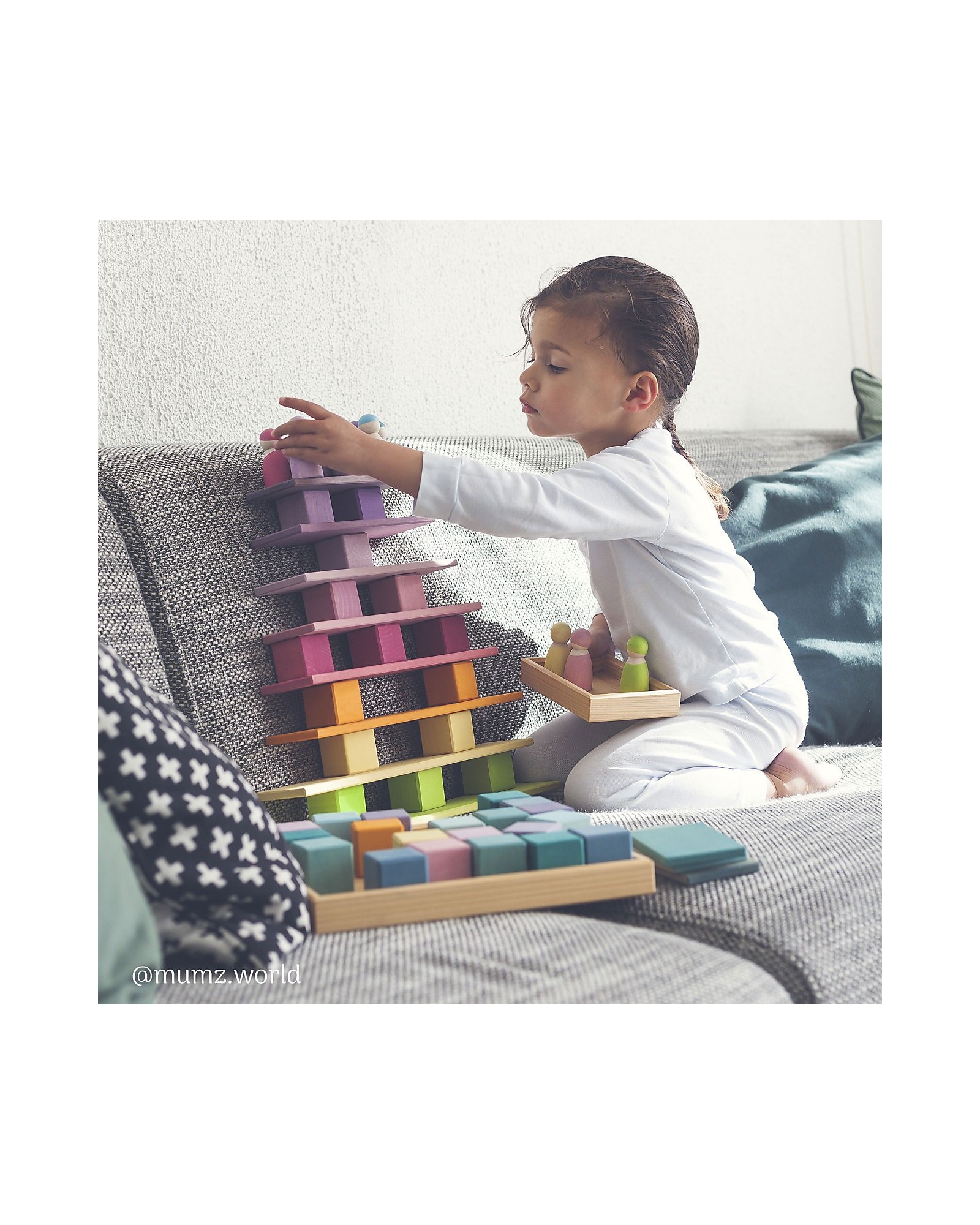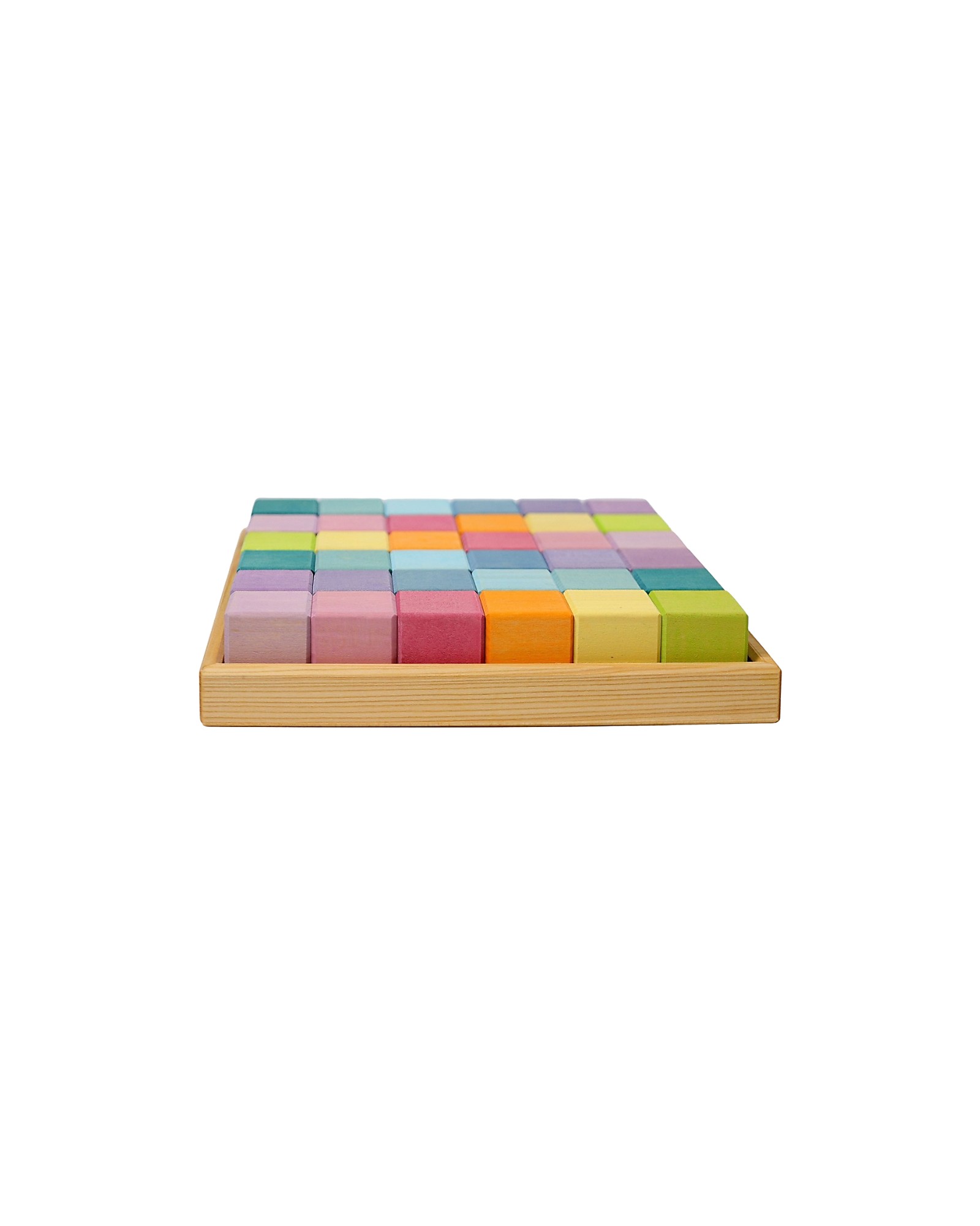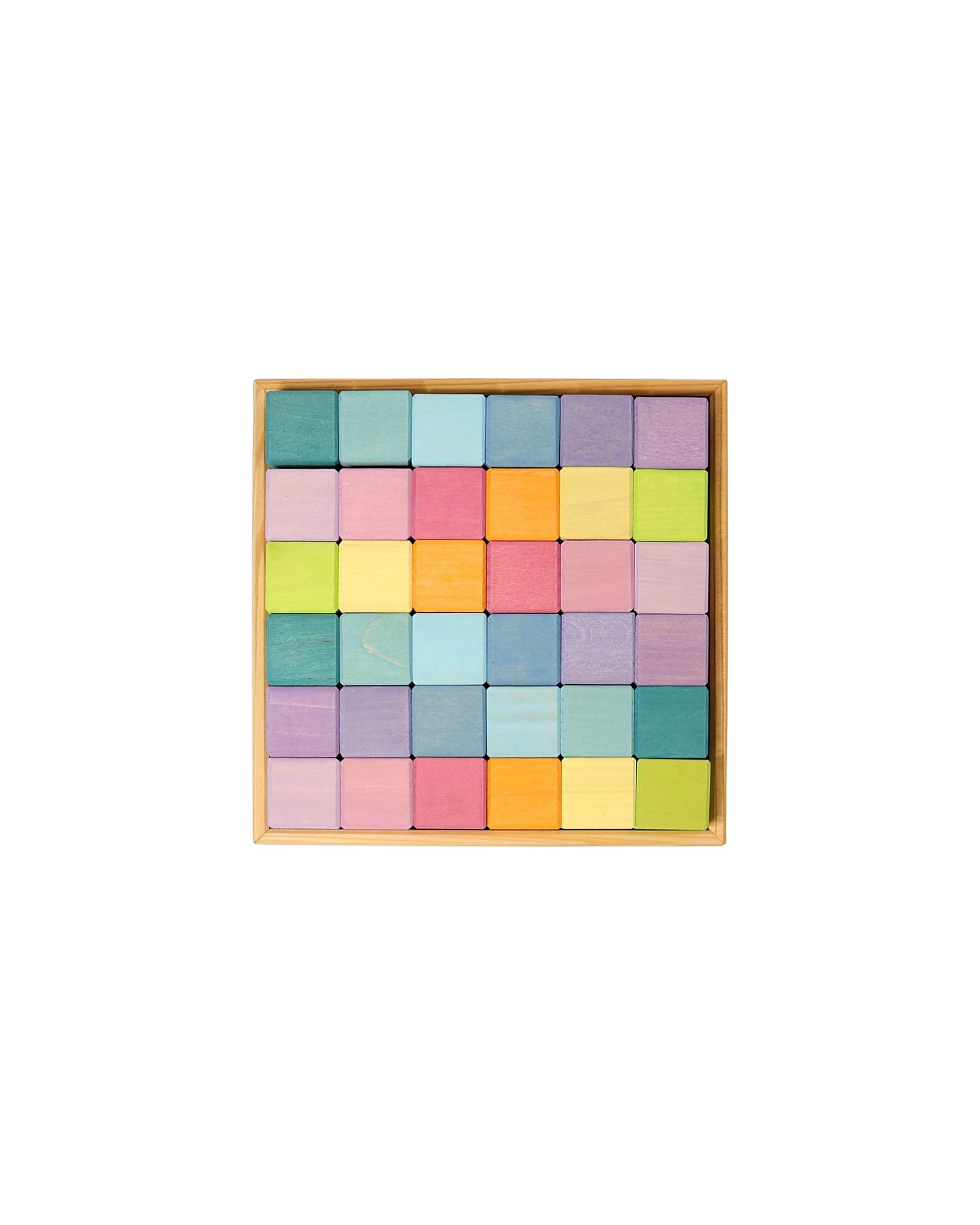 Grimm's Wooden Bricks Mosaic Game Set, a very fun game, the elementary cubic shape of these blocks will inspire children to build simple walls, foundations, fences, houses, towers or castles, the set consists of 36 pastel-colored bricks. This game is recommended by Spiel Gut (toy guide). When the game is over, just put them back in the container frame so as not to lose even a brick and to keep the bedroom in order with joy. Made of FSC certified wood from sustainable forests, this toy is colored with 100% safe non-toxic dyes that let the grain of the wood show through, a beautiful detail created by nature that makes each piece unique!
