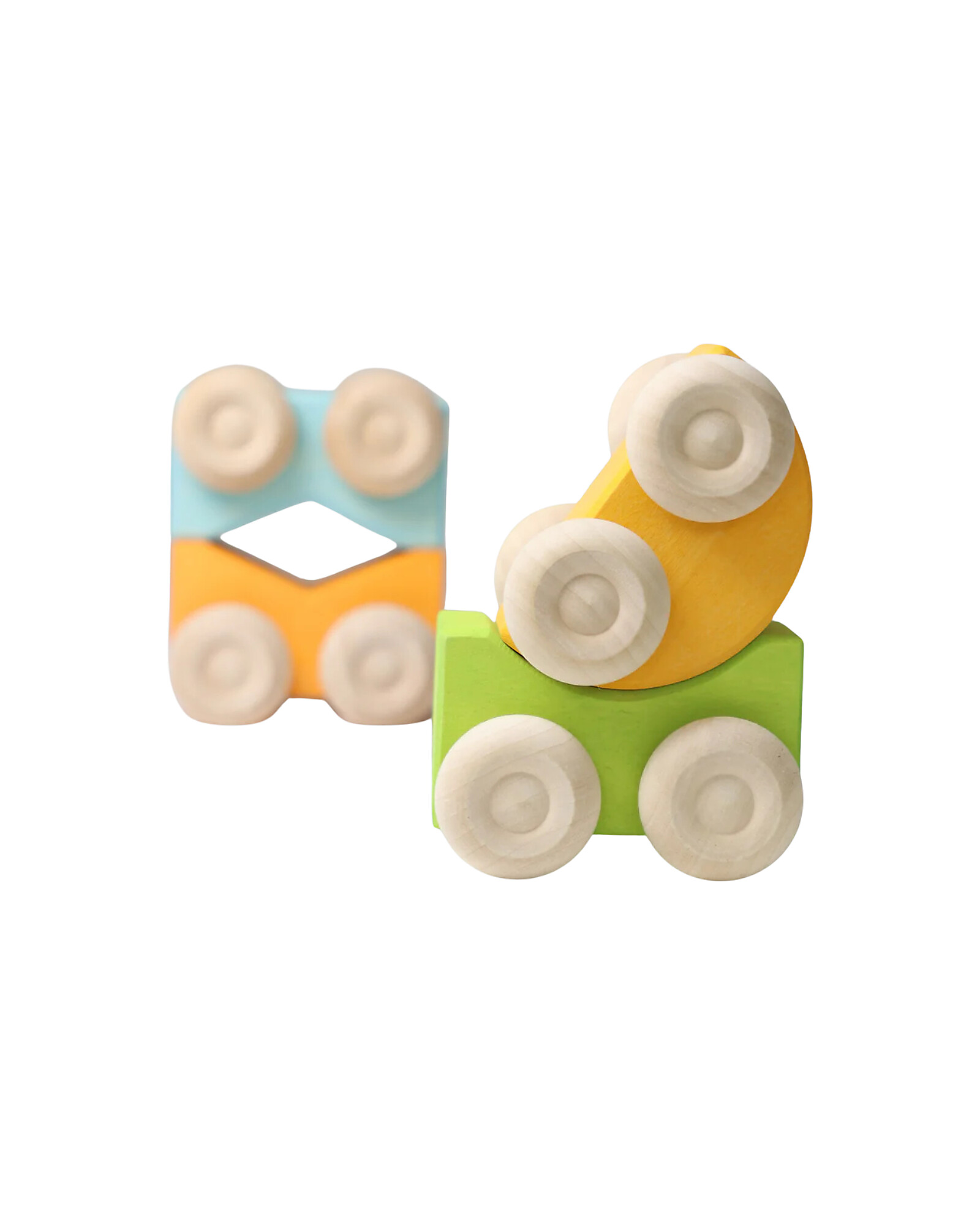 Our Stacking Cars are much more than simple toys: they are an invitation to experience adventure with imagination. Each car can stack with the others, creating spectacular moving towers, or speed along on any surface thanks to its smooth wheels. Children can also build on top, turning them into unique, personalized vehicles. The vivid colors and varied shapes naturally teach color harmony and the concept of matching shapes. Made of color-glazed lime wood with maple-wood wheels, they offer a warm, authentic feel to the touch. A simple toy, yet full of magic and creative potential.