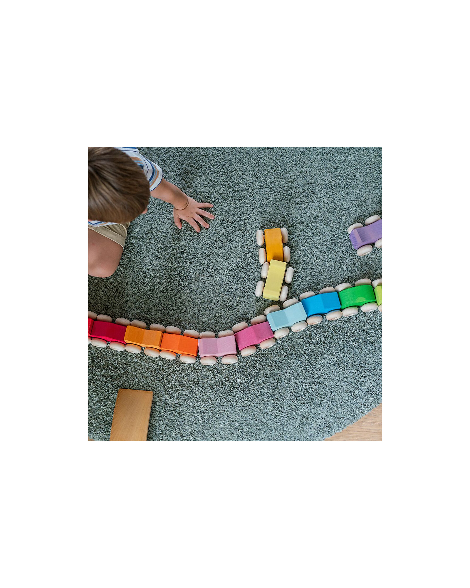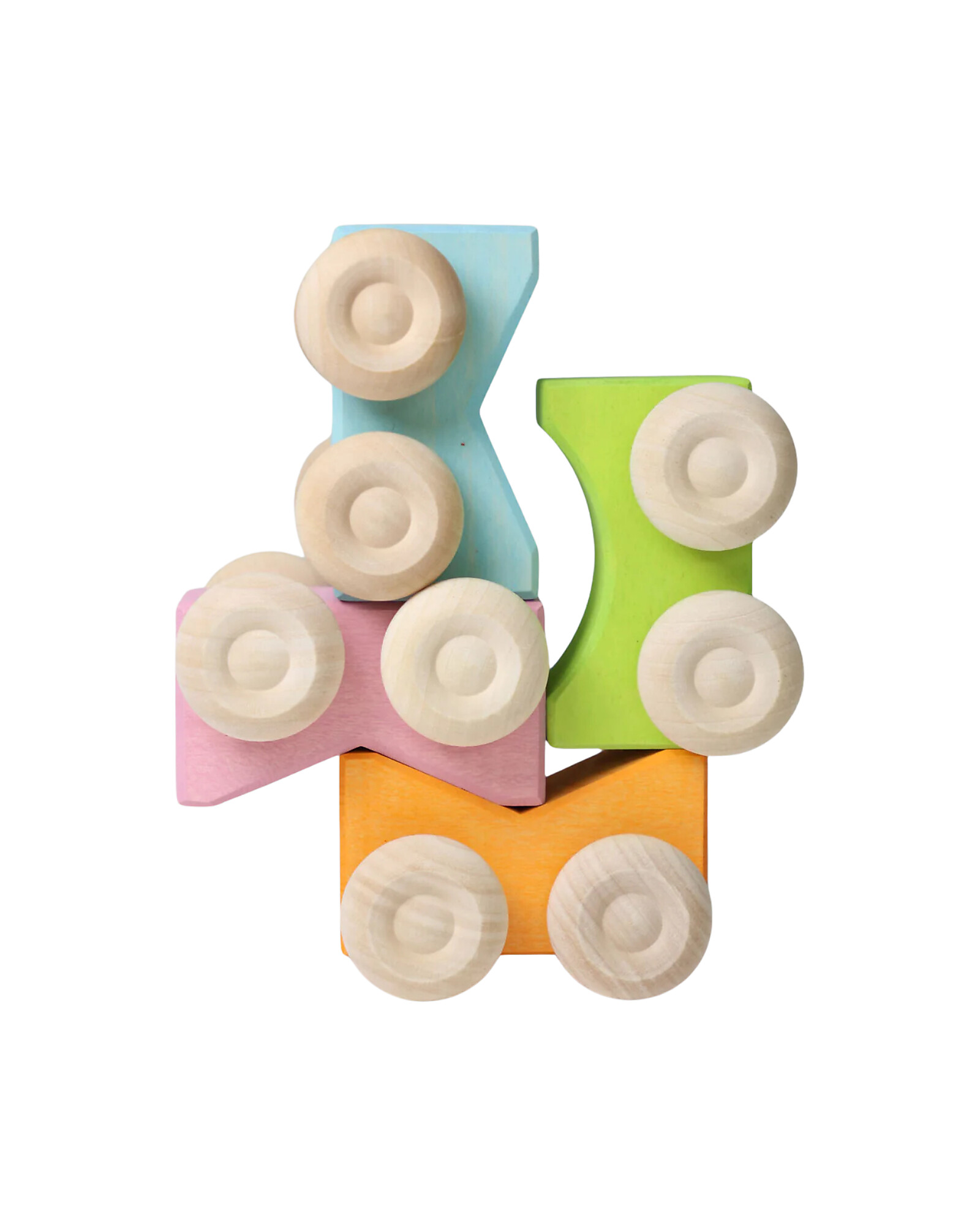Our Stacking Cars are much more than simple toys: they are an invitation to experience adventure with imagination. Each car can stack with the others, creating spectacular moving towers, or speed along on any surface thanks to its smooth wheels. Children can also build on top, turning them into unique, personalized vehicles. The vivid colors and varied shapes naturally teach color harmony and the concept of matching shapes. Made of color-glazed lime wood with maple-wood wheels, they offer a warm, authentic feel to the touch. A simple toy, yet full of magic and creative potential.